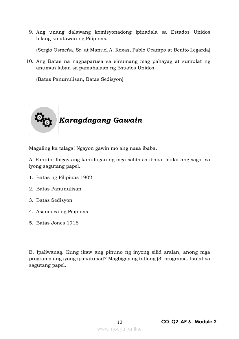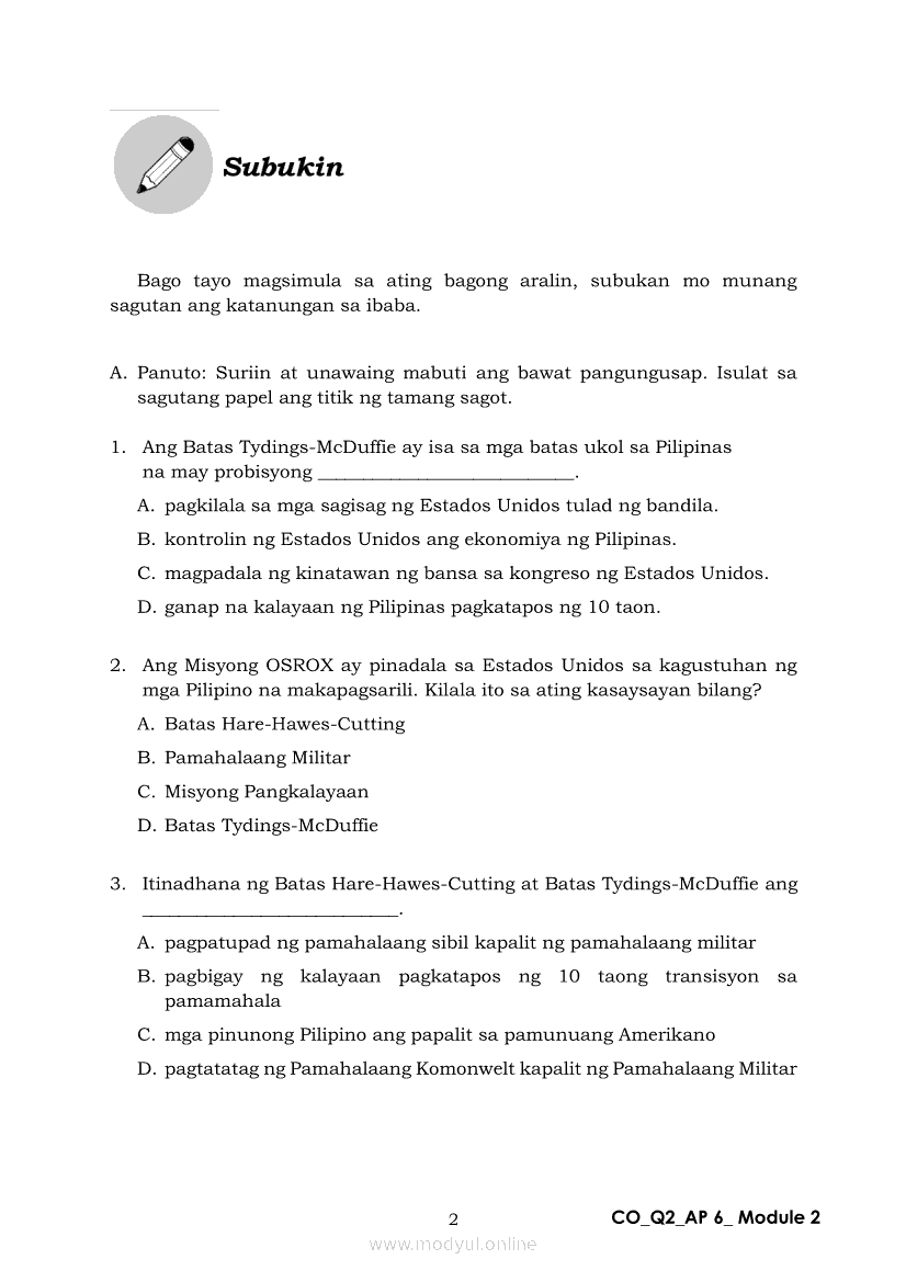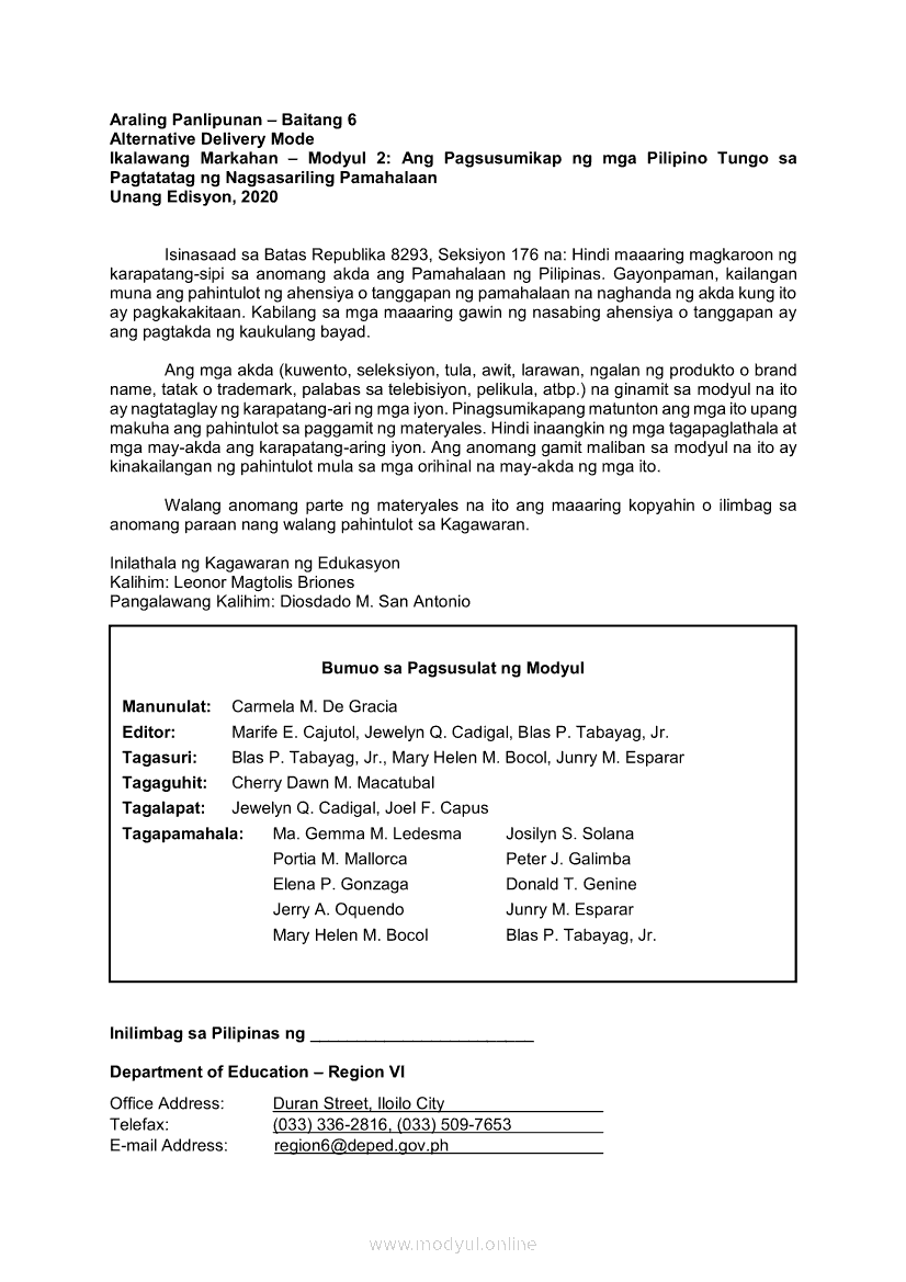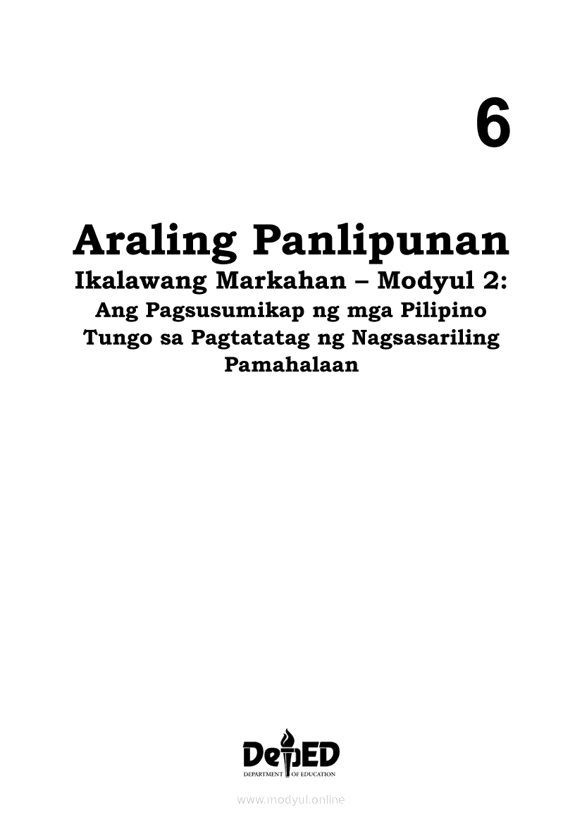 Araling Panlipunan 6 Ikalawang Markahan – Modyul 2: Ang Pagsusumikap ng mga Pilipino Tungo sa Pagtatatag ng Nagsasariling PamahalaanApr 22, 2021 Grade 6Kiumo M901 Tablet for Kids — comprehensive protection in learning, safety, and entertainment for as low as **₱2,399!. Araling Panlipunan 6RelatedAraling Panlipunan Ikaapat na Markahan – Modyul 7: Kontemporaryong Isyu ng Lipunan Tungo sa Pagtugon sa mga Hamon ng Malaya at Maunlad na BansaAraling Panlipunan Ikaapat na Markahan – Modyul 1: Mga Suliranin at Hamon sa Ilalim ng Batas MilitarAraling Panlipunan Ikaapat na Markahan – Modyul 6: Mga Pangunahing Suliranin at Hamong Kinaharap ng mga Pilipino mula 1986 hanggang sa kasalukuyanAraling Panlipunan Ikaapat na Markahan – Modyul 2: Reaksyon ng mga Pilipino sa Patakaran ng Batas MilitarAraling Panlipunan Ikaapat na Markahan – Modyul 5: Pagtatanggol at Pagpapanatili sa Demokratikong Pamamahala