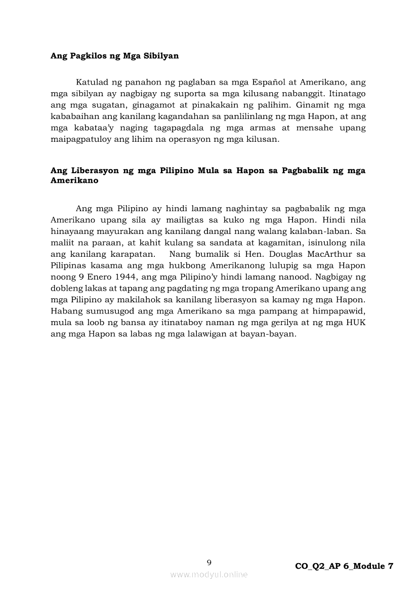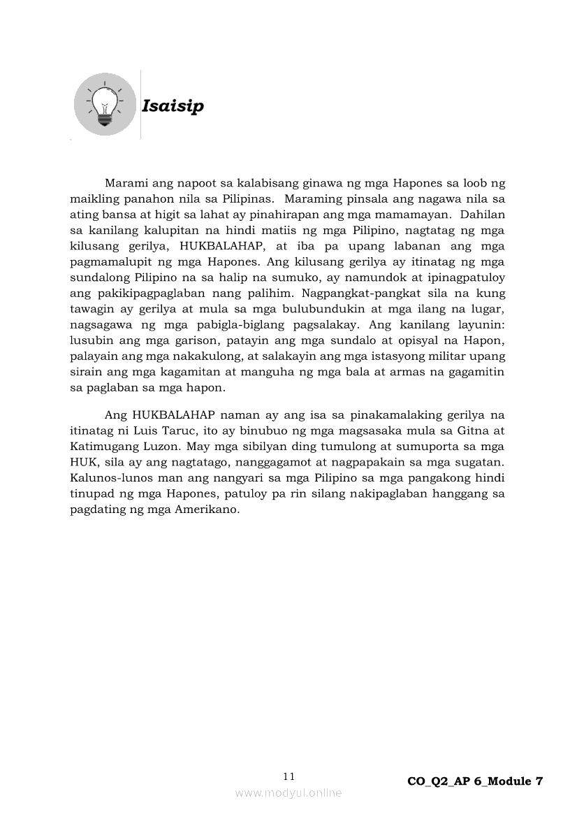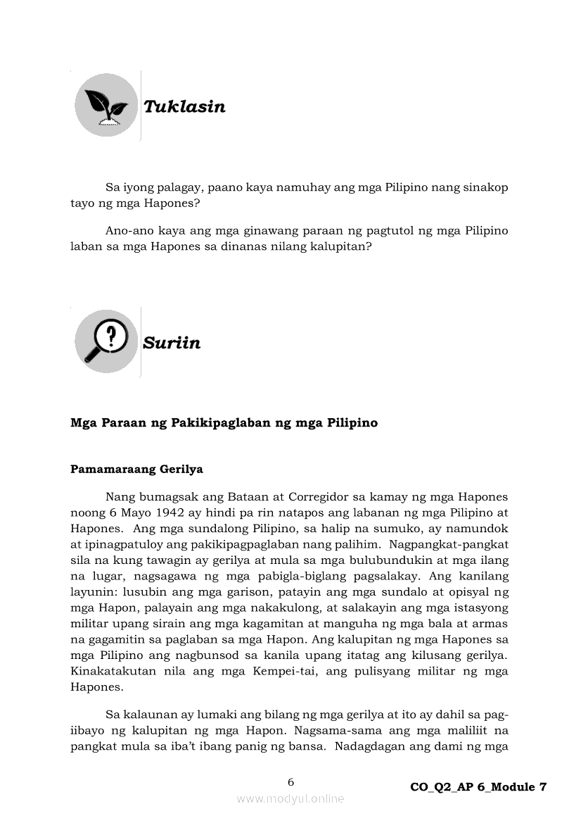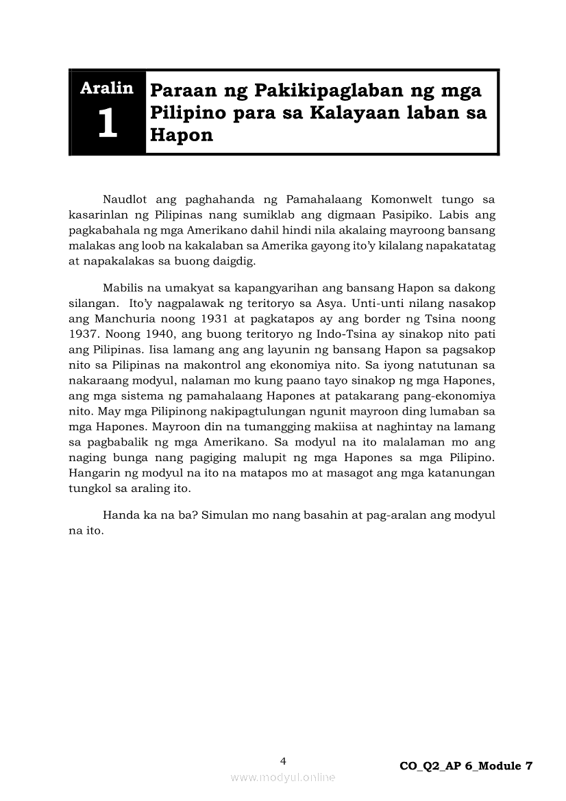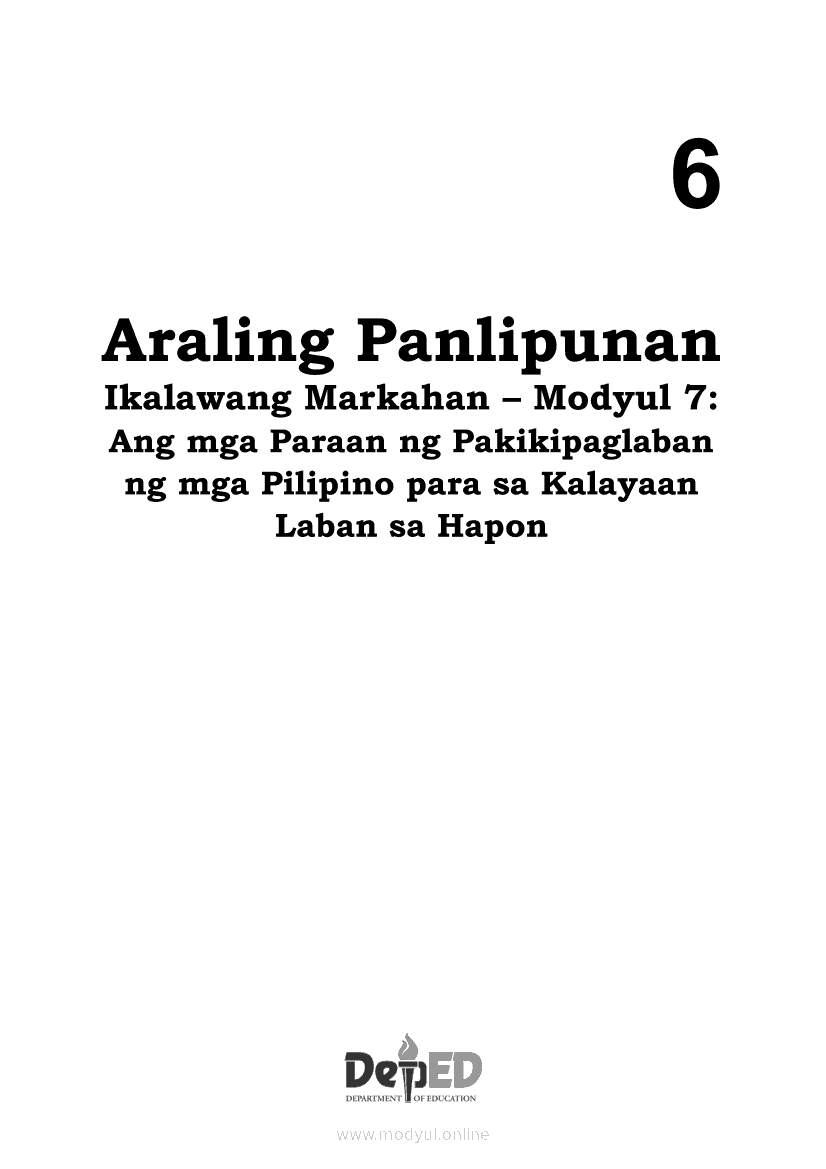 Araling Panlipunan 6 Ikalawang Markahan – Modyul 7: Ang mga Paraan ng Pakikipaglaban ng mga Pilipino para sa Kalayaan Laban sa HaponApr 22, 2021 Grade 6Kiumo M901 Tablet for Kids — comprehensive protection in learning, safety, and entertainment for as low as **₱2,399!. Araling Panlipunan 6RelatedAraling Panlipunan Ikaapat na Markahan – Modyul 4: Pagtatanggol at Pagpapanatili sa Karapatang PantaoAraling Panlipunan Ikaapat na Markahan – Modyul 3: Mga Pangyayaring Nagbigay-Daan sa People Power 1Araling Panlipunan Ikaapat na Markahan – Modyul 6: Mga Pangunahing Suliranin at Hamong Kinaharap ng mga Pilipino mula 1986 hanggang sa kasalukuyanAraling Panlipunan Ika-apat na Markahan – Modyul 8: Mga Gampanin ng Pamahalaan at Mamamayan sa Pagkamit ng Kaunlaran ng BansaAraling Panlipunan Ikaapat na Markahan – Modyul 5: Pagtatanggol at Pagpapanatili sa Demokratikong Pamamahala