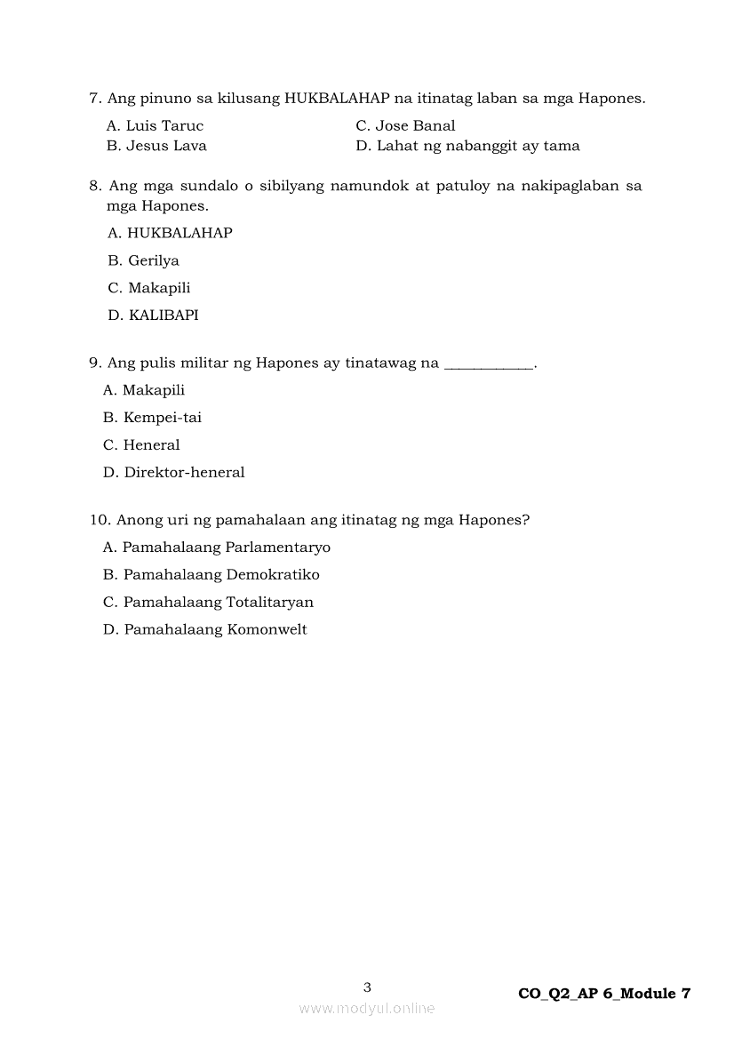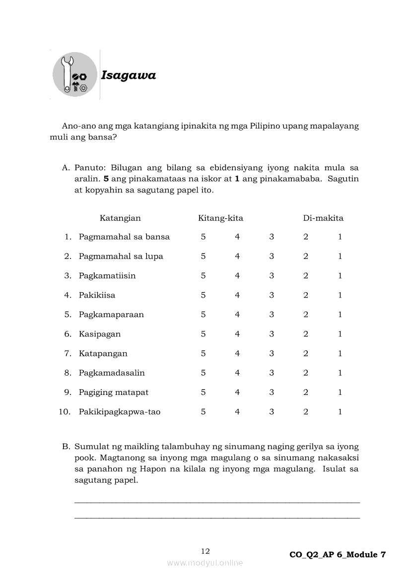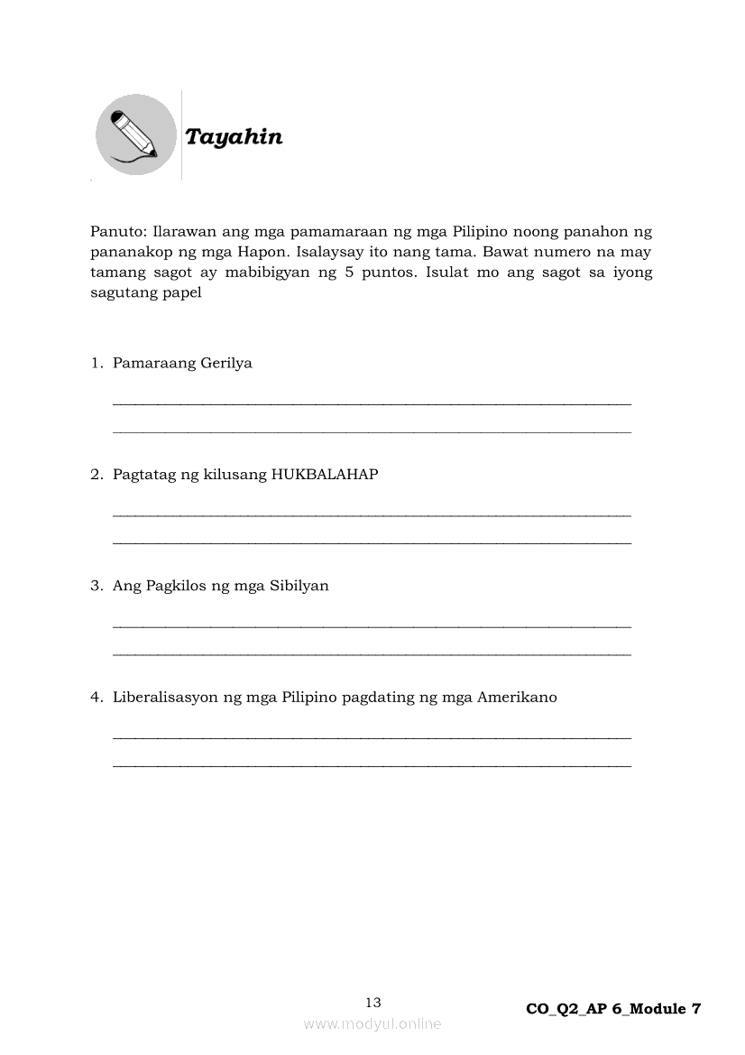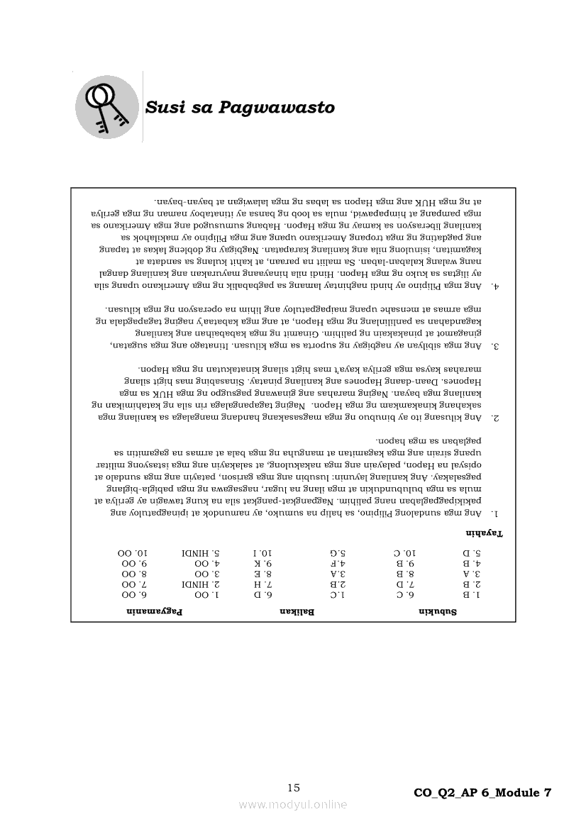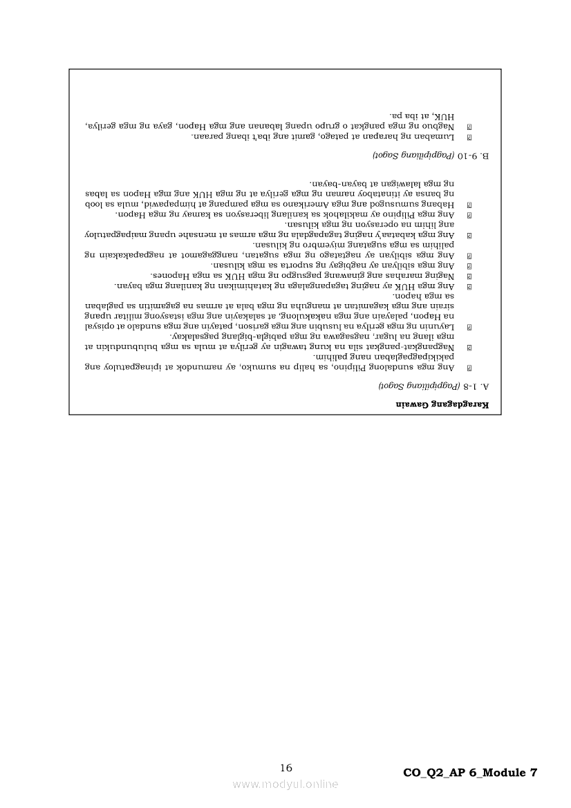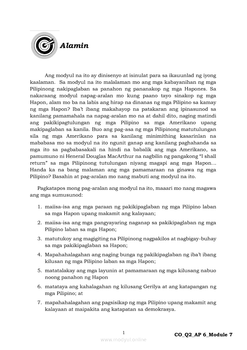 Araling Panlipunan 6 Ikalawang Markahan – Modyul 7: Ang mga Paraan ng Pakikipaglaban ng mga Pilipino para sa Kalayaan Laban sa HaponApr 22, 2021 Grade 6Kiumo M901 Tablet for Kids — comprehensive protection in learning, safety, and entertainment for as low as **₱2,399!. Araling Panlipunan 6RelatedAraling Panlipunan Ikaapat na Markahan – Modyul 4: Pagtatanggol at Pagpapanatili sa Karapatang PantaoAraling Panlipunan Ikaapat na Markahan – Modyul 3: Mga Pangyayaring Nagbigay-Daan sa People Power 1Araling Panlipunan Ikaapat na Markahan – Modyul 6: Mga Pangunahing Suliranin at Hamong Kinaharap ng mga Pilipino mula 1986 hanggang sa kasalukuyanAraling Panlipunan Ika-apat na Markahan – Modyul 8: Mga Gampanin ng Pamahalaan at Mamamayan sa Pagkamit ng Kaunlaran ng BansaAraling Panlipunan Ikaapat na Markahan – Modyul 5: Pagtatanggol at Pagpapanatili sa Demokratikong Pamamahala