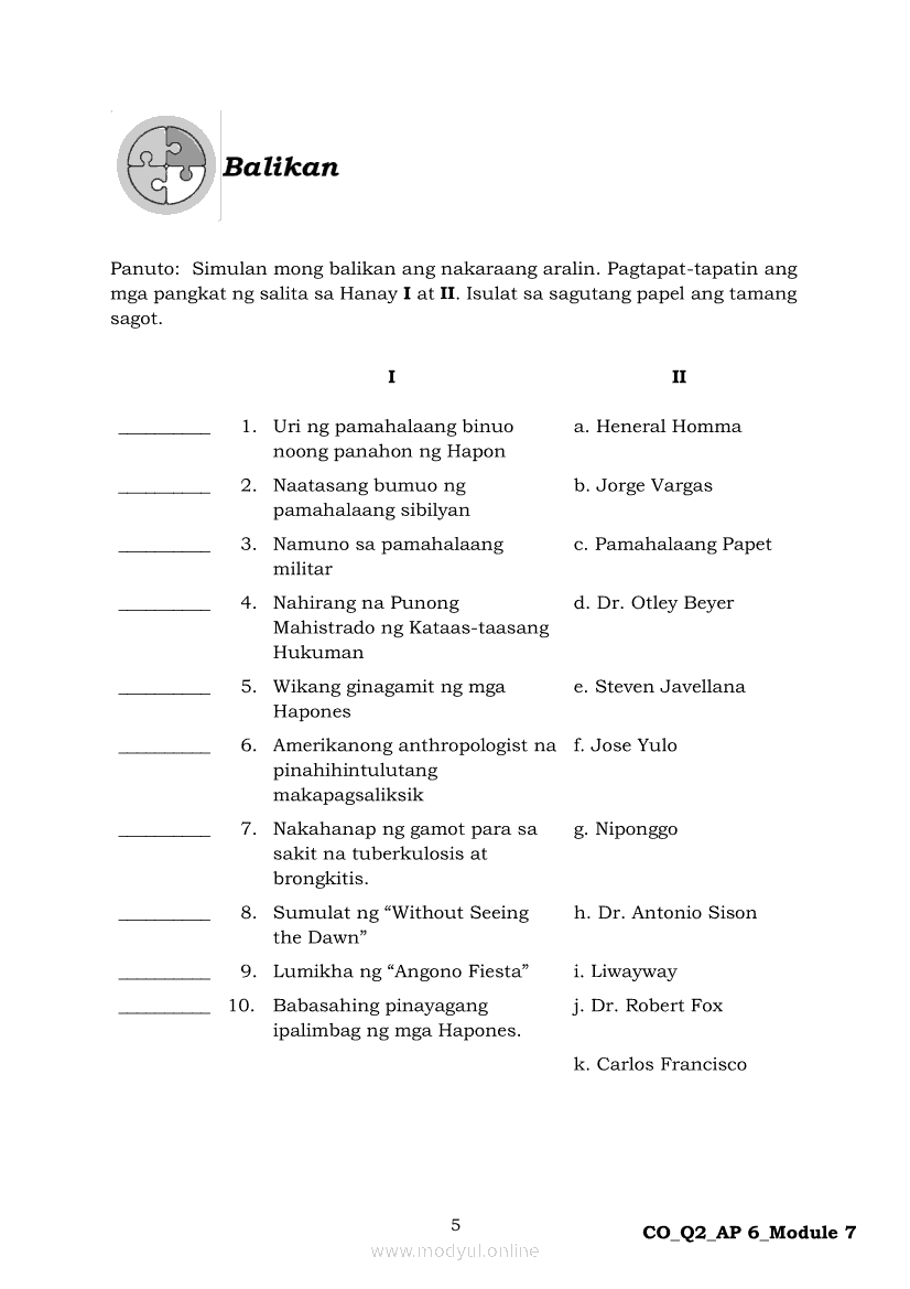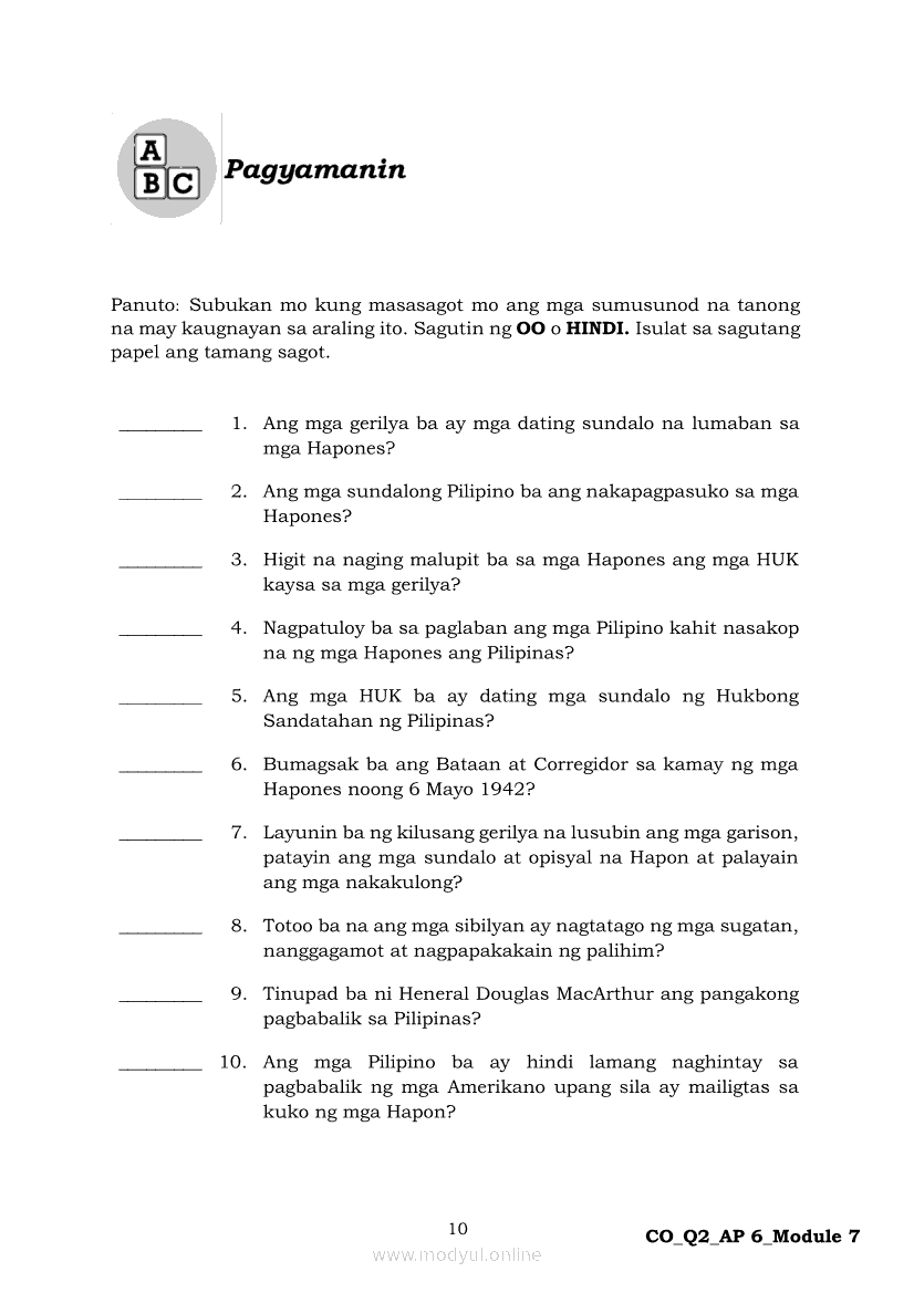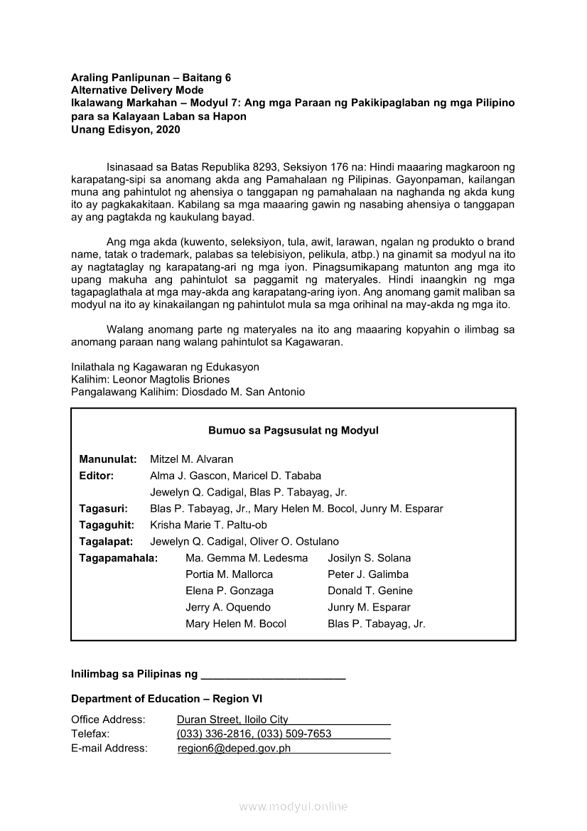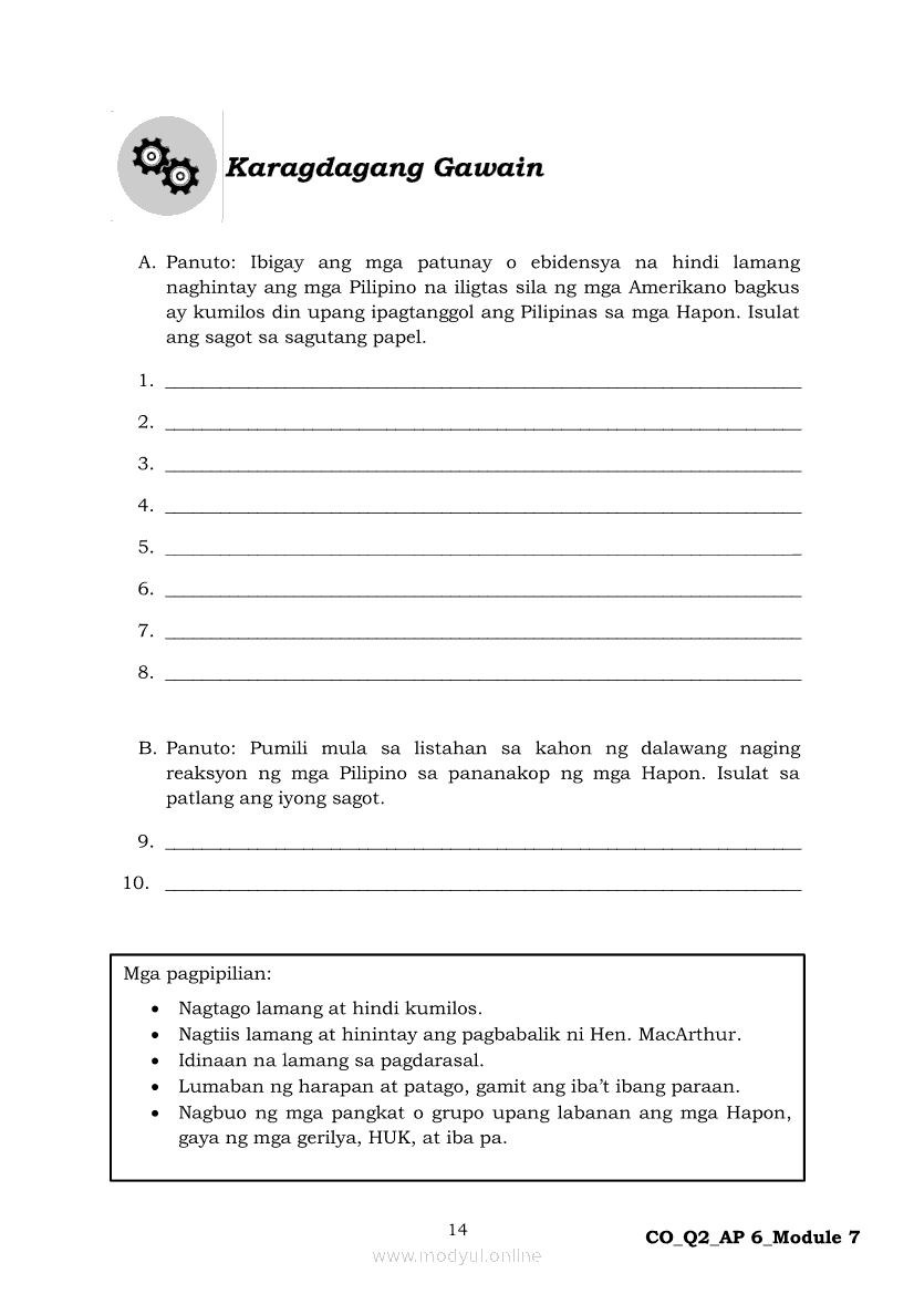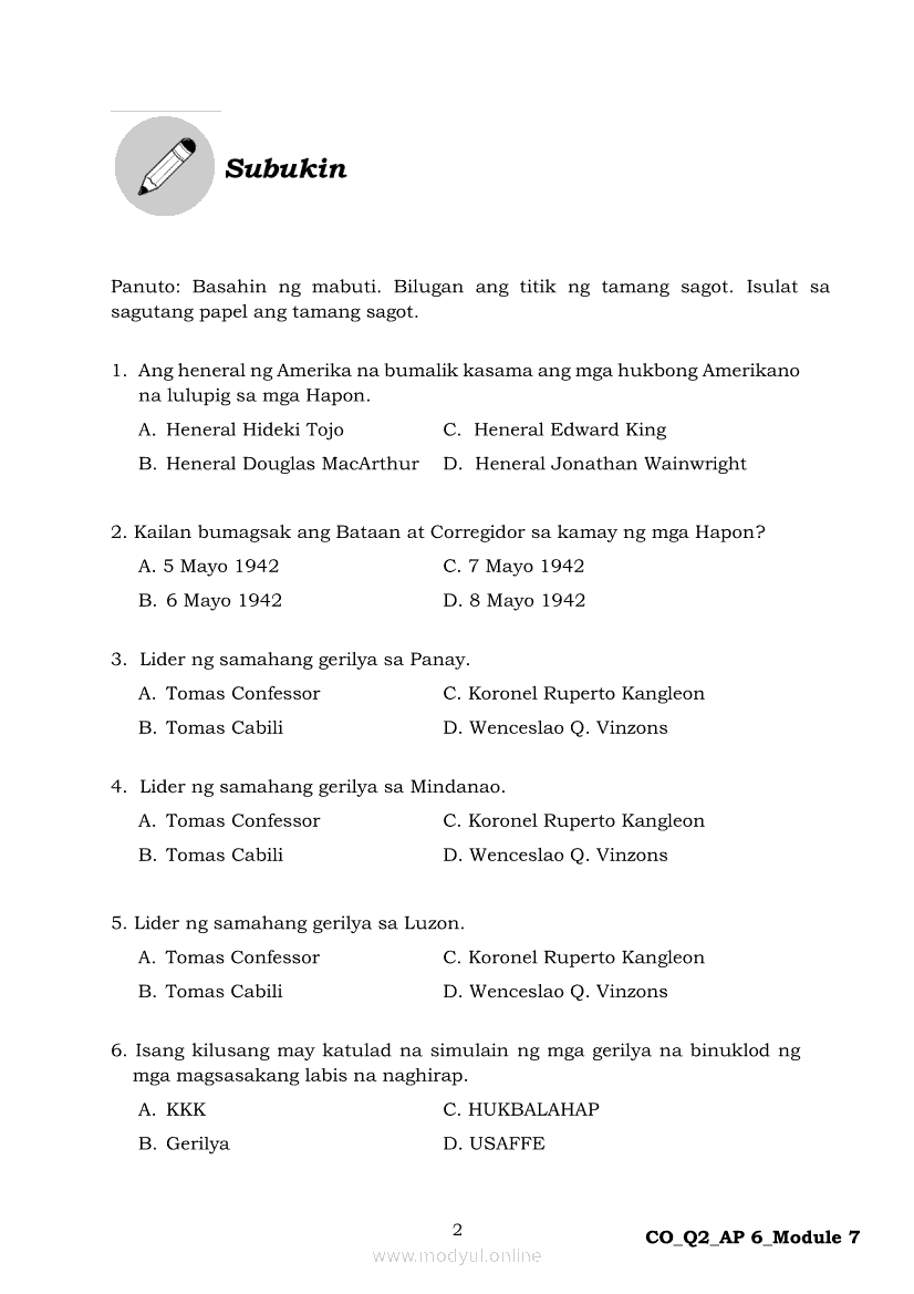 Araling Panlipunan 6 Ikalawang Markahan – Modyul 7: Ang mga Paraan ng Pakikipaglaban ng mga Pilipino para sa Kalayaan Laban sa HaponApr 22, 2021 Grade 6Kiumo M901 Tablet for Kids — comprehensive protection in learning, safety, and entertainment for as low as **₱2,399!. Araling Panlipunan 6RelatedAraling Panlipunan Ikaapat na Markahan – Modyul 4: Pagtatanggol at Pagpapanatili sa Karapatang PantaoAraling Panlipunan Ikaapat na Markahan – Modyul 3: Mga Pangyayaring Nagbigay-Daan sa People Power 1Araling Panlipunan Ikaapat na Markahan – Modyul 6: Mga Pangunahing Suliranin at Hamong Kinaharap ng mga Pilipino mula 1986 hanggang sa kasalukuyanAraling Panlipunan Ika-apat na Markahan – Modyul 8: Mga Gampanin ng Pamahalaan at Mamamayan sa Pagkamit ng Kaunlaran ng BansaAraling Panlipunan Ikaapat na Markahan – Modyul 5: Pagtatanggol at Pagpapanatili sa Demokratikong Pamamahala