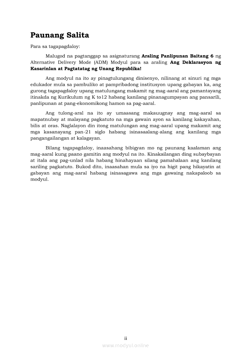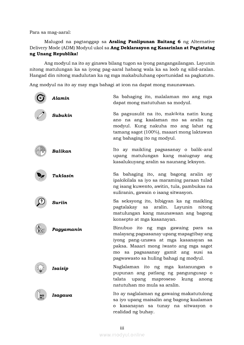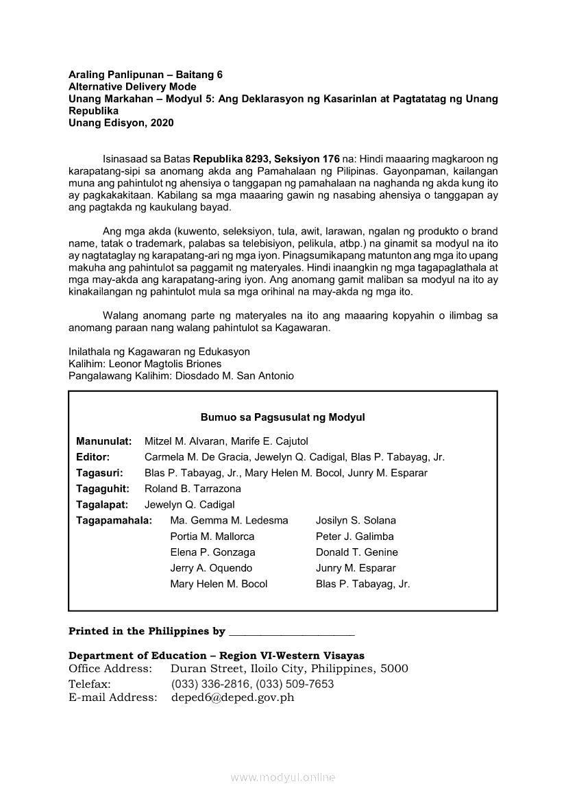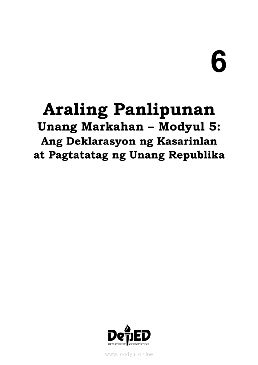 Araling Panlipunan 6 Modyul 5: Ang Deklarasyon ng Kasarinlan at Pagtatatag ng Unang RepublikaApr 22, 2021 Grade 6Kiumo M901 Tablet for Kids — comprehensive protection in learning, safety, and entertainment for as low as **₱2,399!. Araling Panlipunan 6RelatedAraling Panlipunan Ika-apat na Markahan – Modyul 8: Mga Gampanin ng Pamahalaan at Mamamayan sa Pagkamit ng Kaunlaran ng BansaAraling Panlipunan Ikaapat na Markahan – Modyul 3: Mga Pangyayaring Nagbigay-Daan sa People Power 1Araling Panlipunan Ikaapat na Markahan – Modyul 5: Pagtatanggol at Pagpapanatili sa Demokratikong PamamahalaAraling Panlipunan Ikaapat na Markahan – Modyul 6: Mga Pangunahing Suliranin at Hamong Kinaharap ng mga Pilipino mula 1986 hanggang sa kasalukuyanAraling Panlipunan Ikaapat na Markahan – Modyul 4: Pagtatanggol at Pagpapanatili sa Karapatang Pantao