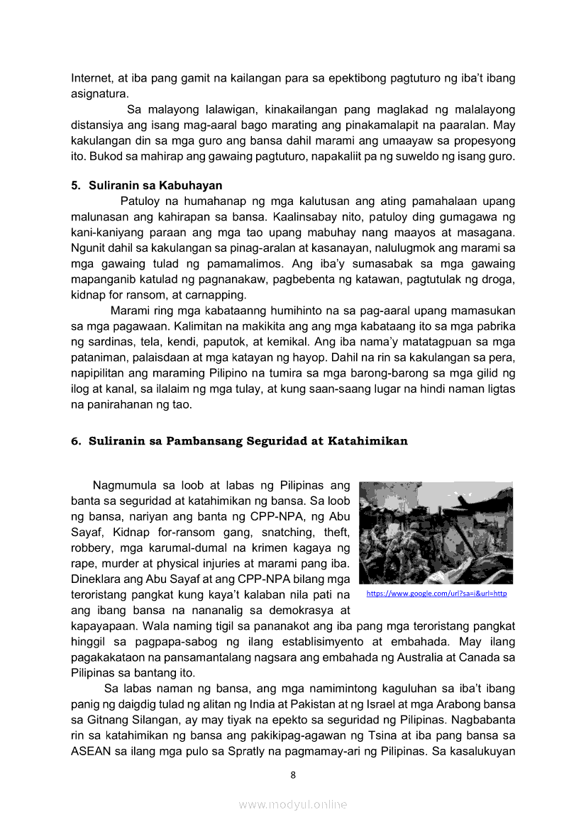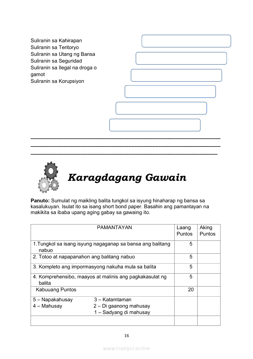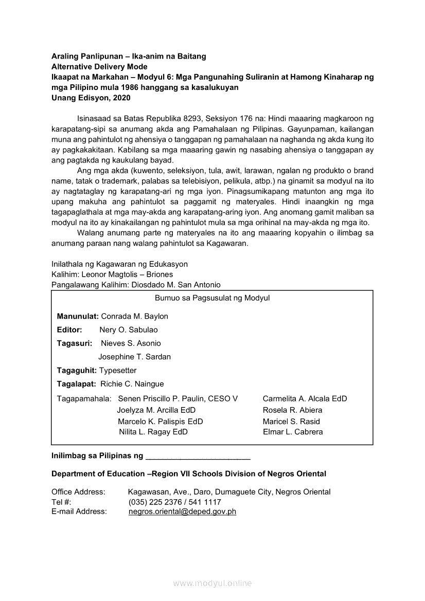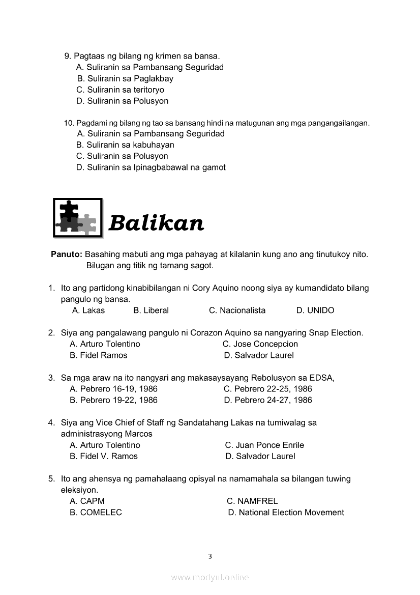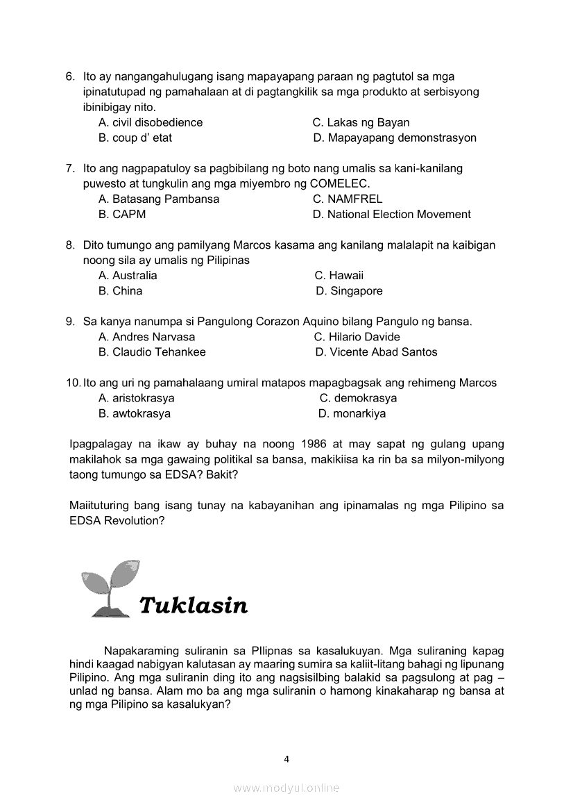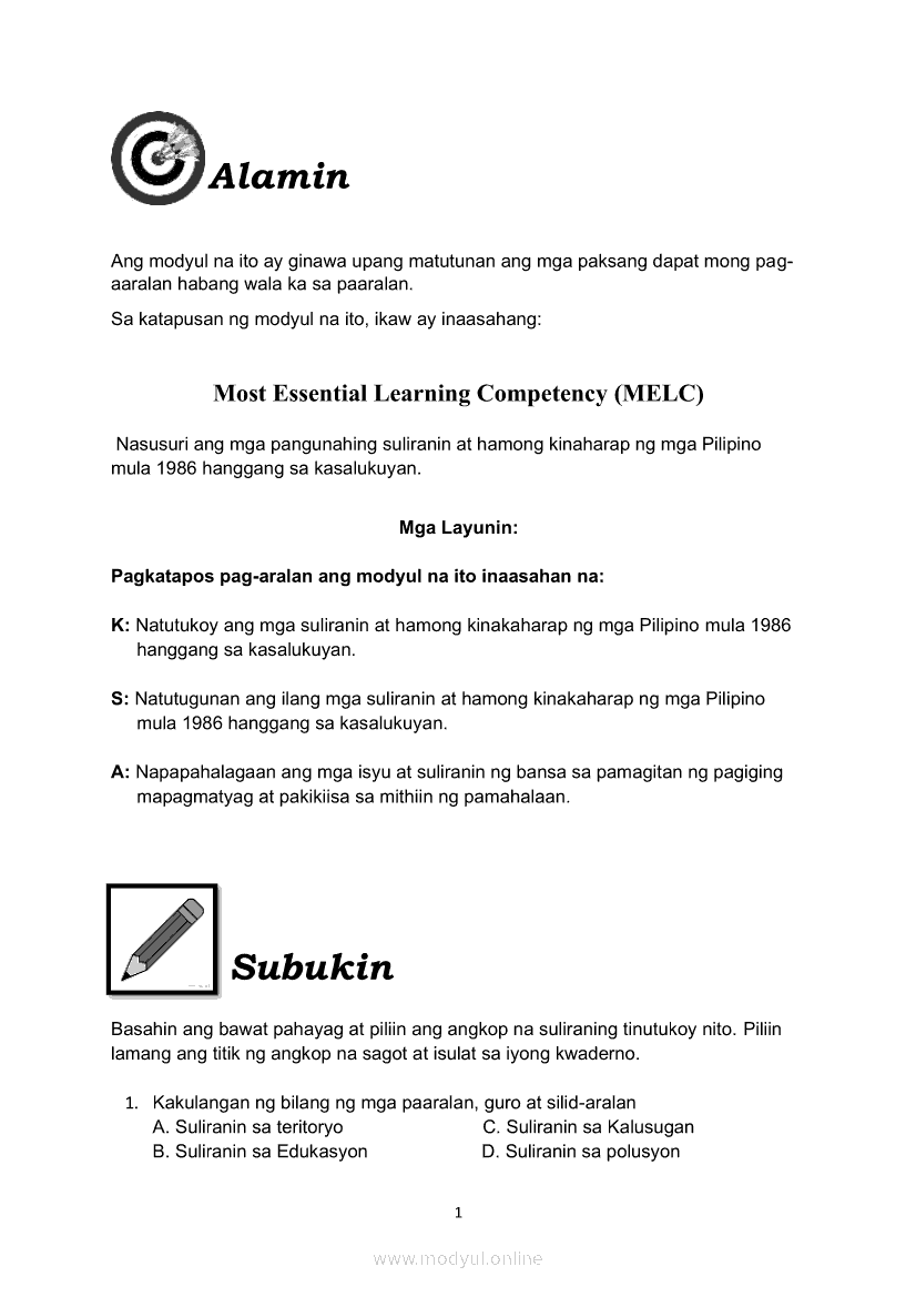 Araling Panlipunan Ikaapat na Markahan – Modyul 6: Mga Pangunahing Suliranin at Hamong Kinaharap ng mga Pilipino mula 1986 hanggang sa kasalukuyanMay 27, 2021 Grade 6Kiumo M901 Tablet for Kids — comprehensive protection in learning, safety, and entertainment for as low as **₱2,399!. Araling Panlipunan 6 4th QuarterRelatedAraling Panlipunan Ikaapat na Markahan – Modyul 5: Pagtatanggol at Pagpapanatili sa Demokratikong PamamahalaAraling Panlipunan Ikaapat na Markahan – Modyul 2: Reaksyon ng mga Pilipino sa Patakaran ng Batas MilitarAraling Panlipunan Ikaapat na Markahan – Modyul 4: Pagtatanggol at Pagpapanatili sa Karapatang PantaoAraling Panlipunan Ikaapat na Markahan – Modyul 7: Kontemporaryong Isyu ng Lipunan Tungo sa Pagtugon sa mga Hamon ng Malaya at Maunlad na BansaAraling Panlipunan Ikaapat na Markahan – Modyul 3: Mga Pangyayaring Nagbigay-Daan sa People Power 1