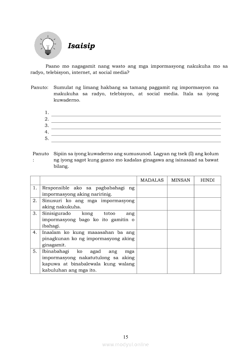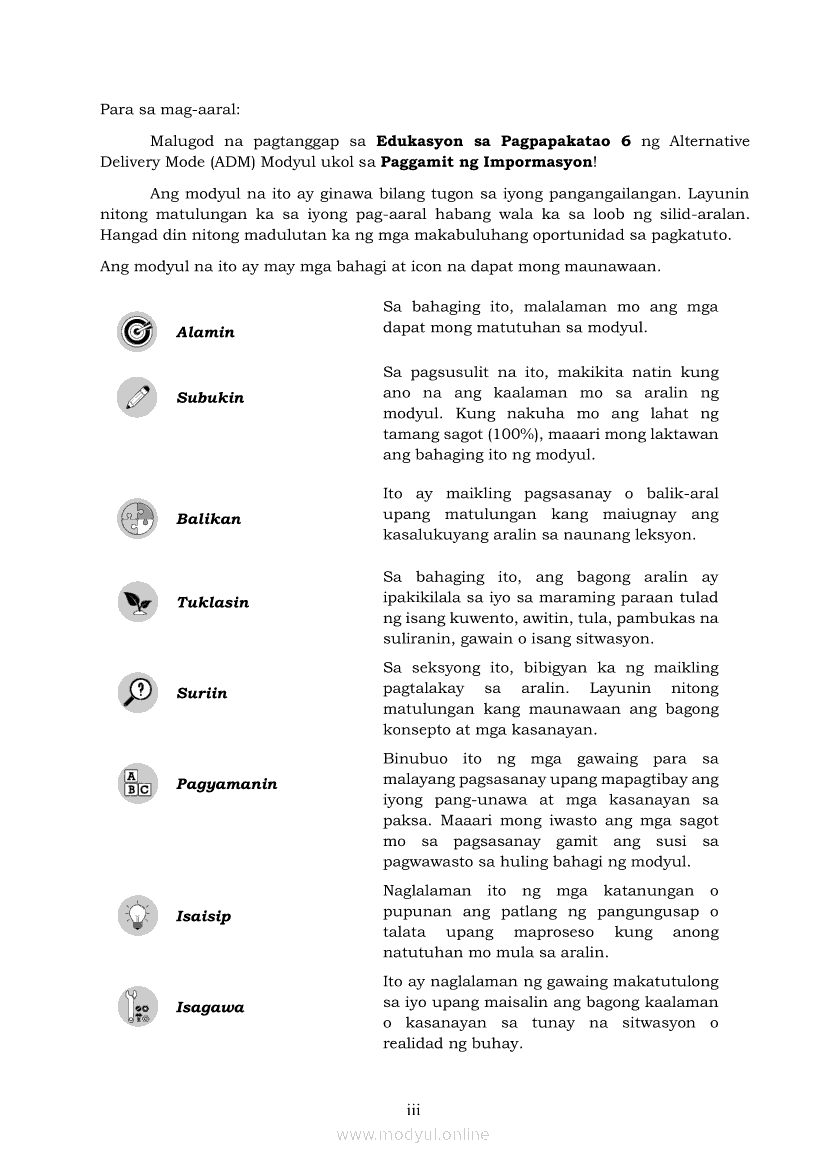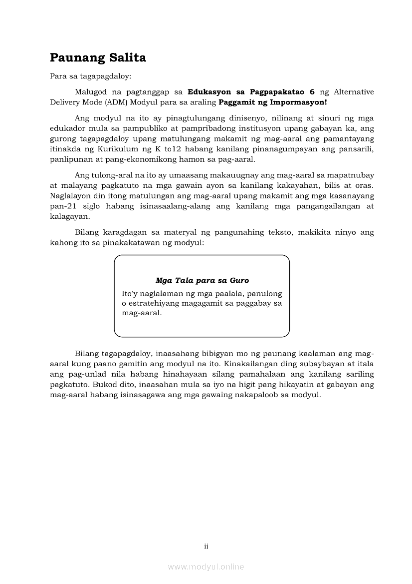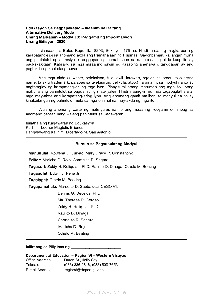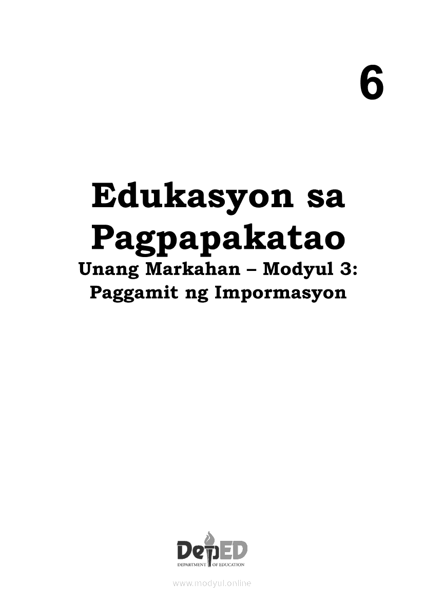 Edukasyon sa Pagpapakatao 6 Modyul 3: Paggamit ng ImpormasyonApr 22, 2021 Grade 6Kiumo M901 Tablet for Kids — comprehensive protection in learning, safety, and entertainment for as low as **₱2,399!. Edukasyon sa Pagpapakatao 6RelatedEdukasyon sa Pagpapakatao Ikaapat na Markahan – Modyul 5: Pananampalataya sa DiyosEdukasyon sa Pagpapakatao Ikaapat na Markahan – Modyul 4: Patunay ng Pananalig sa DiyosEdukasyon sa Pagpapakatao Ikaapat na Markahan – Modyul 8: Pananalig at Pag-asaEdukasyon sa Pagpapakatao Ikaapat na Markahan – Modyul 1: May Pag-asang Dala ang Pananalig sa DiyosEdukasyon sa Pagpapakatao Ikaapat na Markahan – Modyul 7: Positibong Pananaw sa Buhay