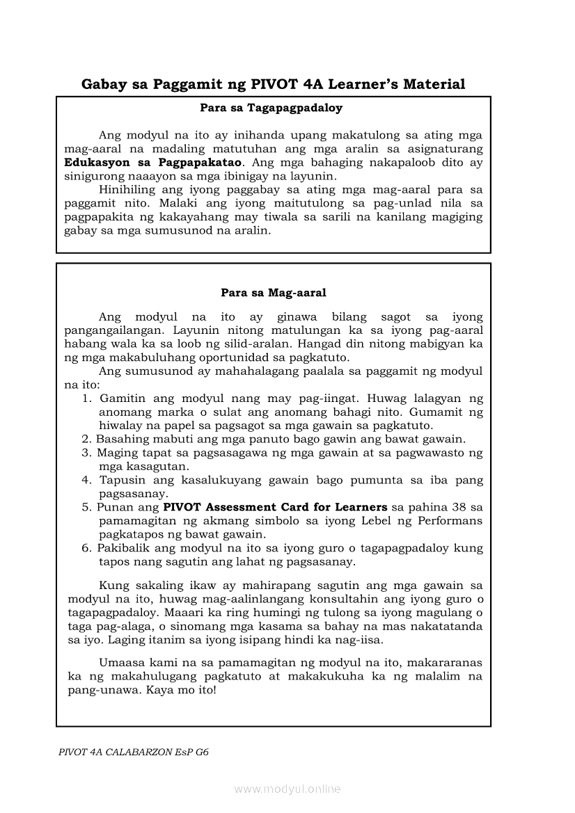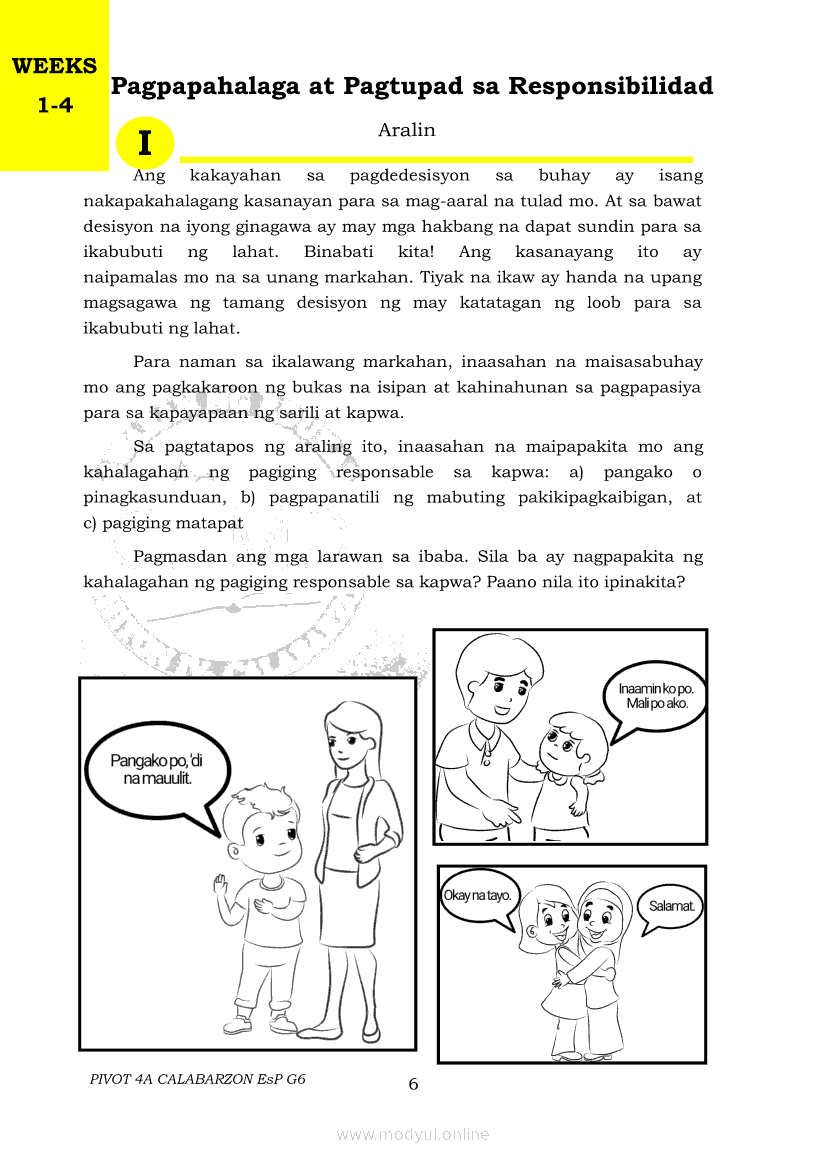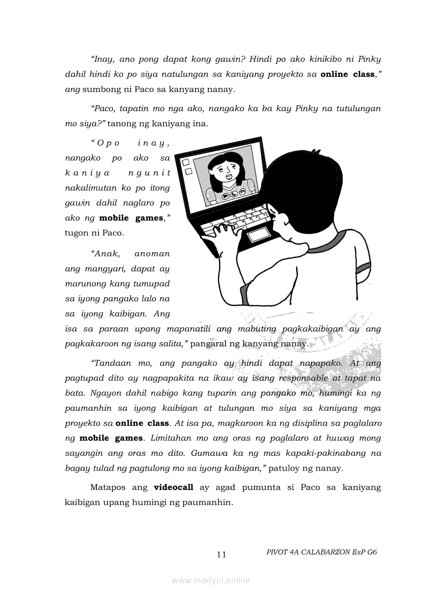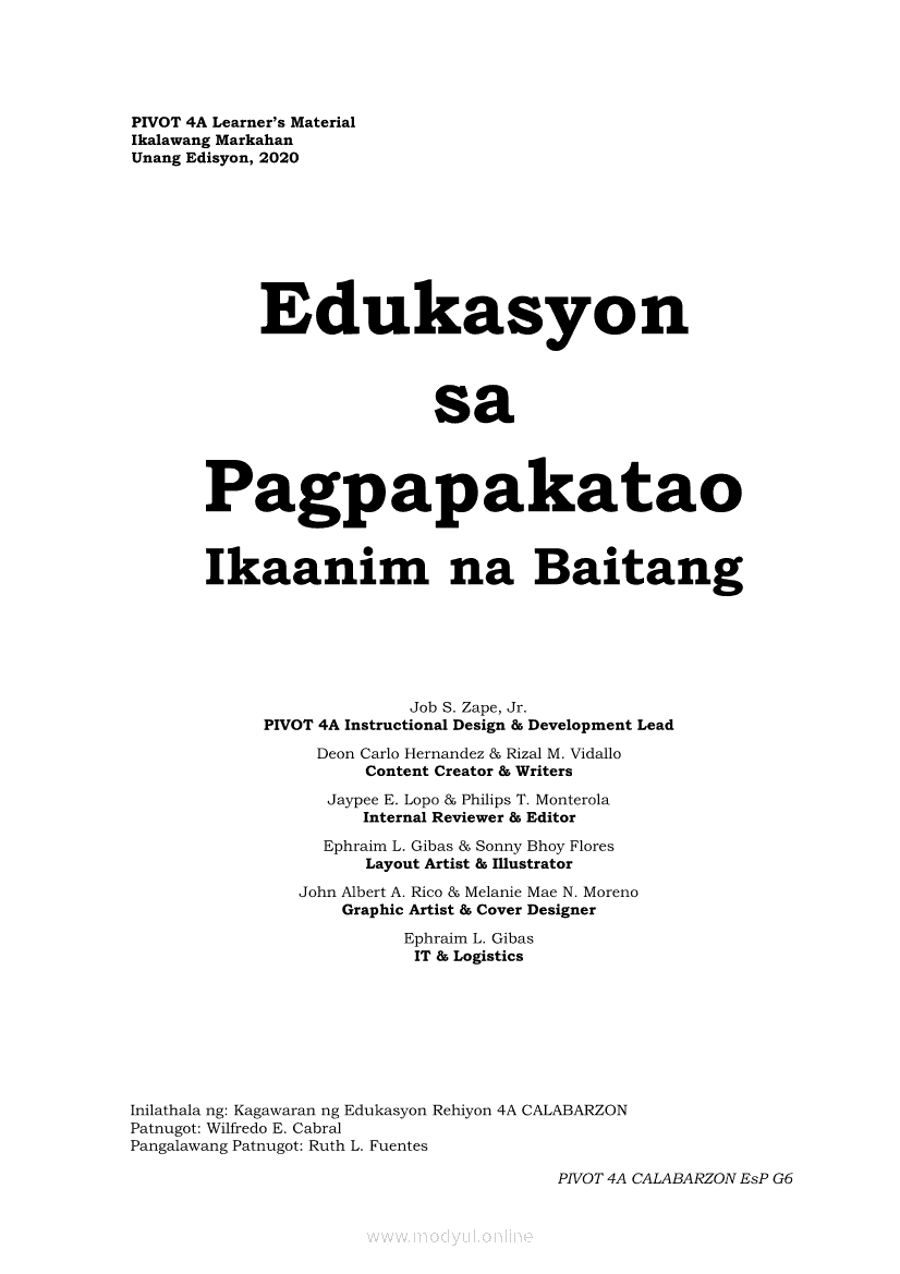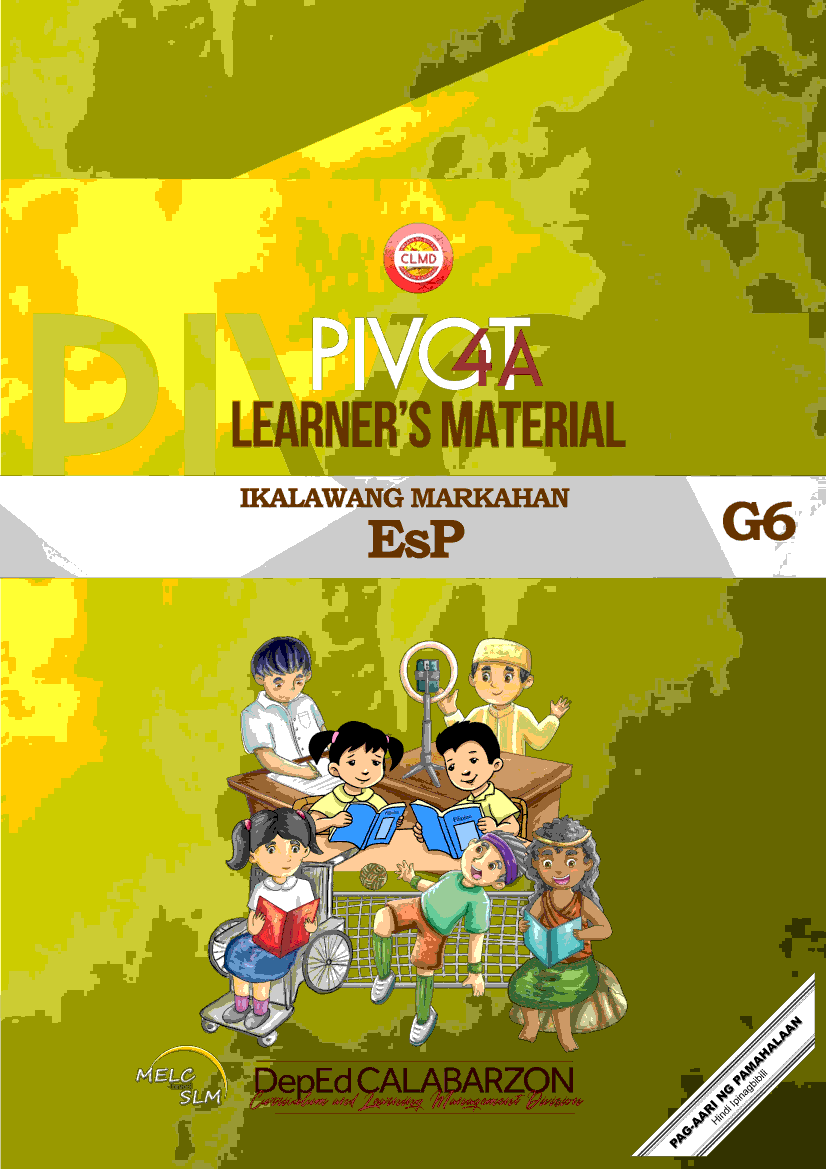 Edukasyon sa Pagpapakatao 6 Modyul para sa Ikalawang Markahan (PIVOT)Apr 22, 2021 Grade 6Kiumo M901 Tablet for Kids — comprehensive protection in learning, safety, and entertainment for as low as **₱2,399!. Edukasyon sa Pagpapakatao 6RelatedEdukasyon sa Pagpapakatao Ikaapat na Markahan – Modyul 8: Pananalig at Pag-asaEdukasyon sa Pagpapakatao Ikaapat na Markahan – Modyul 2: Manalig sa DiyosEdukasyon sa Pagpapakatao Ikaapat na Markahan – Modyul 3 Pagpapaunlad ng Pagkatao sa Pamamagitan ng IspiritwalidadEdukasyon sa Pagpapakatao Ikaapat na Markahan – Modyul 7: Positibong Pananaw sa BuhayEdukasyon sa Pagpapakatao Ikaapat na Markahan – Modyul 5: Pananampalataya sa Diyos