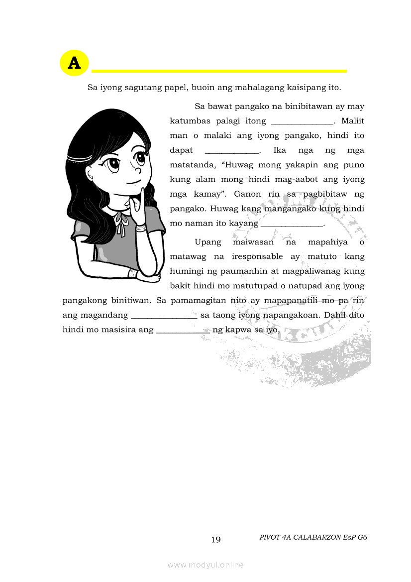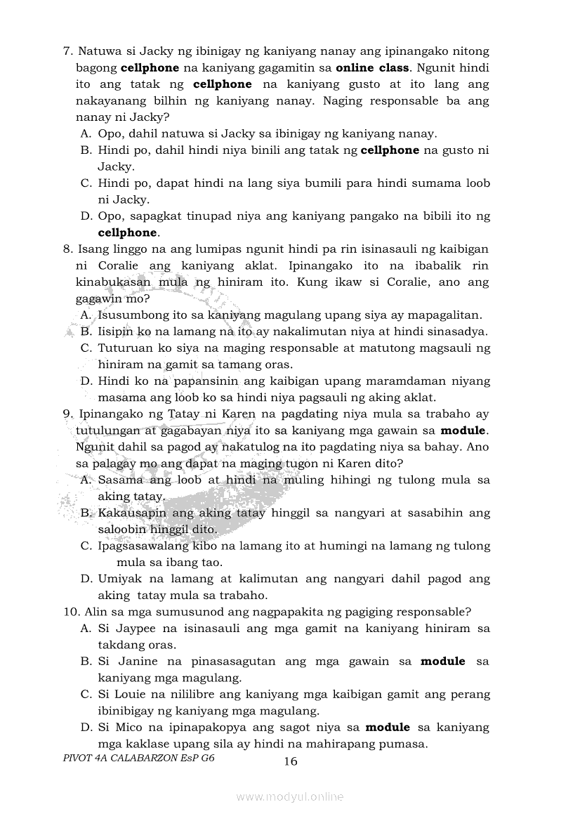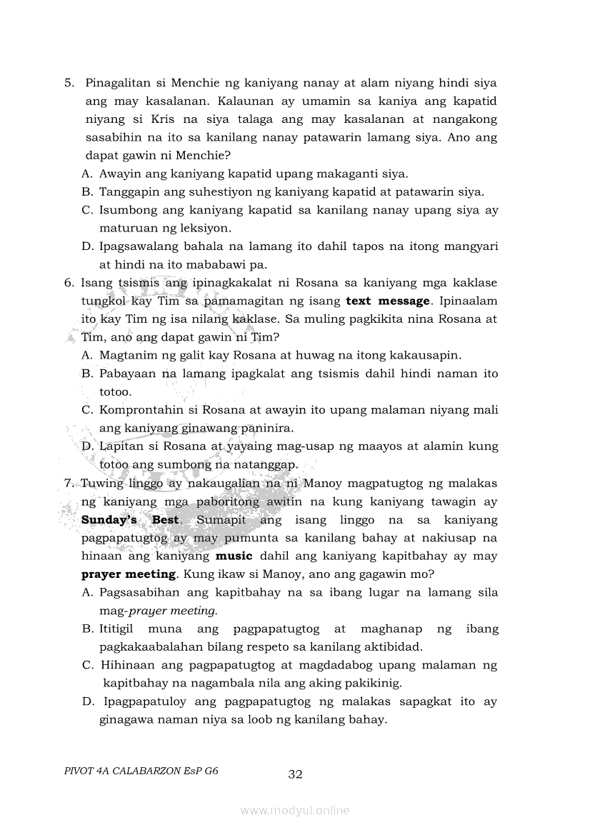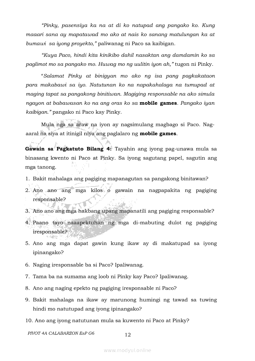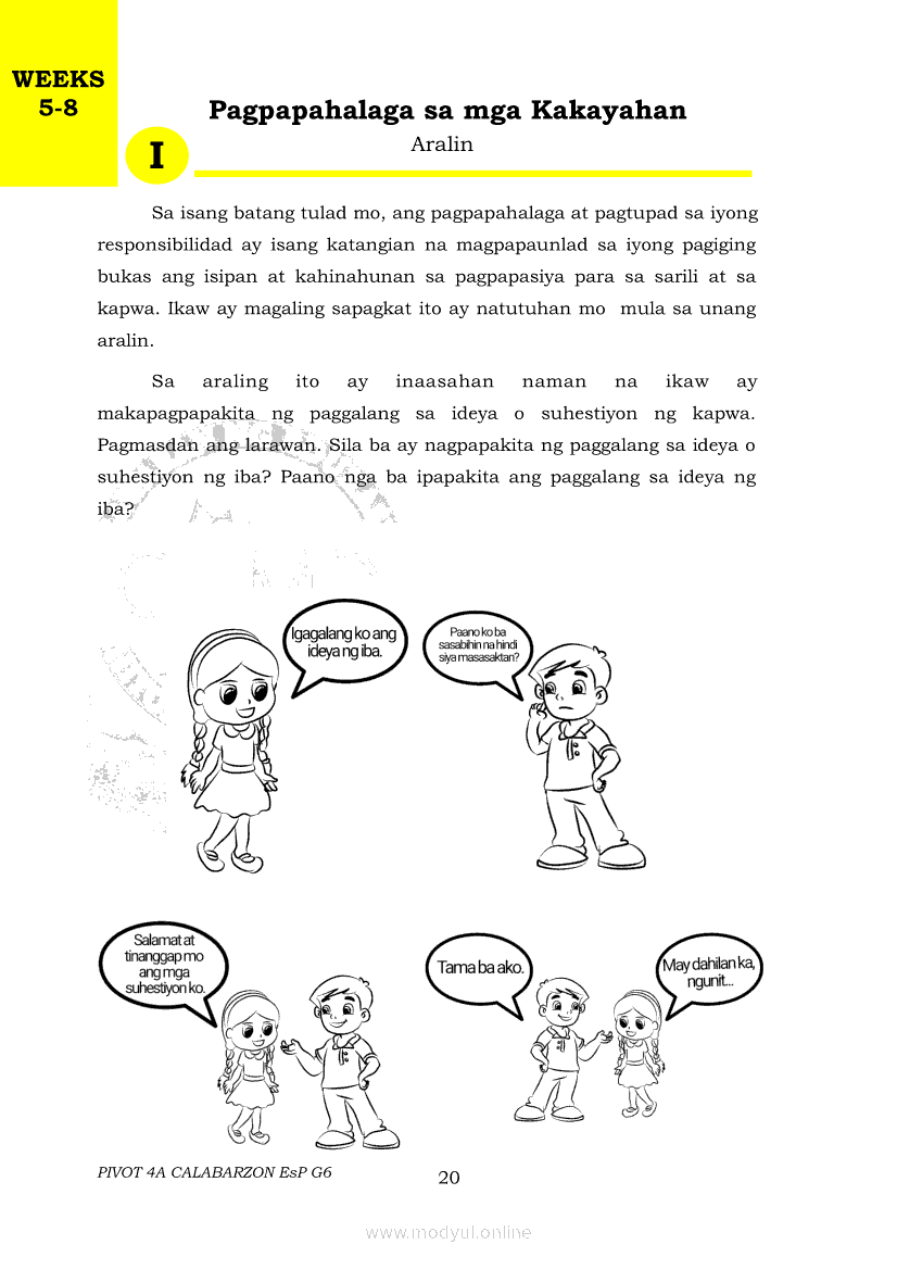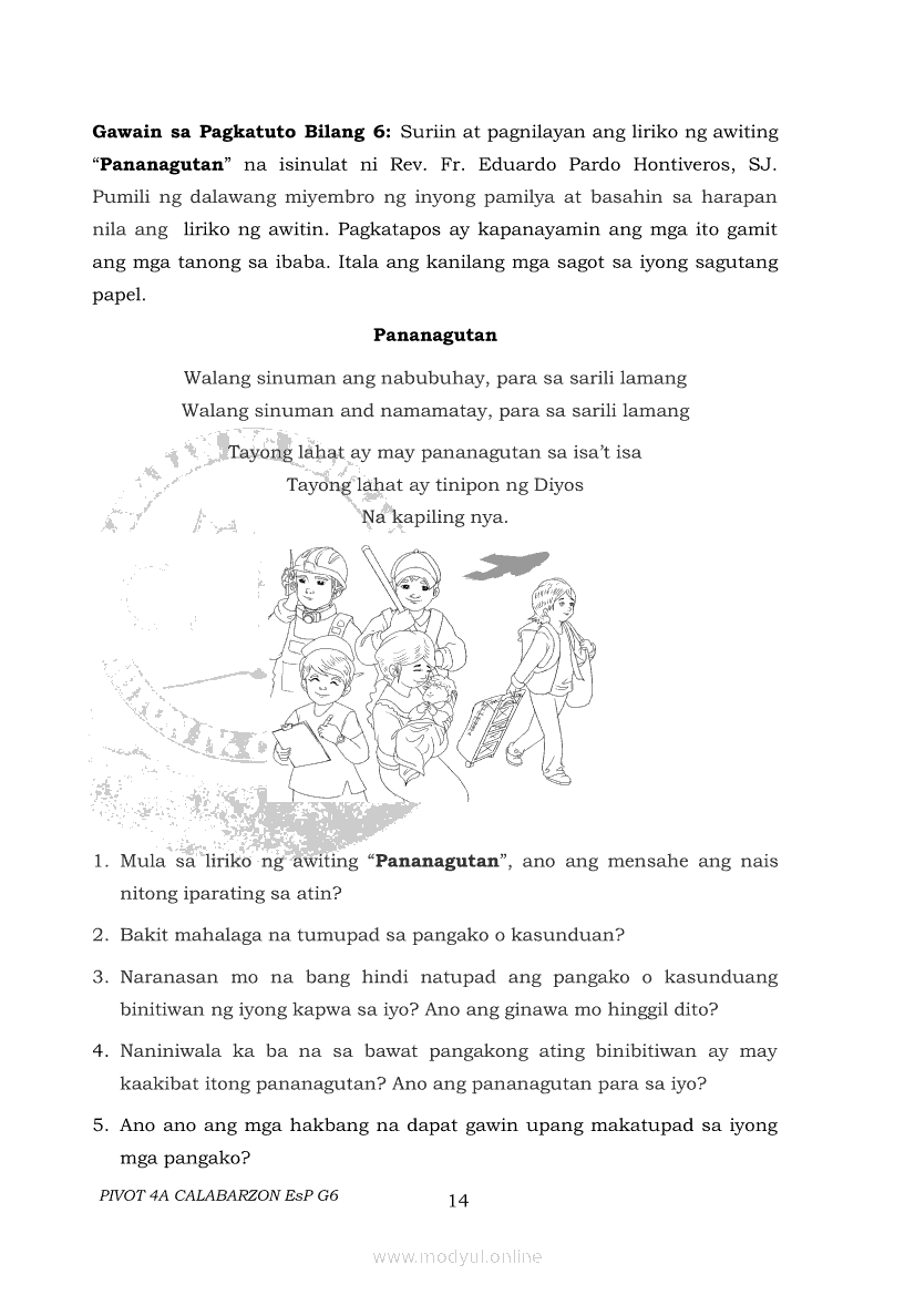 Edukasyon sa Pagpapakatao 6 Modyul para sa Ikalawang Markahan (PIVOT)Apr 22, 2021 Grade 6Kiumo M901 Tablet for Kids — comprehensive protection in learning, safety, and entertainment for as low as **₱2,399!. Edukasyon sa Pagpapakatao 6RelatedEdukasyon sa Pagpapakatao Ikaapat na Markahan – Modyul 8: Pananalig at Pag-asaEdukasyon sa Pagpapakatao Ikaapat na Markahan – Modyul 2: Manalig sa DiyosEdukasyon sa Pagpapakatao Ikaapat na Markahan – Modyul 3 Pagpapaunlad ng Pagkatao sa Pamamagitan ng IspiritwalidadEdukasyon sa Pagpapakatao Ikaapat na Markahan – Modyul 7: Positibong Pananaw sa BuhayEdukasyon sa Pagpapakatao Ikaapat na Markahan – Modyul 5: Pananampalataya sa Diyos