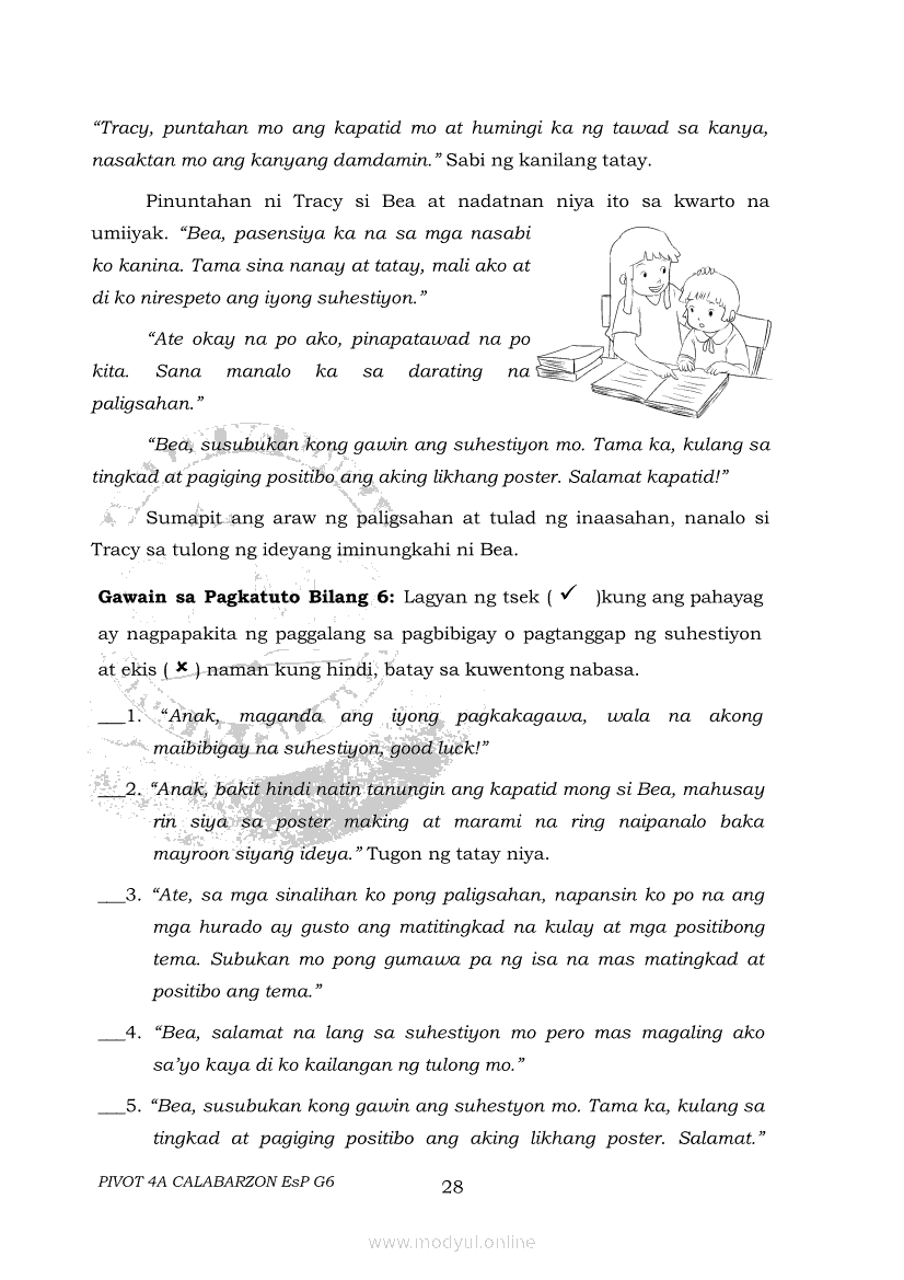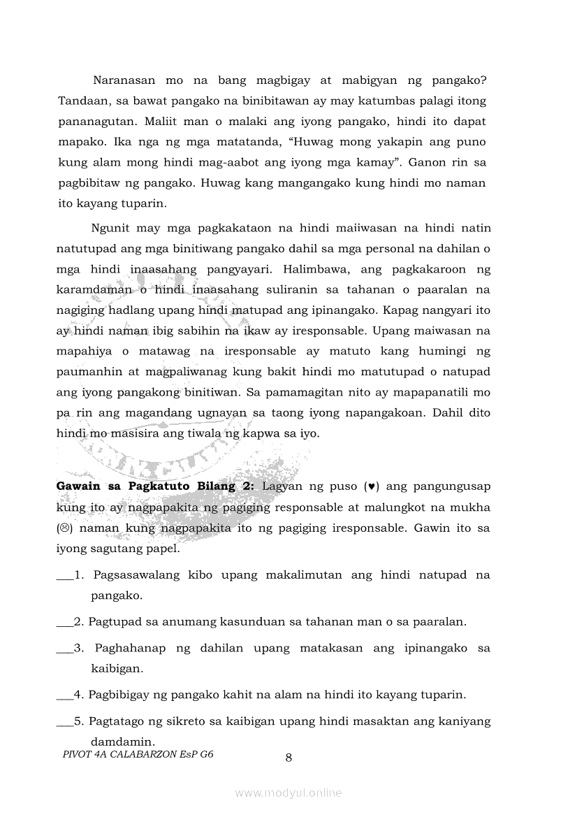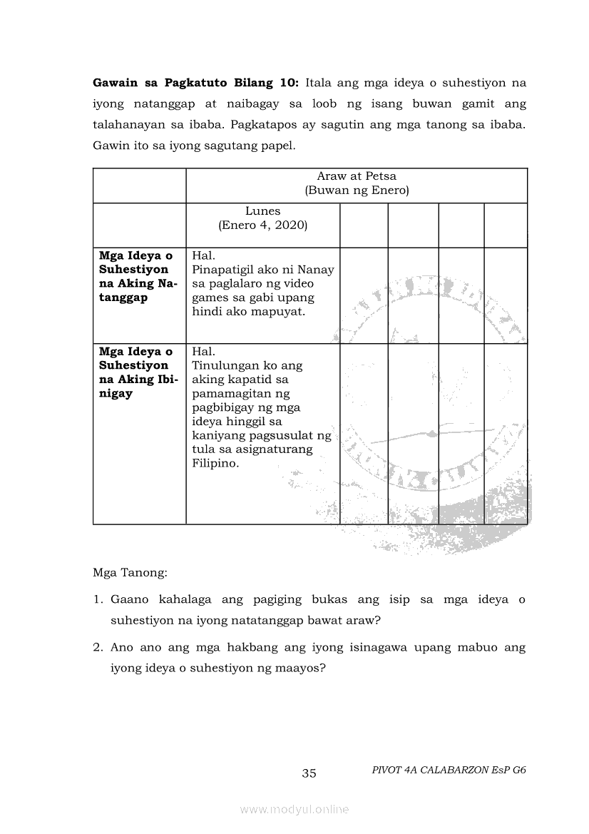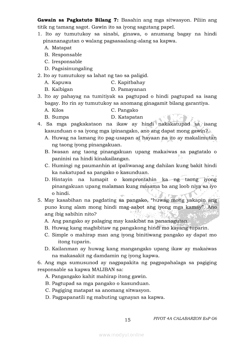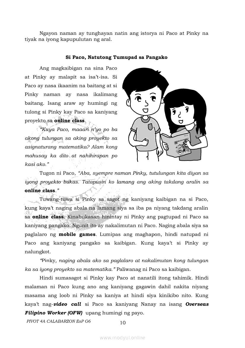 Edukasyon sa Pagpapakatao 6 Modyul para sa Ikalawang Markahan (PIVOT)Apr 22, 2021 Grade 6Kiumo M901 Tablet for Kids — comprehensive protection in learning, safety, and entertainment for as low as **₱2,399!. Edukasyon sa Pagpapakatao 6RelatedEdukasyon sa Pagpapakatao Ikaapat na Markahan – Modyul 8: Pananalig at Pag-asaEdukasyon sa Pagpapakatao Ikaapat na Markahan – Modyul 2: Manalig sa DiyosEdukasyon sa Pagpapakatao Ikaapat na Markahan – Modyul 3 Pagpapaunlad ng Pagkatao sa Pamamagitan ng IspiritwalidadEdukasyon sa Pagpapakatao Ikaapat na Markahan – Modyul 7: Positibong Pananaw sa BuhayEdukasyon sa Pagpapakatao Ikaapat na Markahan – Modyul 5: Pananampalataya sa Diyos