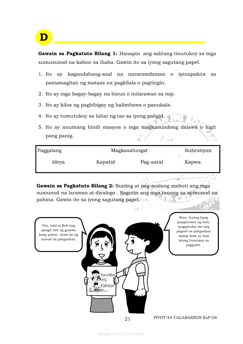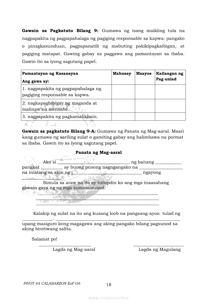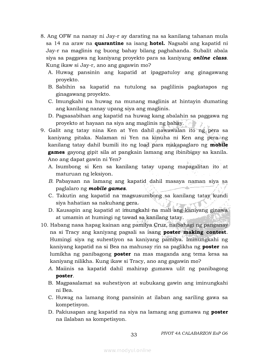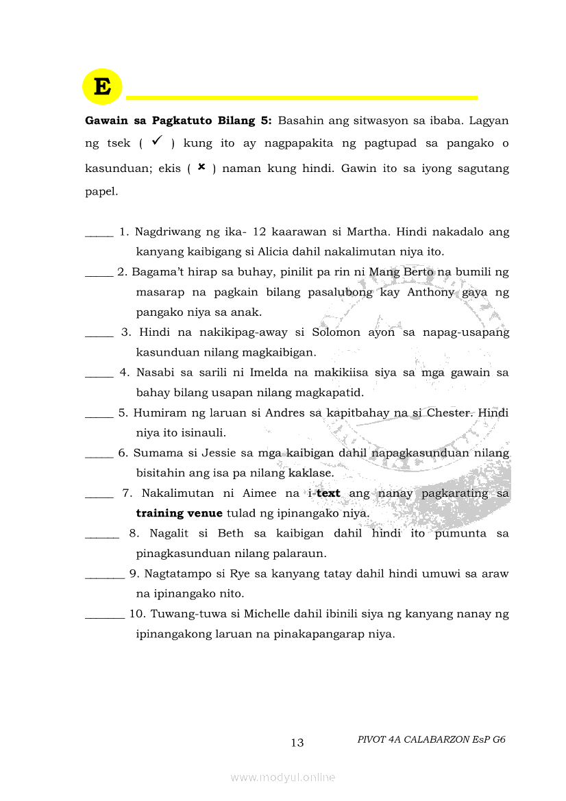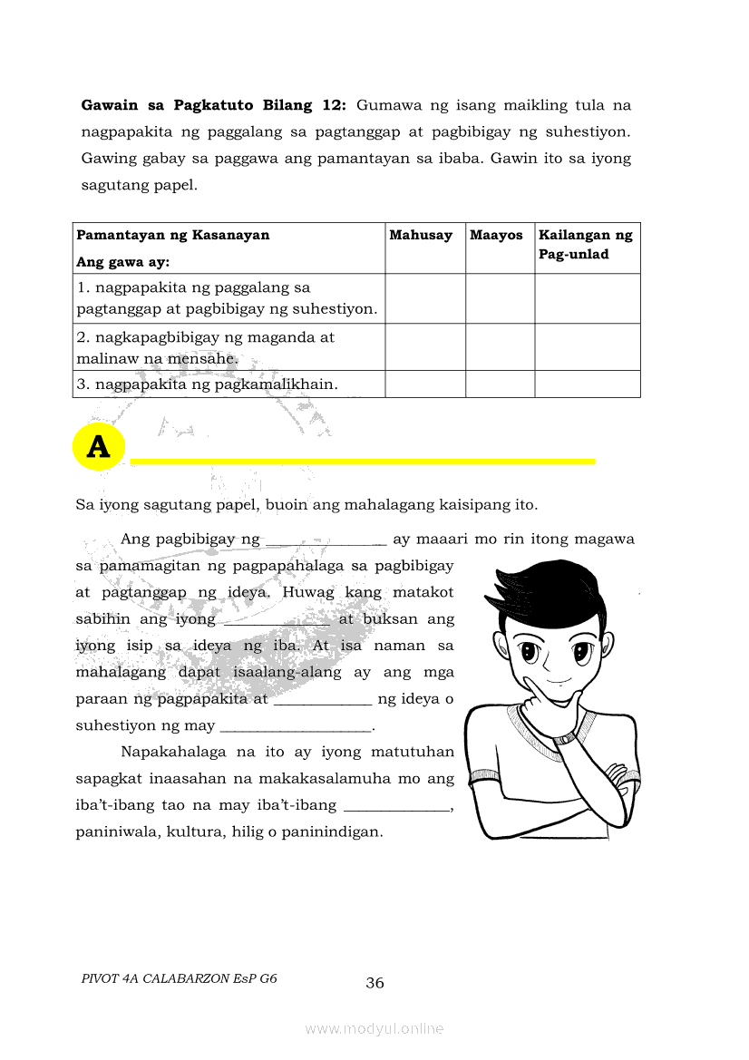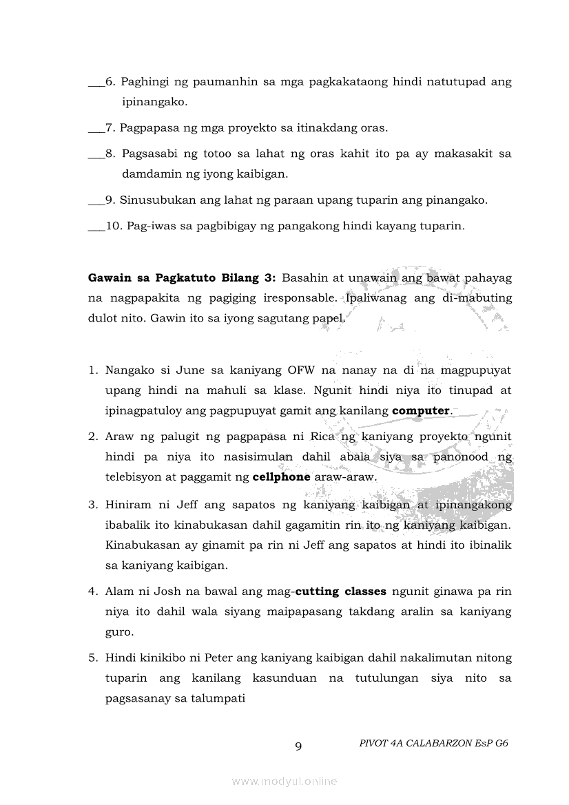 Edukasyon sa Pagpapakatao 6 Modyul para sa Ikalawang Markahan (PIVOT)Apr 22, 2021 Grade 6Kiumo M901 Tablet for Kids — comprehensive protection in learning, safety, and entertainment for as low as **₱2,399!. Edukasyon sa Pagpapakatao 6RelatedEdukasyon sa Pagpapakatao Ikaapat na Markahan – Modyul 8: Pananalig at Pag-asaEdukasyon sa Pagpapakatao Ikaapat na Markahan – Modyul 2: Manalig sa DiyosEdukasyon sa Pagpapakatao Ikaapat na Markahan – Modyul 3 Pagpapaunlad ng Pagkatao sa Pamamagitan ng IspiritwalidadEdukasyon sa Pagpapakatao Ikaapat na Markahan – Modyul 7: Positibong Pananaw sa BuhayEdukasyon sa Pagpapakatao Ikaapat na Markahan – Modyul 5: Pananampalataya sa Diyos