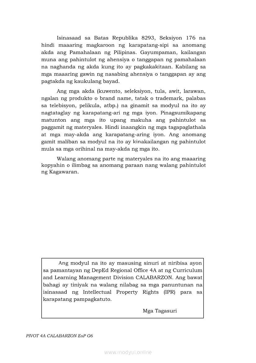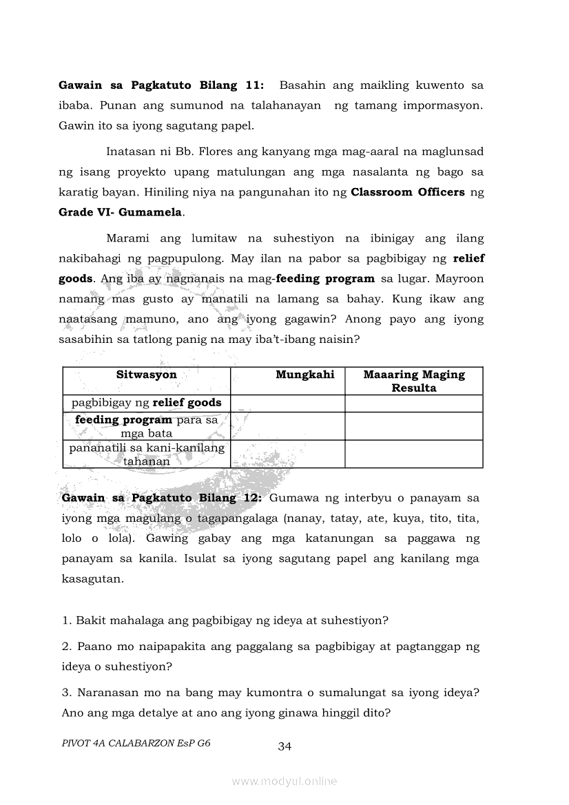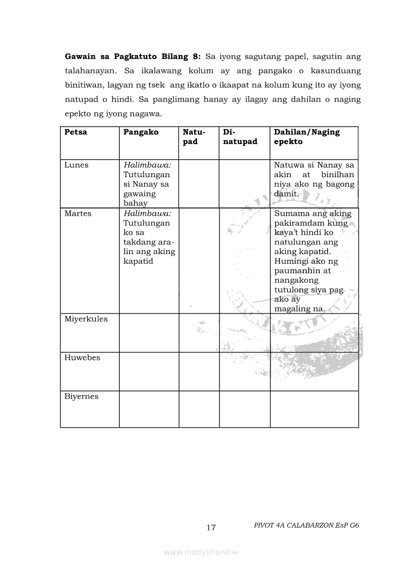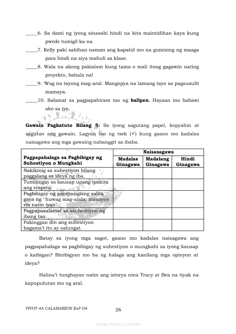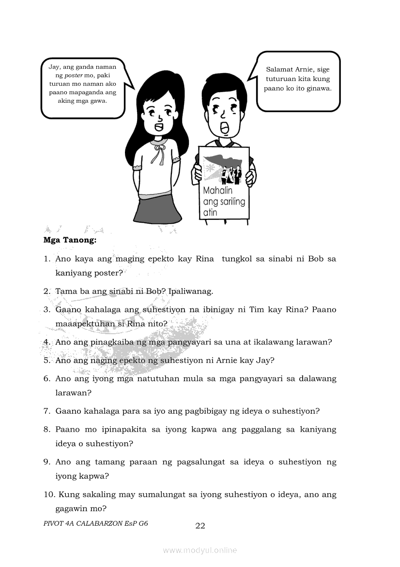 Edukasyon sa Pagpapakatao 6 Modyul para sa Ikalawang Markahan (PIVOT)Apr 22, 2021 Grade 6Kiumo M901 Tablet for Kids — comprehensive protection in learning, safety, and entertainment for as low as **₱2,399!. Edukasyon sa Pagpapakatao 6RelatedEdukasyon sa Pagpapakatao Ikaapat na Markahan – Modyul 8: Pananalig at Pag-asaEdukasyon sa Pagpapakatao Ikaapat na Markahan – Modyul 2: Manalig sa DiyosEdukasyon sa Pagpapakatao Ikaapat na Markahan – Modyul 3 Pagpapaunlad ng Pagkatao sa Pamamagitan ng IspiritwalidadEdukasyon sa Pagpapakatao Ikaapat na Markahan – Modyul 7: Positibong Pananaw sa BuhayEdukasyon sa Pagpapakatao Ikaapat na Markahan – Modyul 5: Pananampalataya sa Diyos