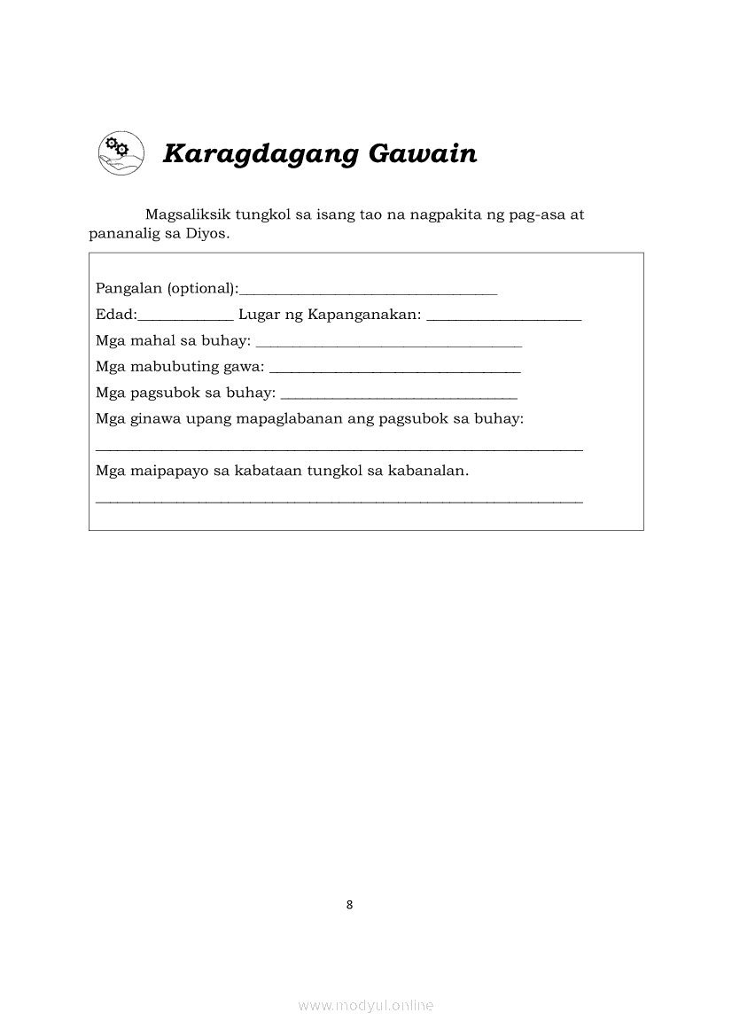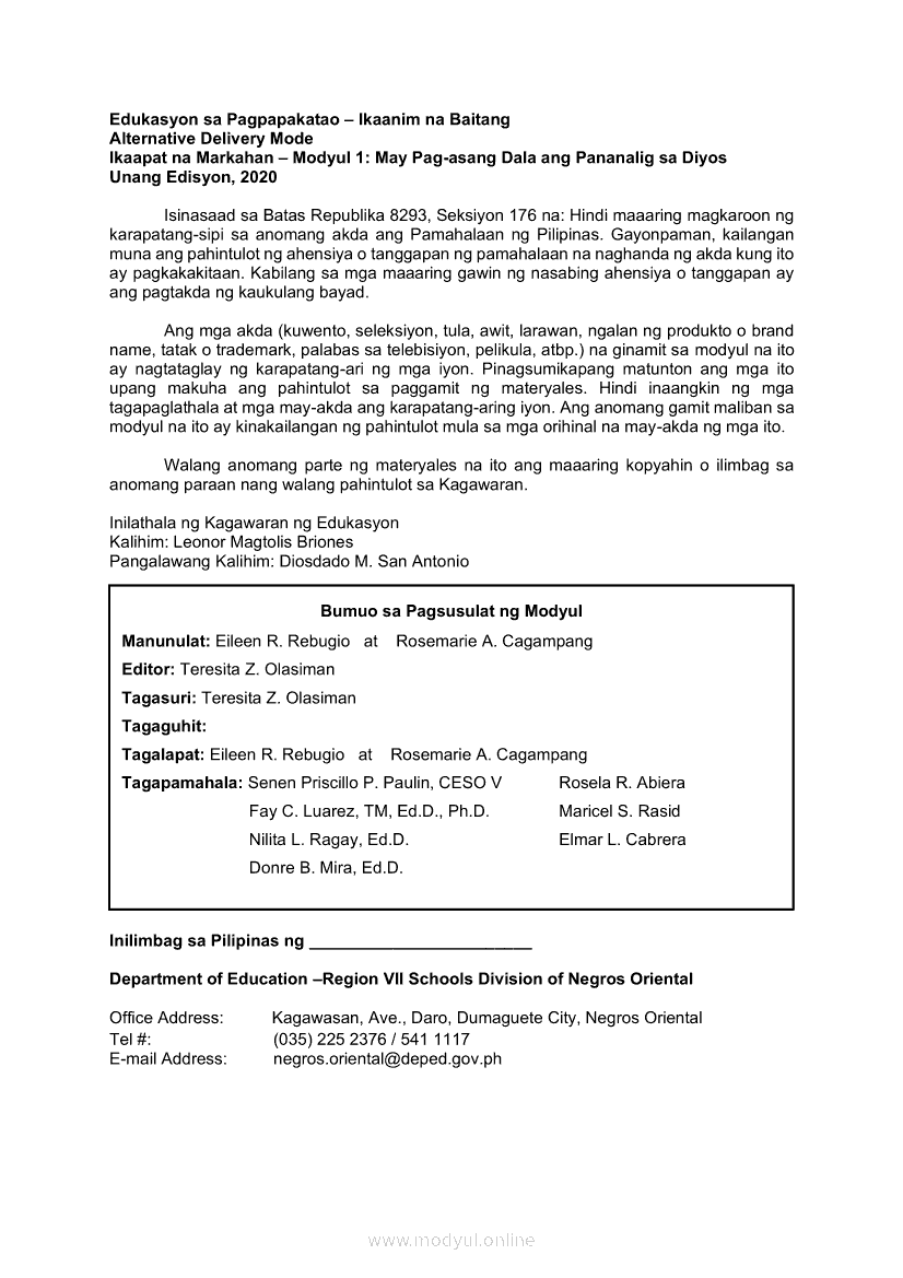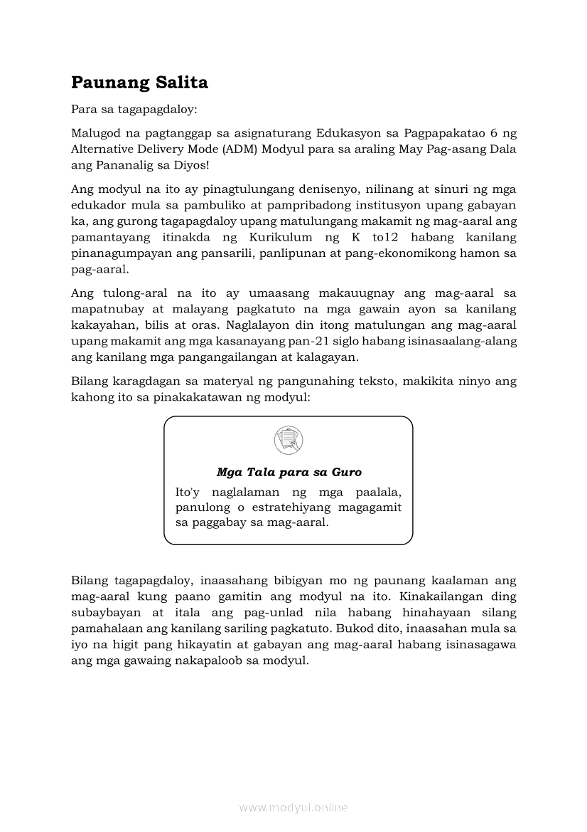 Edukasyon sa Pagpapakatao Ikaapat na Markahan – Modyul 1: May Pag-asang Dala ang Pananalig sa DiyosMay 27, 2021 Grade 6Kiumo M901 Tablet for Kids — comprehensive protection in learning, safety, and entertainment for as low as **₱2,399!. Edukasyon sa Pagpapakatao 6 4th QuarterRelatedEdukasyon sa Pagpapakatao Ikaapat na Markahan – Modyul 6: Ang Pananalig sa DiyosEdukasyon sa Pagpapakatao Ikaapat na Markahan – Modyul 8: Pananalig at Pag-asaEdukasyon sa Pagpapakatao Ikaapat na Markahan – Modyul 3 Pagpapaunlad ng Pagkatao sa Pamamagitan ng IspiritwalidadEdukasyon sa Pagpapakatao Ikaapat na Markahan – Modyul 7: Positibong Pananaw sa BuhayEdukasyon sa Pagpapakatao Ikaapat na Markahan – Modyul 2: Manalig sa Diyos