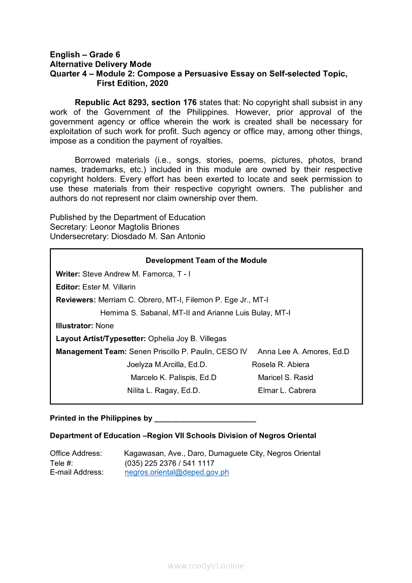 English Quarter 4 – Module: 2 Compose a Persuasive Essay on Self-selected TopicMay 27, 2021 Grade 6Kiumo M901 Tablet for Kids — comprehensive protection in learning, safety, and entertainment for as low as **₱2,399!. English 6 4th QuarterRelatedEnglish Quarter 4 – Module 1.1a: Compose Clear and Coherent Sentences Using Appropriate Grammatical Structures (Verb Tenses): Simple Tenses of VerbsEnglish Quarter 4 – Module 1.1b: Compose Clear and Coherent Sentences Using Appropriate Grammatical Structures (Verb Tenses: Perfect Tenses of VerbsEdukasyon sa Pagpapakatao Ikaapat na Markahan – Modyul 1: May Pag-asang Dala ang Pananalig sa DiyosEPP - ICT Quarter 4 – Module 3: Posts and Shares Materials on Blog in Responsible MannerPhysical Education Quarter 4 – Module: 4a Physical Fitness for Creative Dances: An Enhanced Understanding