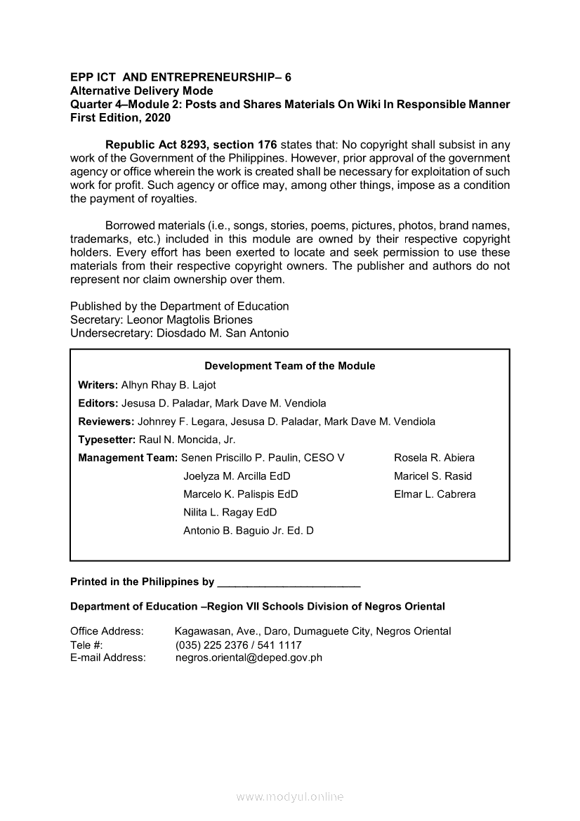 EPP- ICT Quarter 4 – Module 2: Posts and Shares Materials on Wiki in Responsible MannerMay 27, 2021 Grade 6Kiumo M901 Tablet for Kids — comprehensive protection in learning, safety, and entertainment for as low as **₱2,399!. EPP 6 4th QuarterRelatedEPP ICT Quarter 4 – Module 1: Sells Products Based on Needs and DemandsEPP- ICT Quarter 4- Module 8: Slide Presentation with Multimedia (Using Slide Presentation with Multimedia)EPP - ICT Quarter 4 – Module 3: Posts and Shares Materials on Blog in Responsible MannerEPP ICT Quarter 4 – Module 4: Participates in Video and Audio Conferences in Safe and Responsible MannersMATHEMATICS Quarter 4 – Module 6 Describe the Meaning of Probability Such as 50% Chance of Rain and One in a Million Chance of Winning