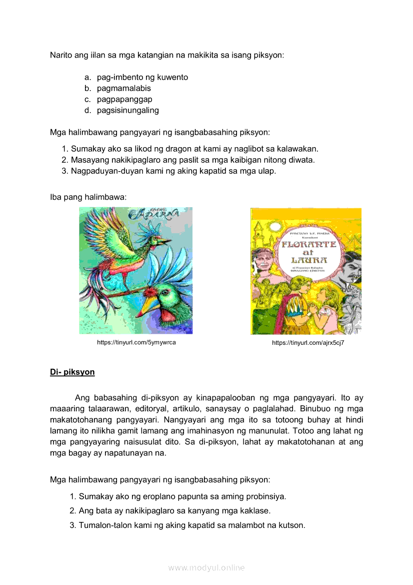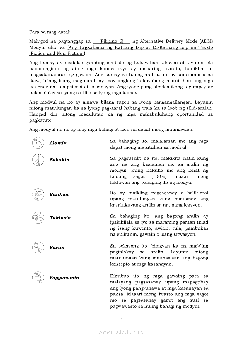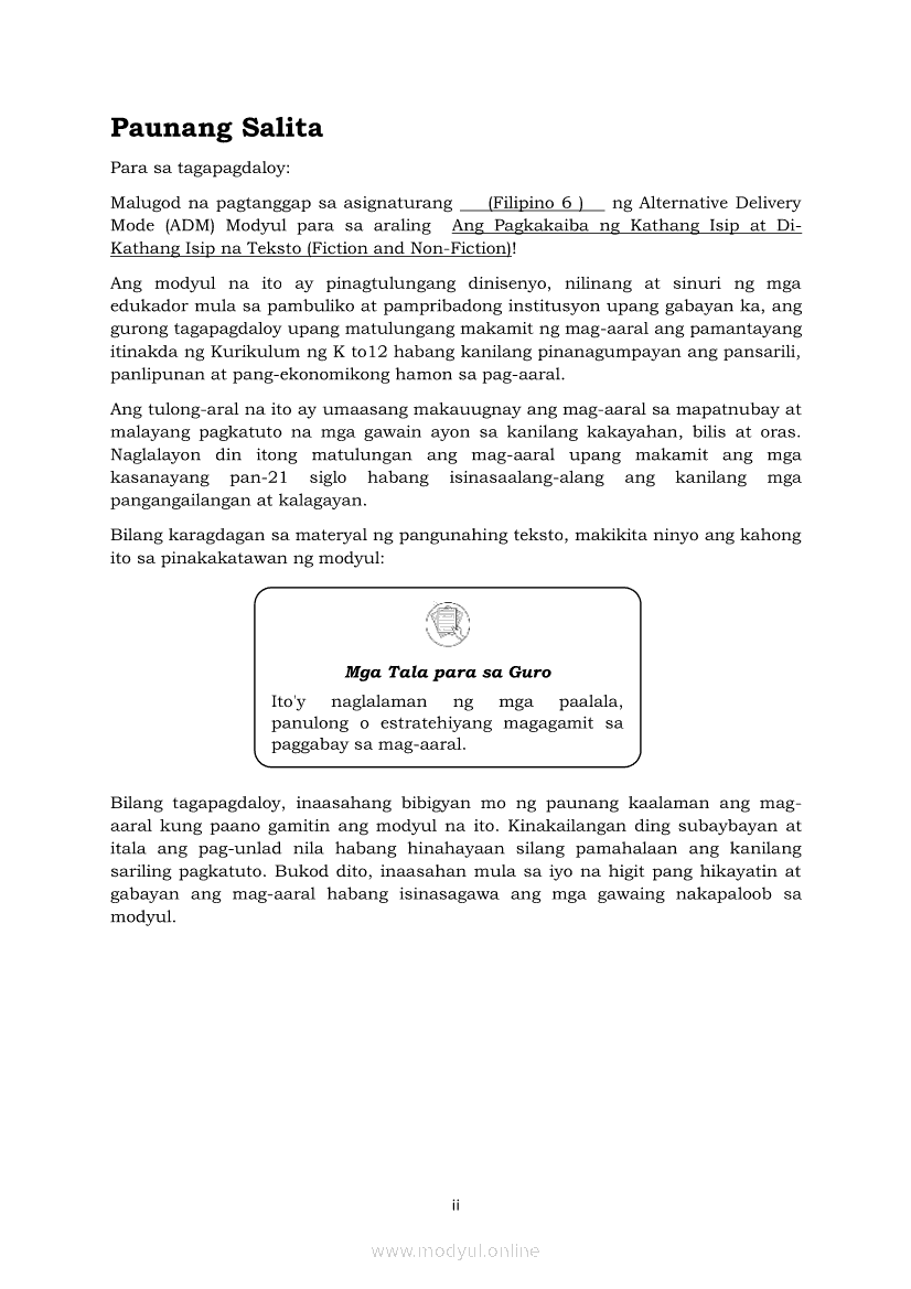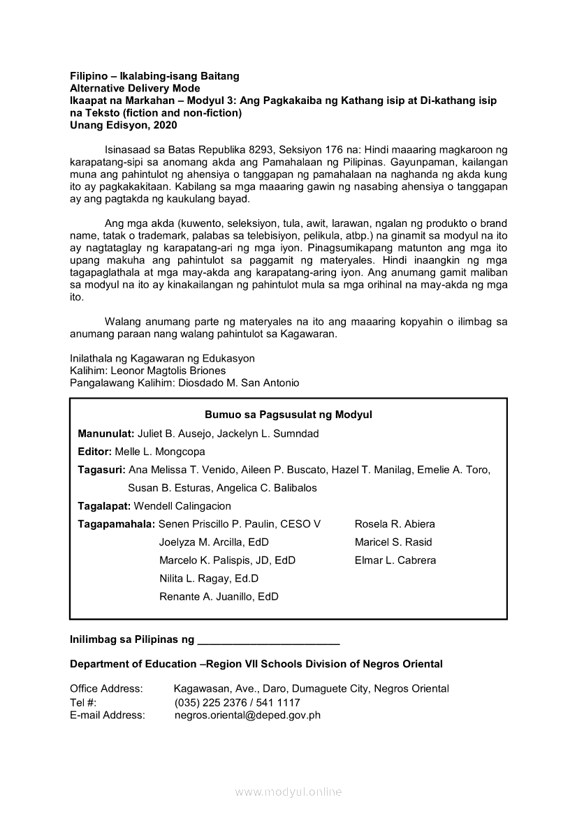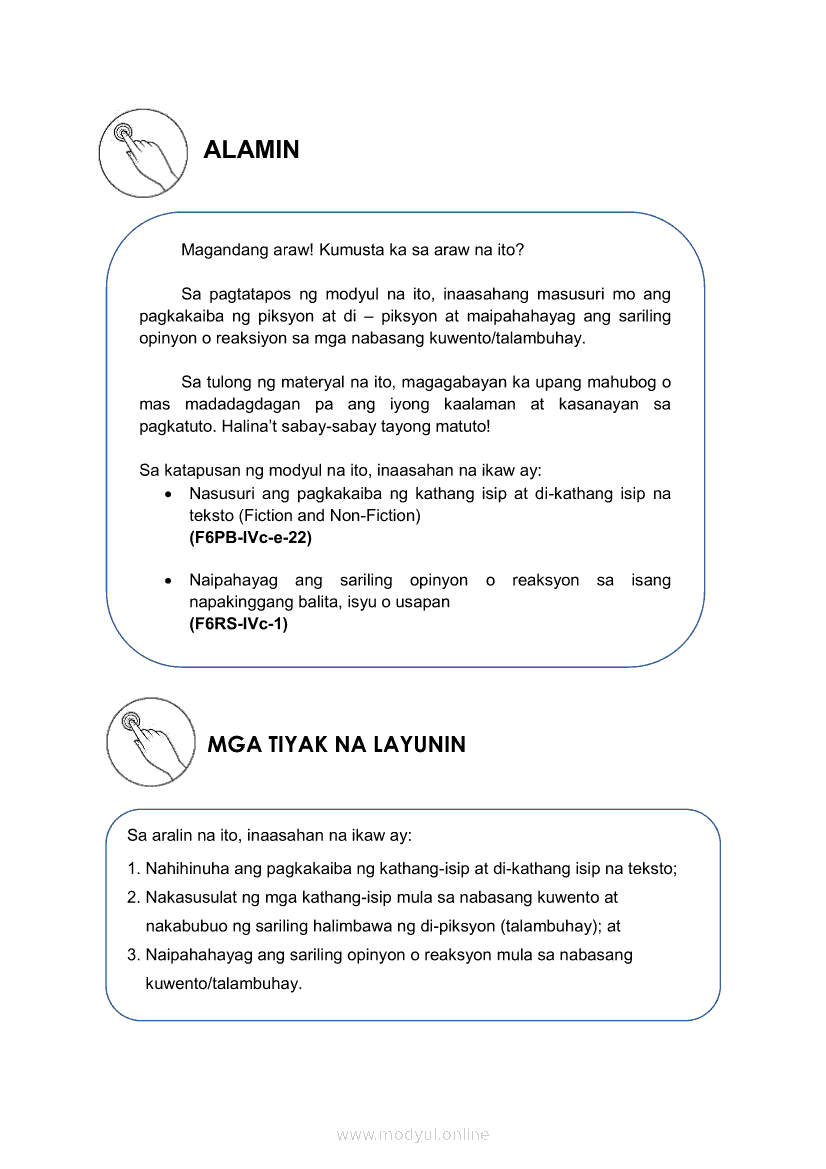 Filipino 6 Ikaapat na Markahan – Modyul 3: Ang Pagkakaiba ng Kathang Isip at Di-Kathang Isip na Teksto (Fiction and Non-Fiction)May 27, 2021 Grade 6Kiumo M901 Tablet for Kids — comprehensive protection in learning, safety, and entertainment for as low as **₱2,399!. Filipino 6 4th QuarterRelatedFilipino 6 Ikaapat na Markahan – Modyul 4: Uri ng PelikulaFilipino 6 Ika-apat na Markahan – Modyul 2: Salitang MagkakaugnayFilipino 6 Ikaapat na Markahan – Modyul 1: Paggamit ng Pangngalan sa PatalastasEdukasyon sa Pagpapakatao Ikaapat na Markahan – Modyul 8: Pananalig at Pag-asaEPP- ICT Quarter 4 – Module 2: Posts and Shares Materials on Wiki in Responsible Manner