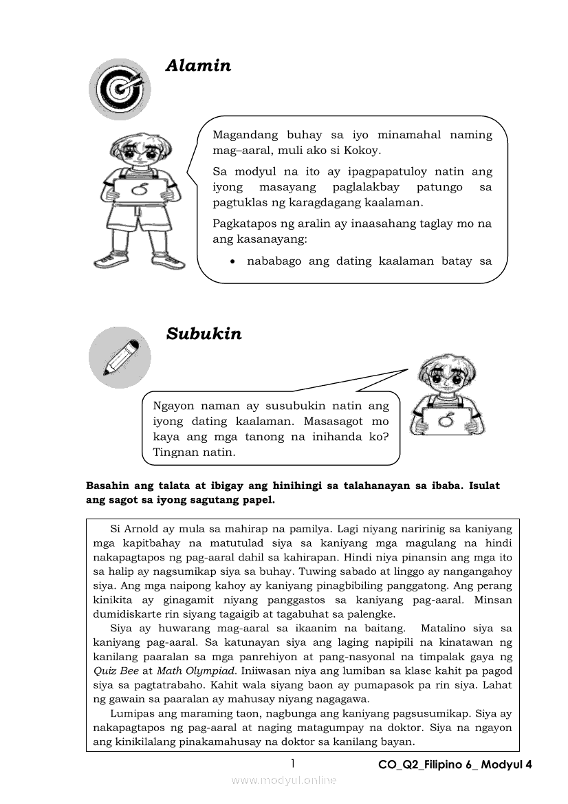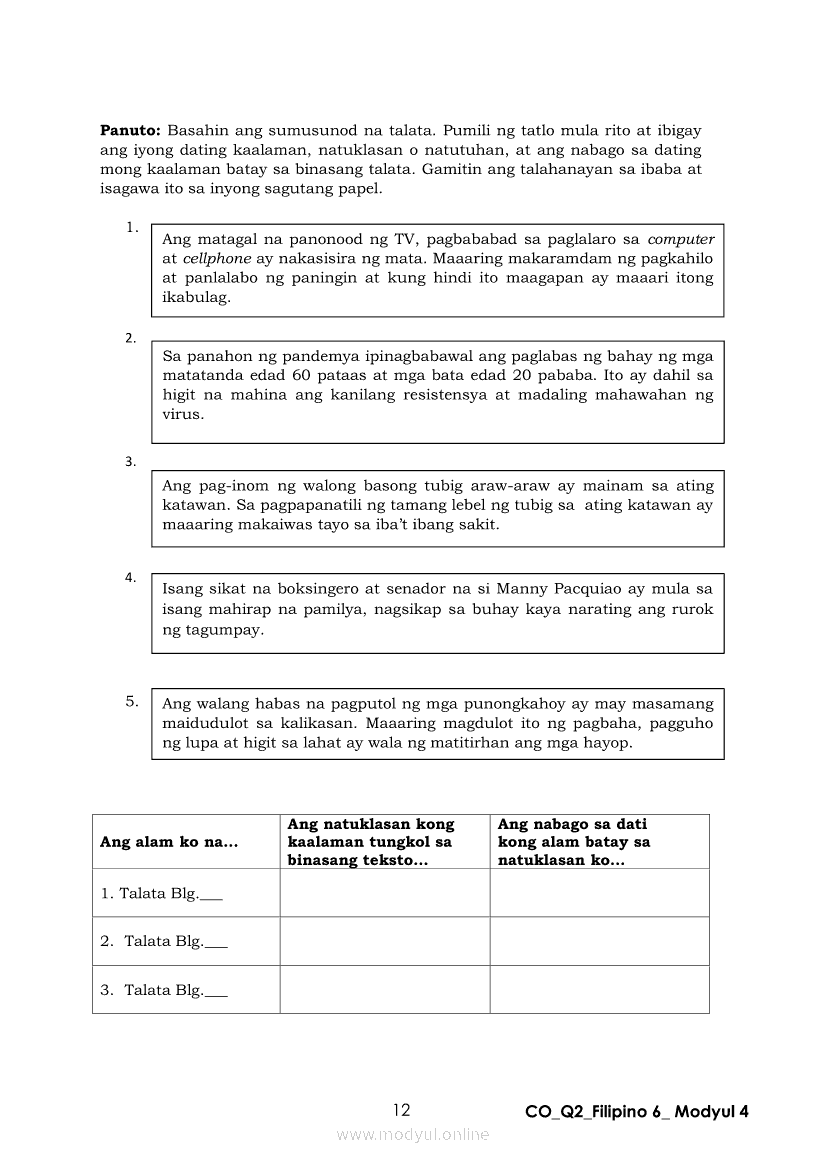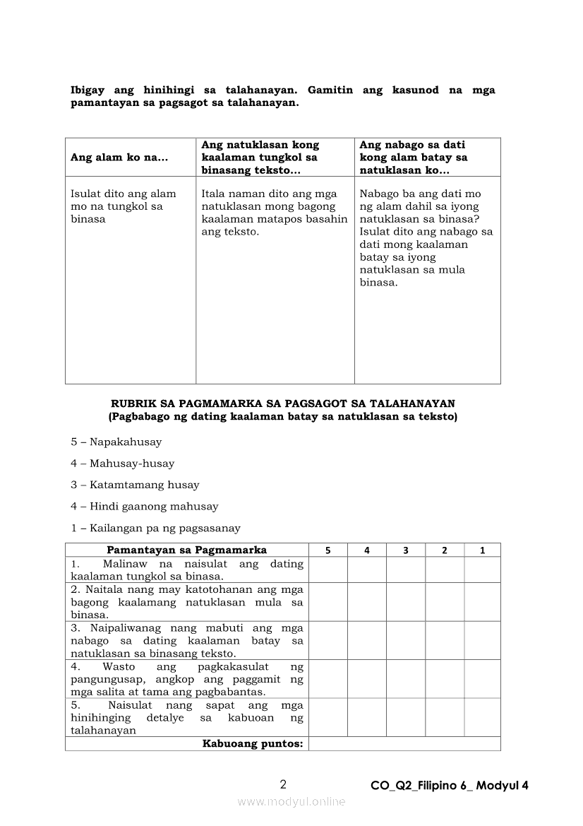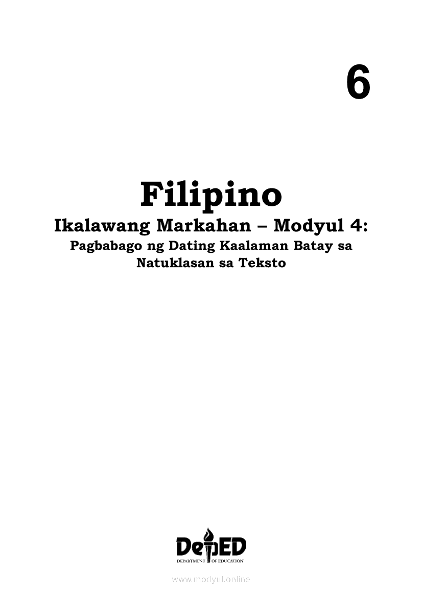 Filipino 6 Ikalawang Markahan – Modyul 4: Pagbabago ng Dating Kaalaman Batay sa Natuklasan sa TekstoApr 22, 2021 Grade 6Kiumo M901 Tablet for Kids — comprehensive protection in learning, safety, and entertainment for as low as **₱2,399!. Filipino 6RelatedFilipino 6 Ikaapat na Markahan – Modyul 3: Ang Pagkakaiba ng Kathang Isip at Di-Kathang Isip na Teksto (Fiction and Non-Fiction)Filipino 6 Ikaapat na Markahan – Modyul 4: Uri ng PelikulaFilipino 6 Ikaapat na Markahan – Modyul 1: Paggamit ng Pangngalan sa PatalastasFilipino 6 Ika-apat na Markahan – Modyul 2: Salitang MagkakaugnayFilipino 6 Modyul 1: Pagsagot sa mga Tanong Tungkol sa Napakinggan/Nabasang Pabula, Kuwento, Tekstong Pang-Impormasyon at Usapan