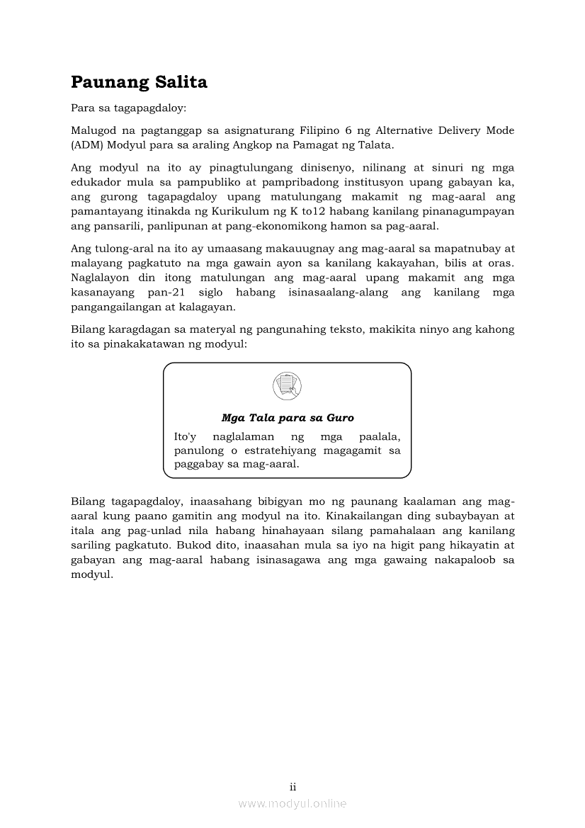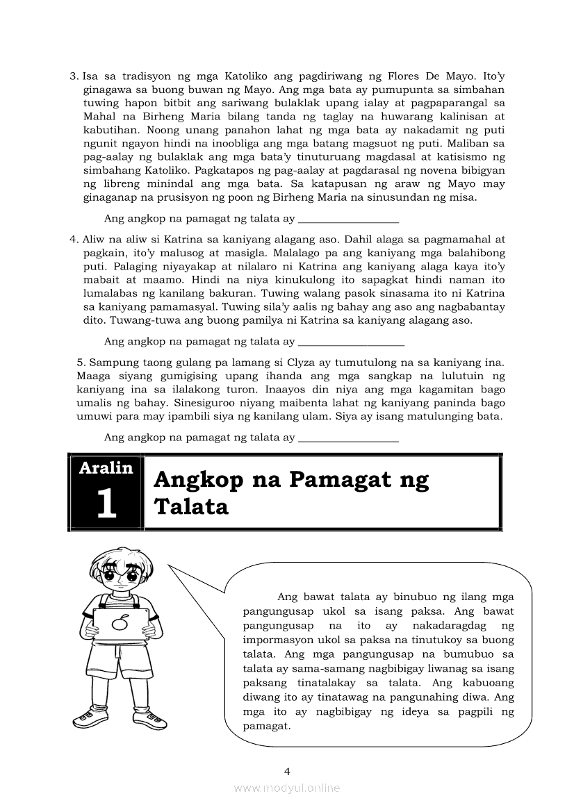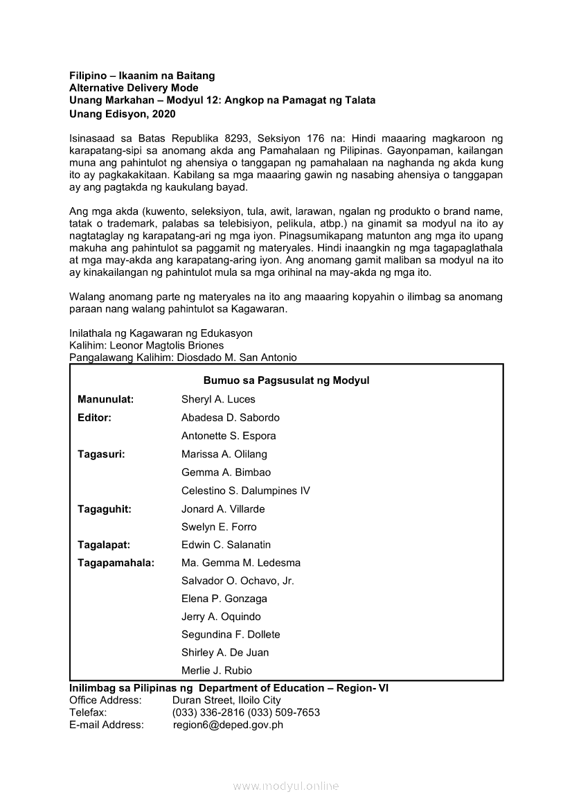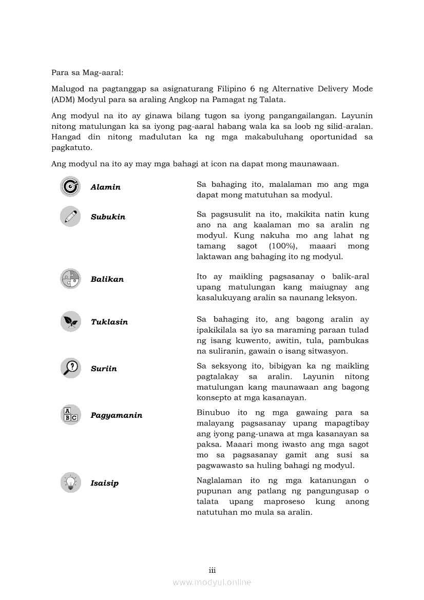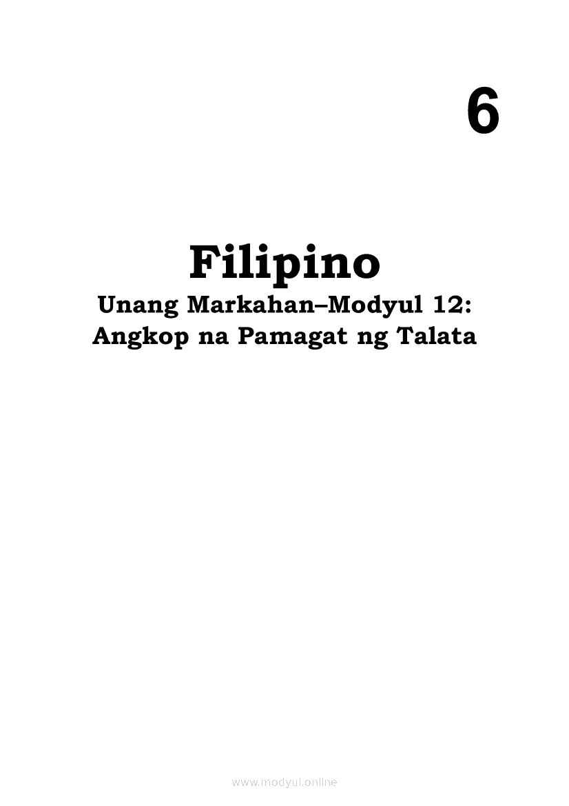 Filipino 6 Modyul 12: Angkop na Pamagat ng TalataApr 22, 2021 Grade 6Kiumo M901 Tablet for Kids — comprehensive protection in learning, safety, and entertainment for as low as **₱2,399!. Filipino 6RelatedFilipino 6 Ikaapat na Markahan – Modyul 4: Uri ng PelikulaFilipino 6 Ika-apat na Markahan – Modyul 2: Salitang MagkakaugnayFilipino 6 Ikaapat na Markahan – Modyul 3: Ang Pagkakaiba ng Kathang Isip at Di-Kathang Isip na Teksto (Fiction and Non-Fiction)Filipino 6 Ikaapat na Markahan – Modyul 1: Paggamit ng Pangngalan sa PatalastasFilipino 6 Modyul 1: Pagsagot sa mga Tanong Tungkol sa Napakinggan/Nabasang Pabula, Kuwento, Tekstong Pang-Impormasyon at Usapan