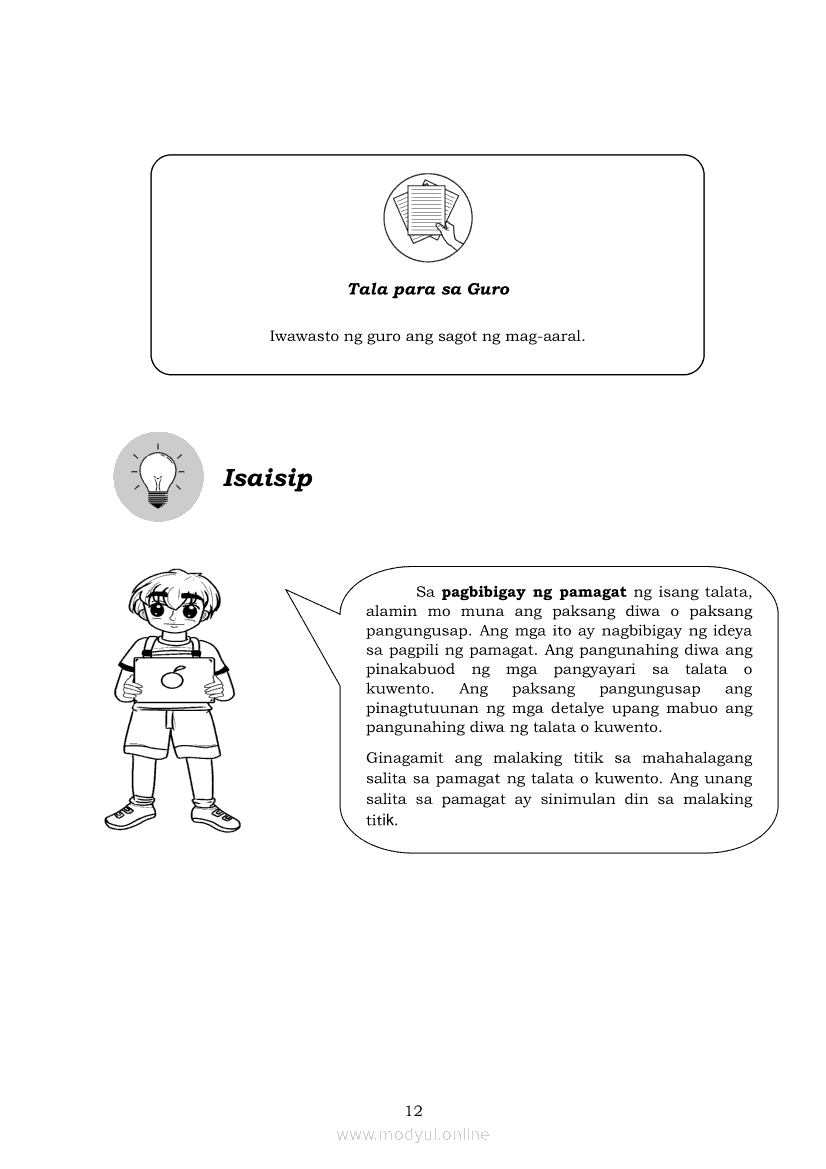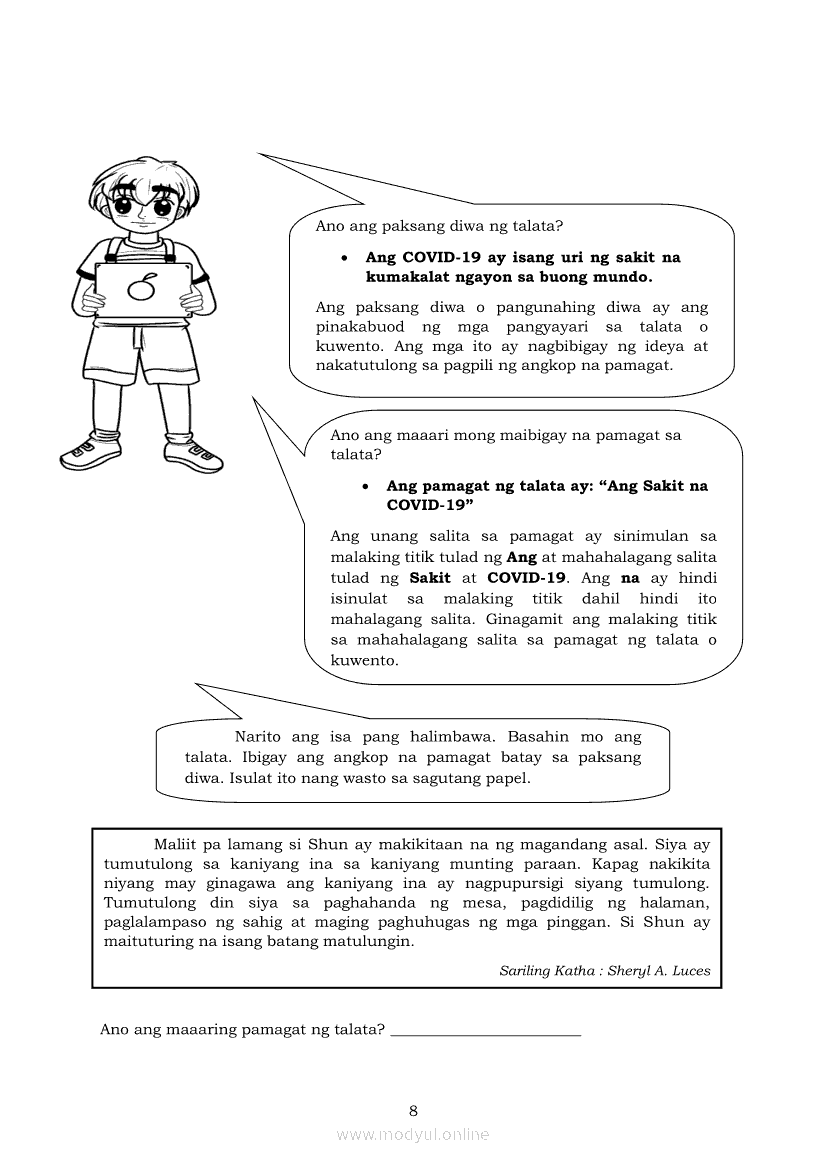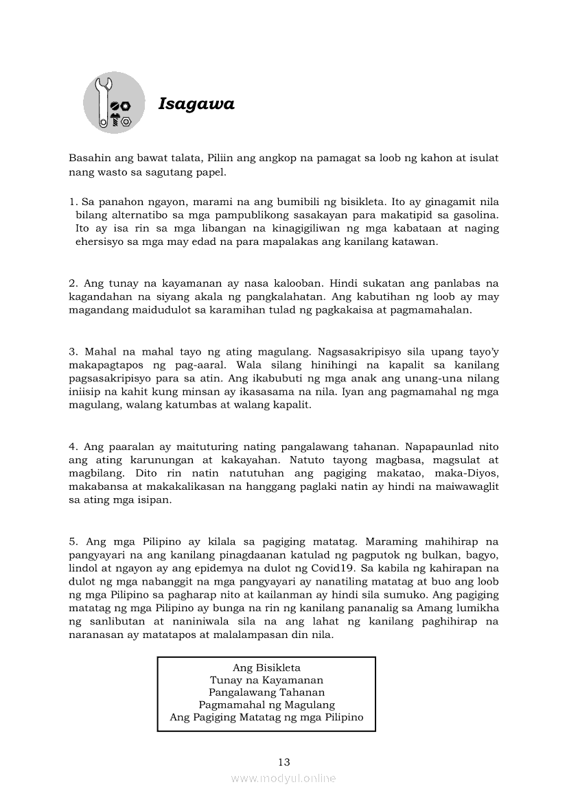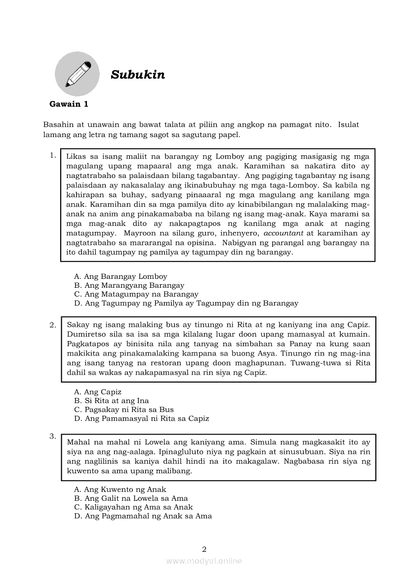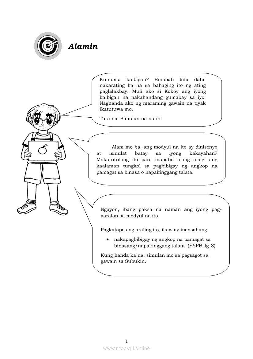 Filipino 6 Modyul 12: Angkop na Pamagat ng TalataApr 22, 2021 Grade 6Kiumo M901 Tablet for Kids — comprehensive protection in learning, safety, and entertainment for as low as **₱2,399!. Filipino 6RelatedFilipino 6 Ikaapat na Markahan – Modyul 4: Uri ng PelikulaFilipino 6 Ika-apat na Markahan – Modyul 2: Salitang MagkakaugnayFilipino 6 Ikaapat na Markahan – Modyul 3: Ang Pagkakaiba ng Kathang Isip at Di-Kathang Isip na Teksto (Fiction and Non-Fiction)Filipino 6 Ikaapat na Markahan – Modyul 1: Paggamit ng Pangngalan sa PatalastasFilipino 6 Modyul 1: Pagsagot sa mga Tanong Tungkol sa Napakinggan/Nabasang Pabula, Kuwento, Tekstong Pang-Impormasyon at Usapan