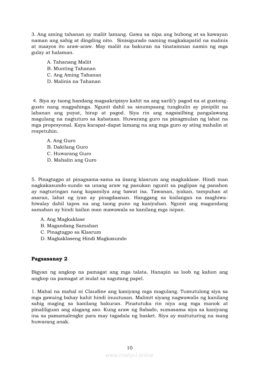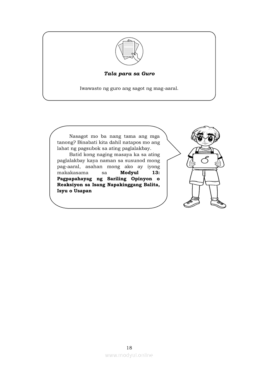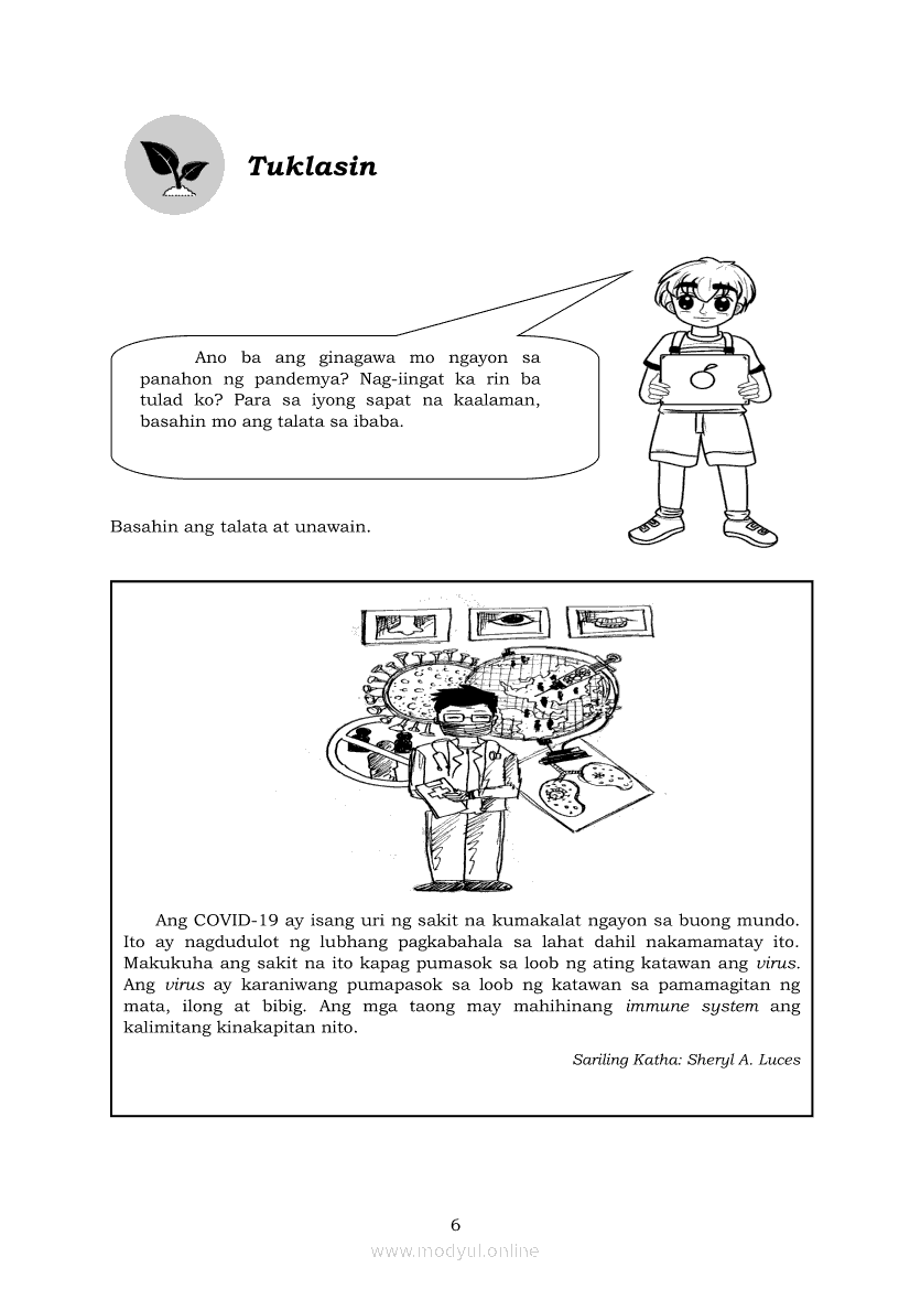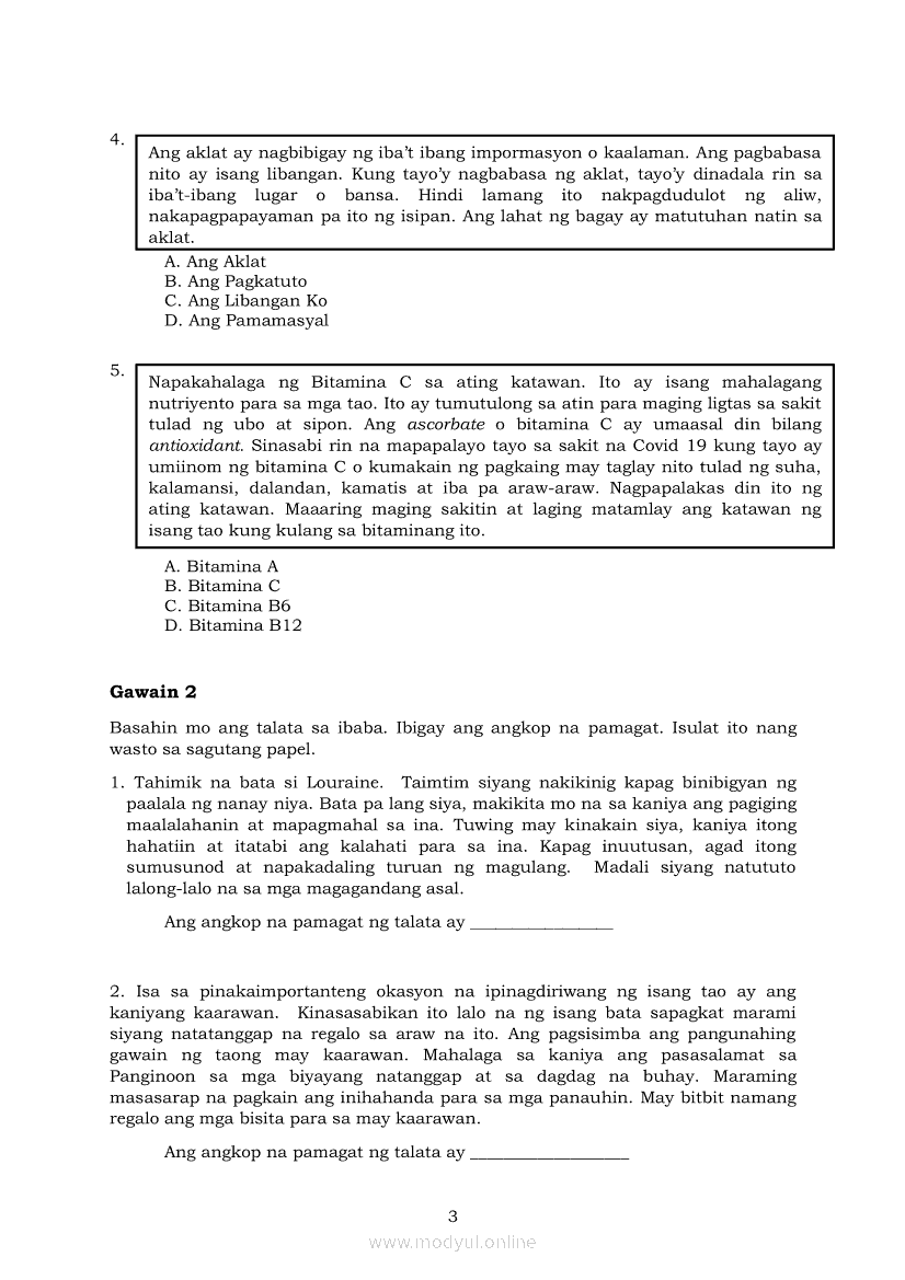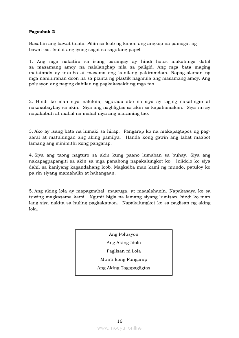 Filipino 6 Modyul 12: Angkop na Pamagat ng TalataApr 22, 2021 Grade 6Kiumo M901 Tablet for Kids — comprehensive protection in learning, safety, and entertainment for as low as **₱2,399!. Filipino 6RelatedFilipino 6 Ikaapat na Markahan – Modyul 4: Uri ng PelikulaFilipino 6 Ika-apat na Markahan – Modyul 2: Salitang MagkakaugnayFilipino 6 Ikaapat na Markahan – Modyul 3: Ang Pagkakaiba ng Kathang Isip at Di-Kathang Isip na Teksto (Fiction and Non-Fiction)Filipino 6 Ikaapat na Markahan – Modyul 1: Paggamit ng Pangngalan sa PatalastasFilipino 6 Modyul 1: Pagsagot sa mga Tanong Tungkol sa Napakinggan/Nabasang Pabula, Kuwento, Tekstong Pang-Impormasyon at Usapan