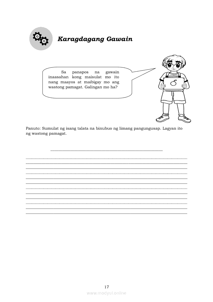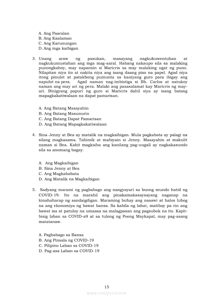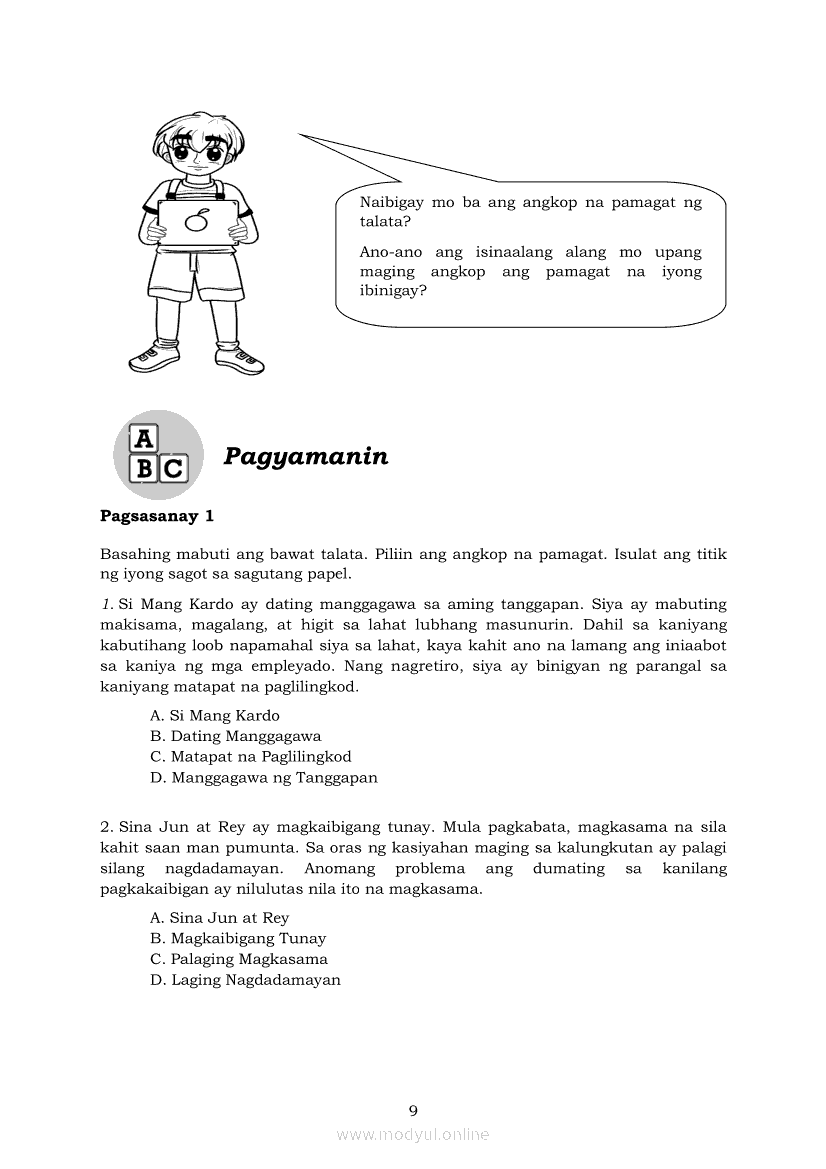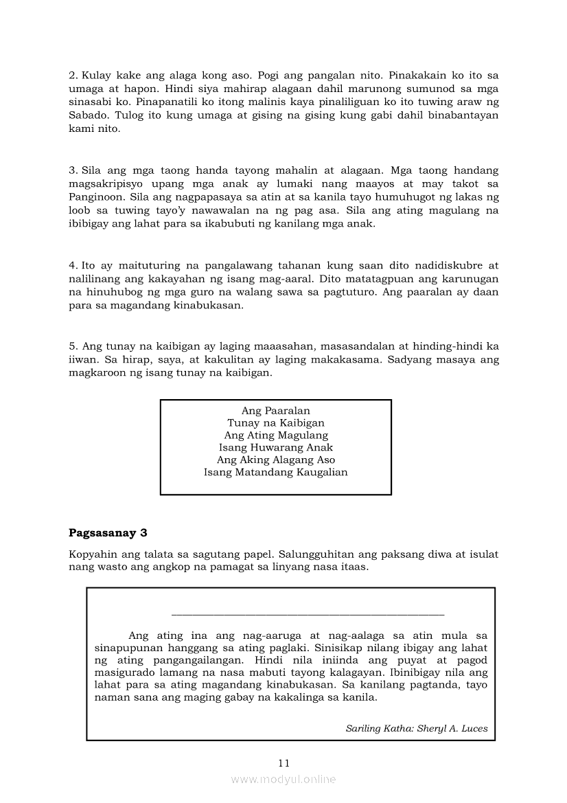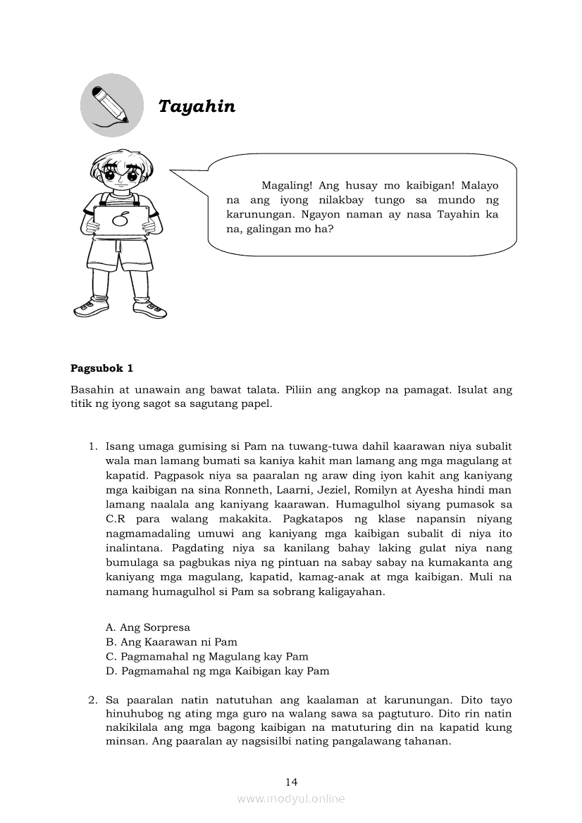 Filipino 6 Modyul 12: Angkop na Pamagat ng TalataApr 22, 2021 Grade 6Kiumo M901 Tablet for Kids — comprehensive protection in learning, safety, and entertainment for as low as **₱2,399!. Filipino 6RelatedFilipino 6 Ikaapat na Markahan – Modyul 4: Uri ng PelikulaFilipino 6 Ika-apat na Markahan – Modyul 2: Salitang MagkakaugnayFilipino 6 Ikaapat na Markahan – Modyul 3: Ang Pagkakaiba ng Kathang Isip at Di-Kathang Isip na Teksto (Fiction and Non-Fiction)Filipino 6 Ikaapat na Markahan – Modyul 1: Paggamit ng Pangngalan sa PatalastasFilipino 6 Modyul 1: Pagsagot sa mga Tanong Tungkol sa Napakinggan/Nabasang Pabula, Kuwento, Tekstong Pang-Impormasyon at Usapan
