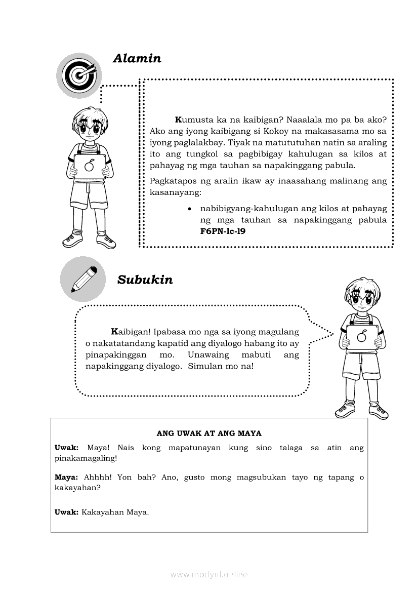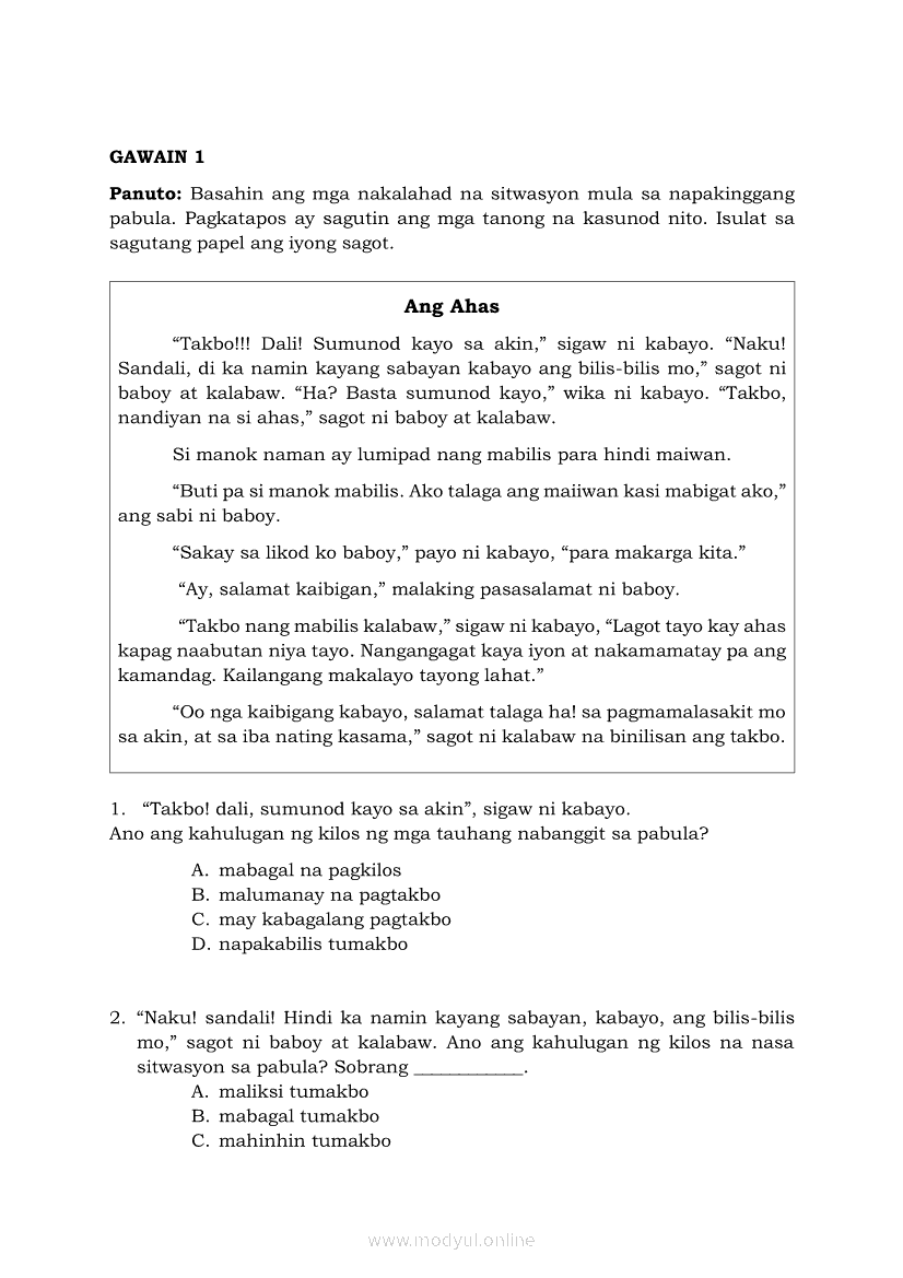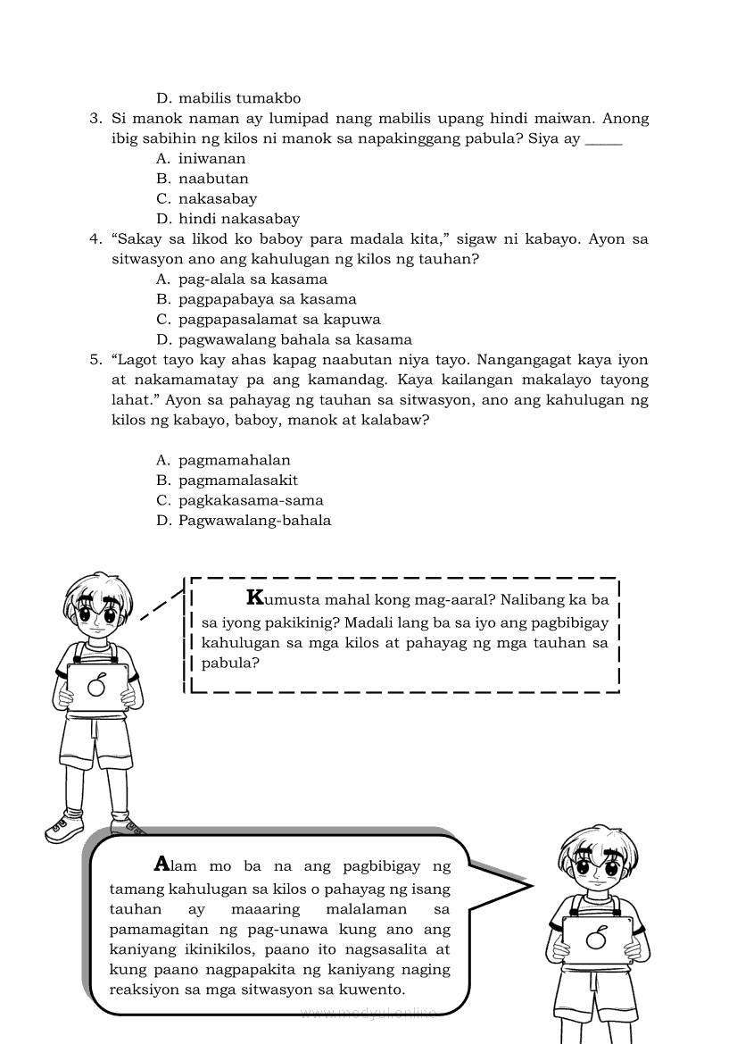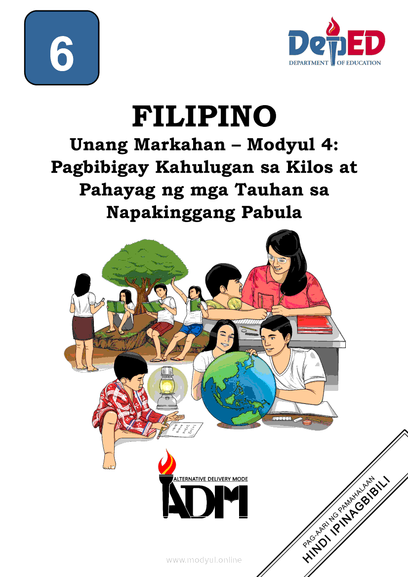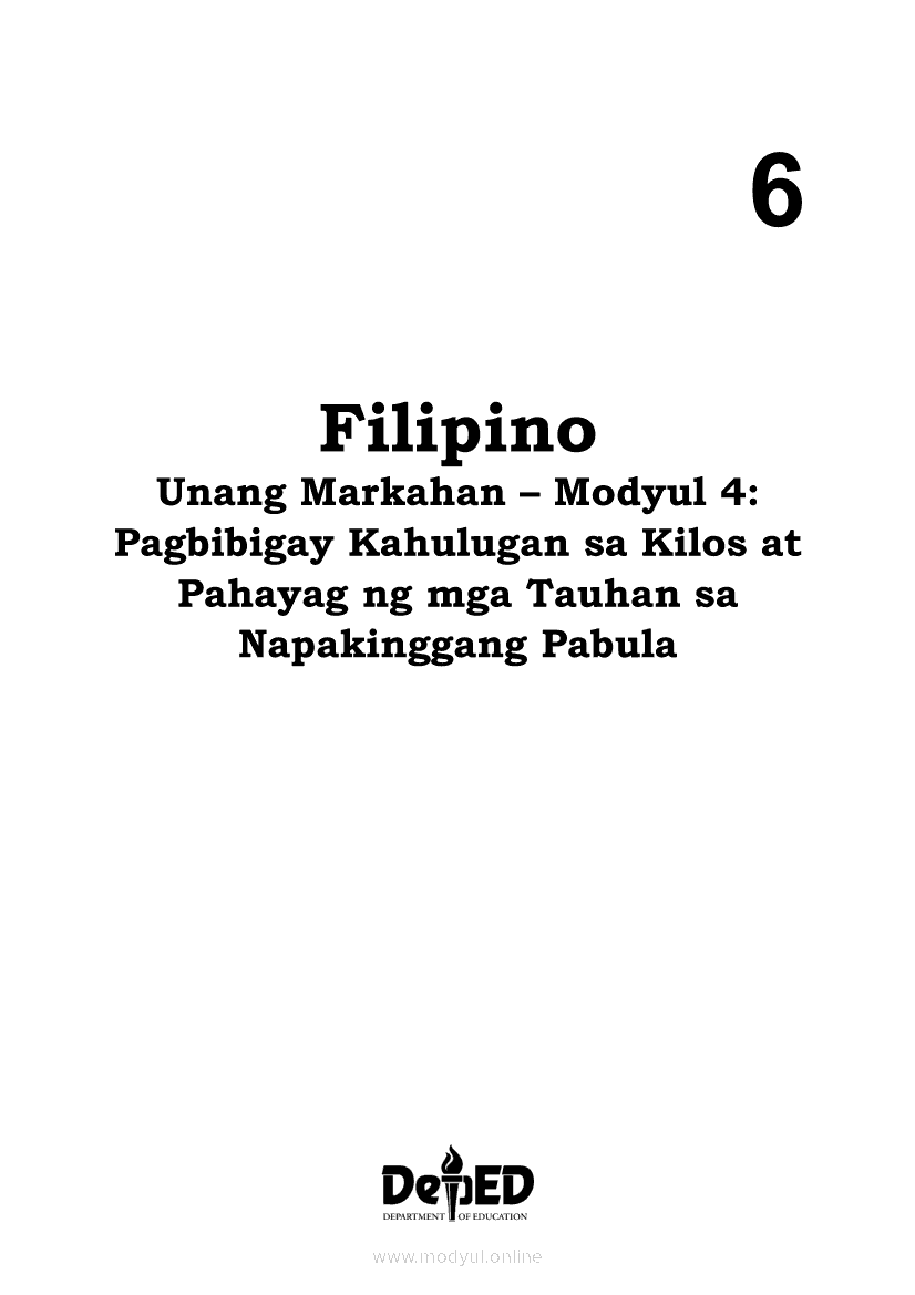 Filipino 6 Modyul 4: Pagbibigay Kahulugan sa Kilos at Pahayag ng mga Tauhan sa Napakinggang PabulaApr 22, 2021 Grade 6Kiumo M901 Tablet for Kids — comprehensive protection in learning, safety, and entertainment for as low as **₱2,399!. Filipino 6RelatedFilipino 6 Ikaapat na Markahan – Modyul 4: Uri ng PelikulaFilipino 6 Ikaapat na Markahan – Modyul 1: Paggamit ng Pangngalan sa PatalastasFilipino 6 Ikaapat na Markahan – Modyul 3: Ang Pagkakaiba ng Kathang Isip at Di-Kathang Isip na Teksto (Fiction and Non-Fiction)Filipino 6 Ika-apat na Markahan – Modyul 2: Salitang MagkakaugnayFilipino 6 Modyul 1: Pagsagot sa mga Tanong Tungkol sa Napakinggan/Nabasang Pabula, Kuwento, Tekstong Pang-Impormasyon at Usapan