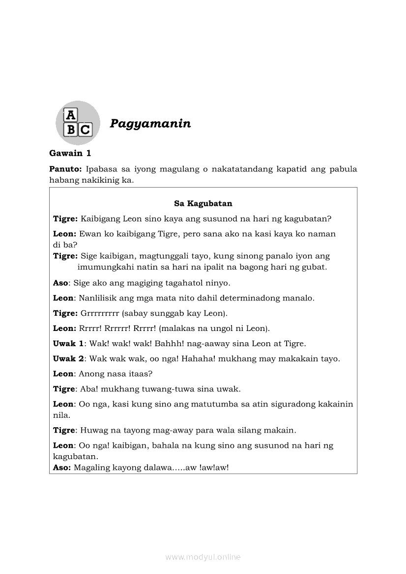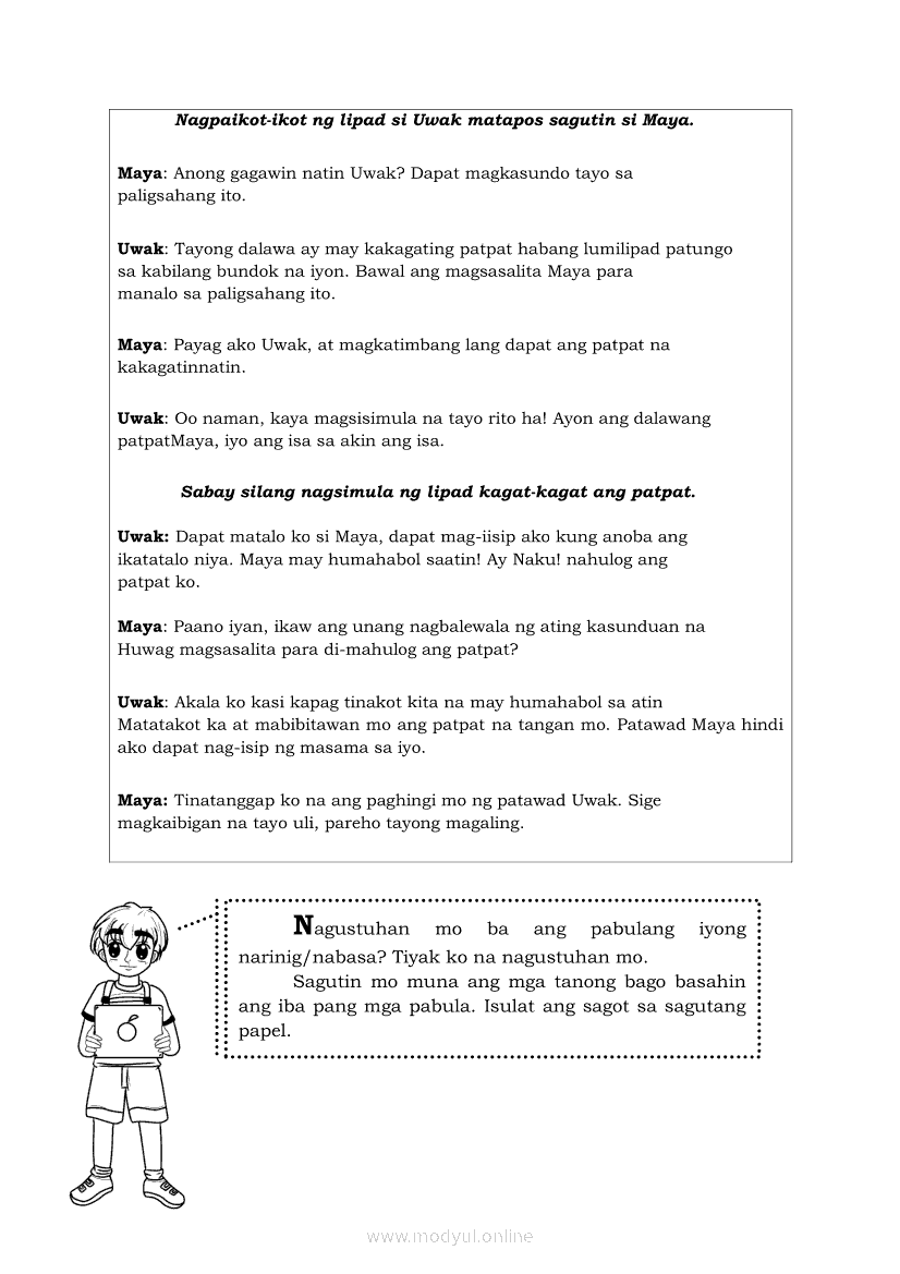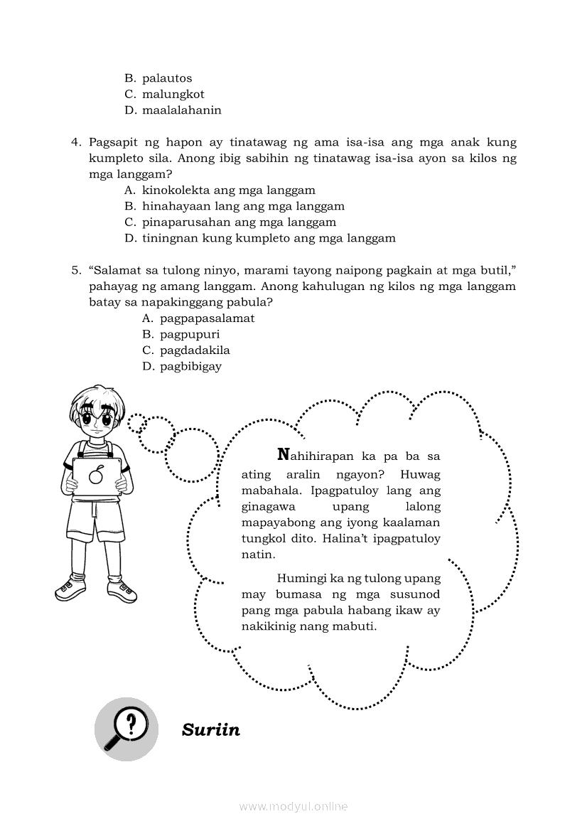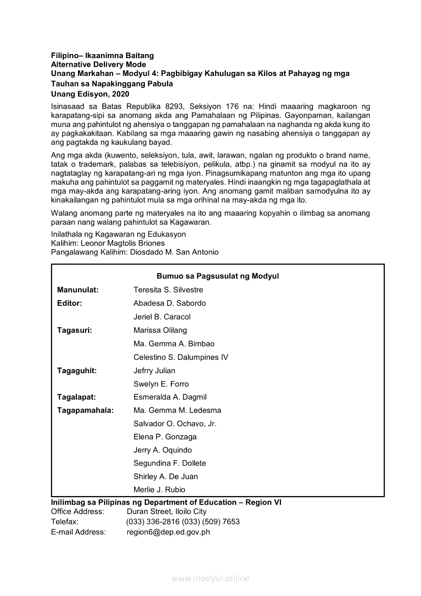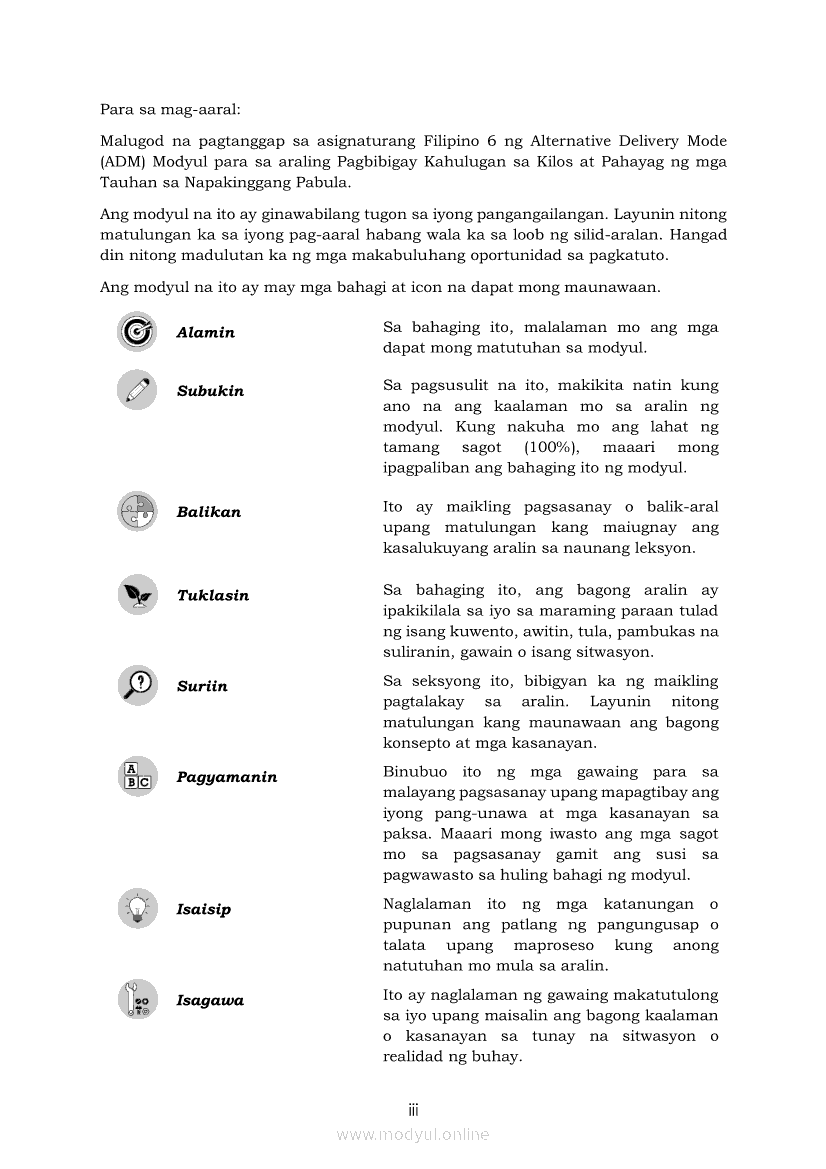 Filipino 6 Modyul 4: Pagbibigay Kahulugan sa Kilos at Pahayag ng mga Tauhan sa Napakinggang PabulaApr 22, 2021 Grade 6Kiumo M901 Tablet for Kids — comprehensive protection in learning, safety, and entertainment for as low as **₱2,399!. Filipino 6RelatedFilipino 6 Ikaapat na Markahan – Modyul 4: Uri ng PelikulaFilipino 6 Ikaapat na Markahan – Modyul 1: Paggamit ng Pangngalan sa PatalastasFilipino 6 Ikaapat na Markahan – Modyul 3: Ang Pagkakaiba ng Kathang Isip at Di-Kathang Isip na Teksto (Fiction and Non-Fiction)Filipino 6 Ika-apat na Markahan – Modyul 2: Salitang MagkakaugnayFilipino 6 Modyul 1: Pagsagot sa mga Tanong Tungkol sa Napakinggan/Nabasang Pabula, Kuwento, Tekstong Pang-Impormasyon at Usapan
