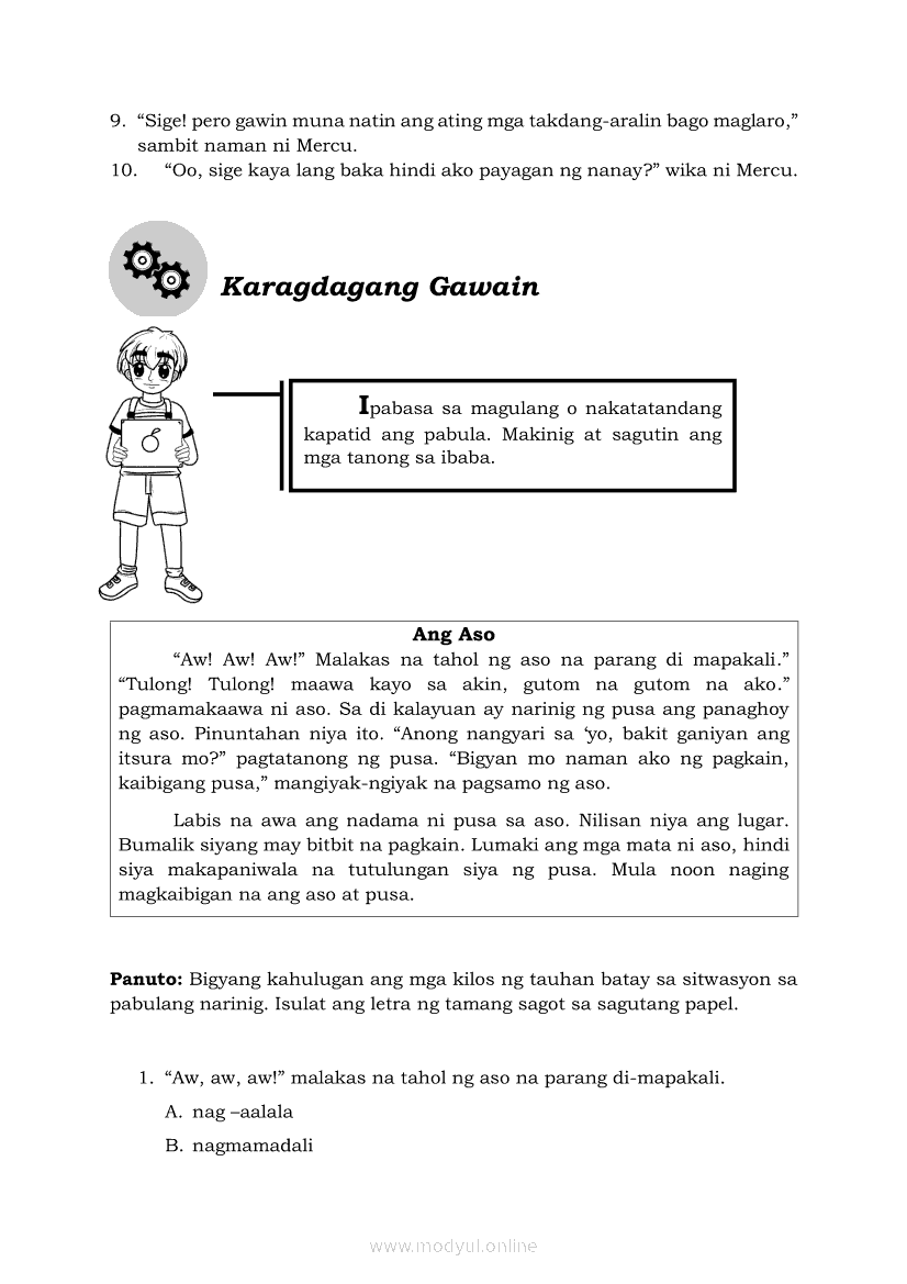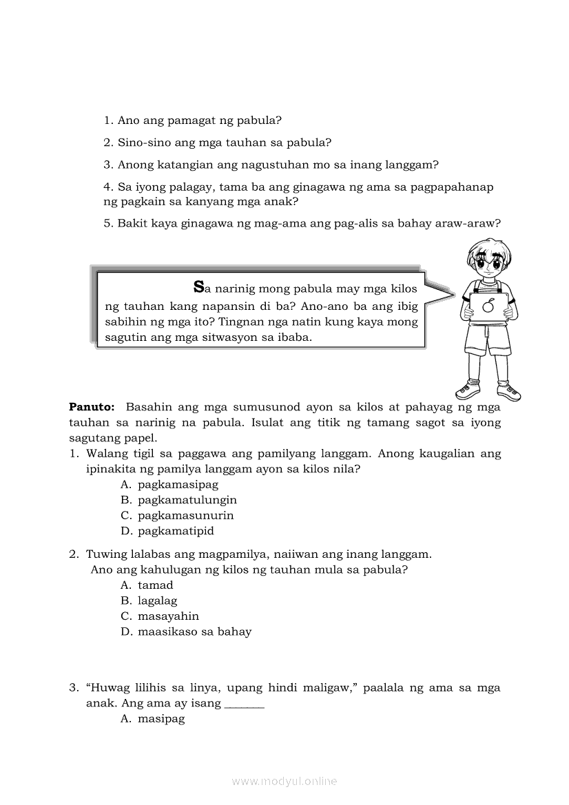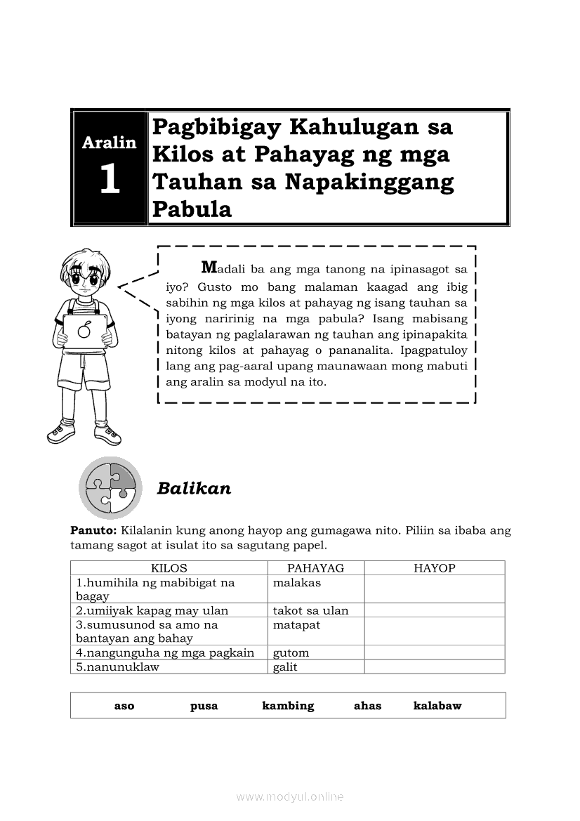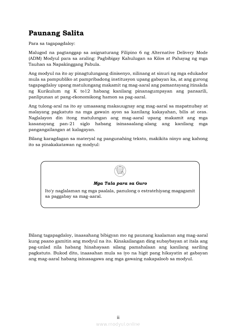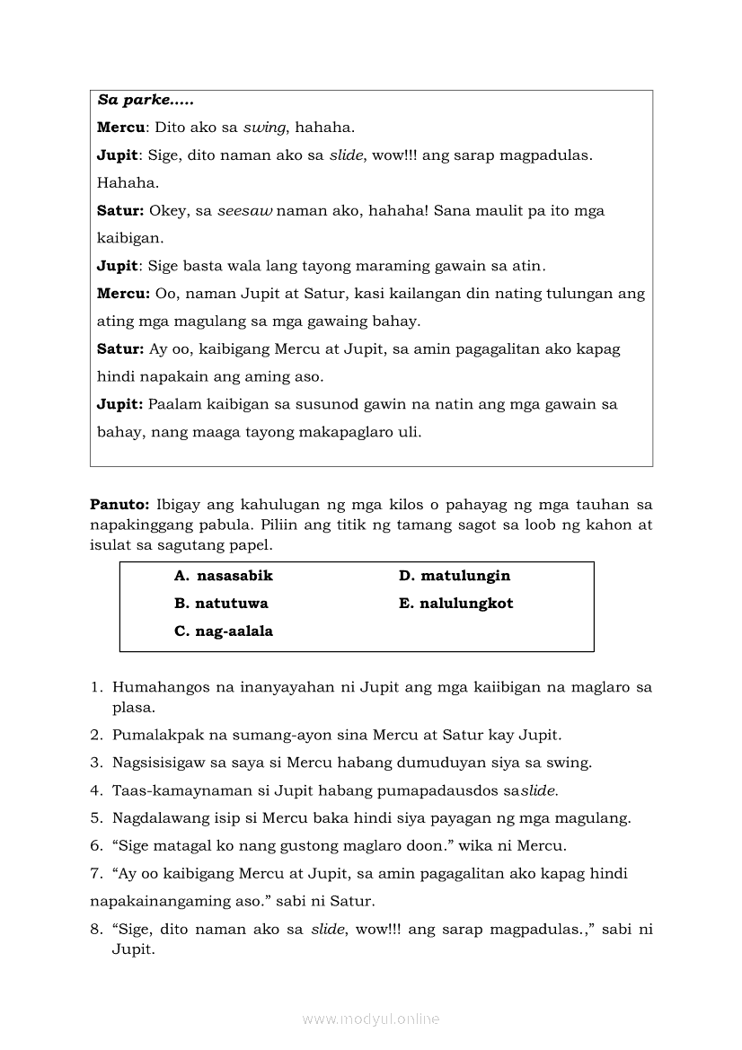 Filipino 6 Modyul 4: Pagbibigay Kahulugan sa Kilos at Pahayag ng mga Tauhan sa Napakinggang PabulaApr 22, 2021 Grade 6Kiumo M901 Tablet for Kids — comprehensive protection in learning, safety, and entertainment for as low as **₱2,399!. Filipino 6RelatedFilipino 6 Ikaapat na Markahan – Modyul 4: Uri ng PelikulaFilipino 6 Ikaapat na Markahan – Modyul 1: Paggamit ng Pangngalan sa PatalastasFilipino 6 Ikaapat na Markahan – Modyul 3: Ang Pagkakaiba ng Kathang Isip at Di-Kathang Isip na Teksto (Fiction and Non-Fiction)Filipino 6 Ika-apat na Markahan – Modyul 2: Salitang MagkakaugnayFilipino 6 Modyul 1: Pagsagot sa mga Tanong Tungkol sa Napakinggan/Nabasang Pabula, Kuwento, Tekstong Pang-Impormasyon at Usapan