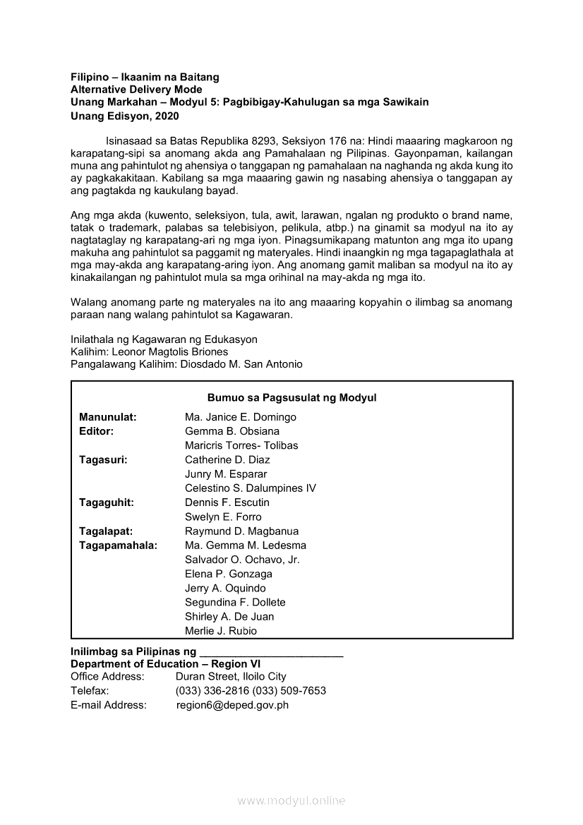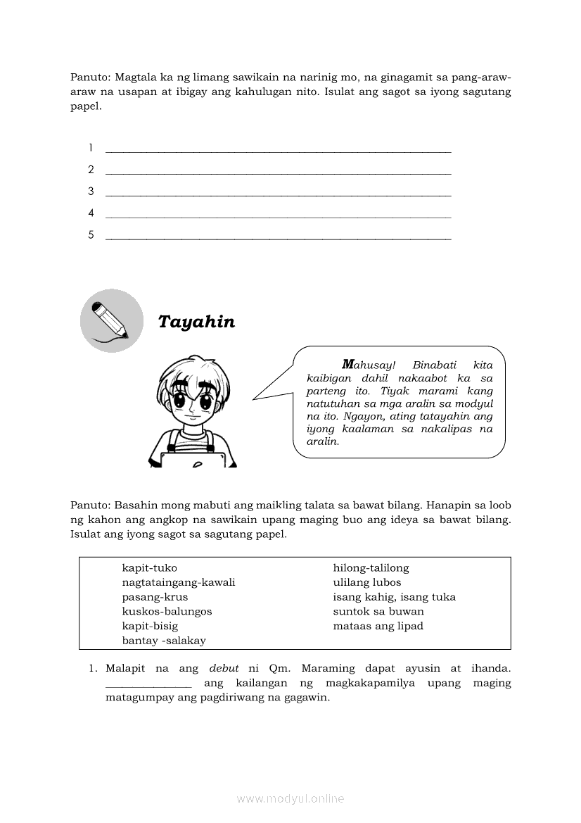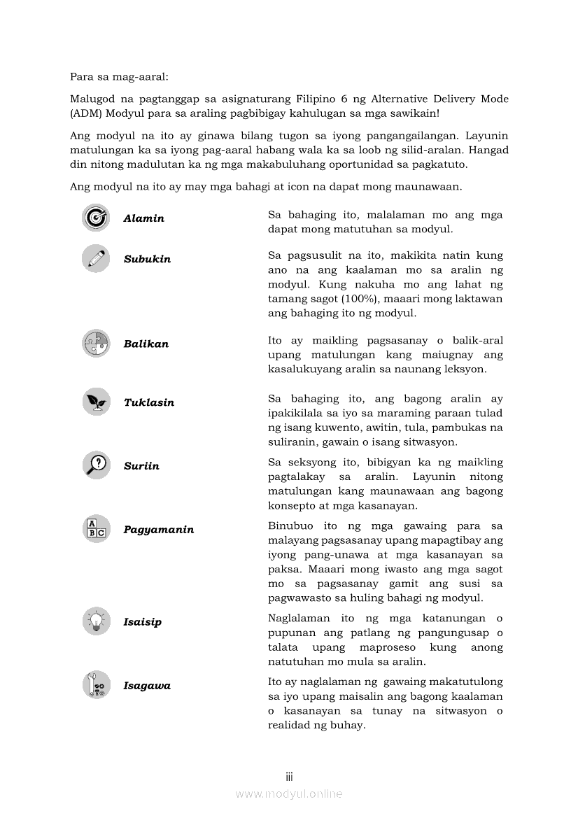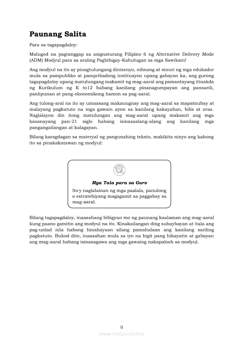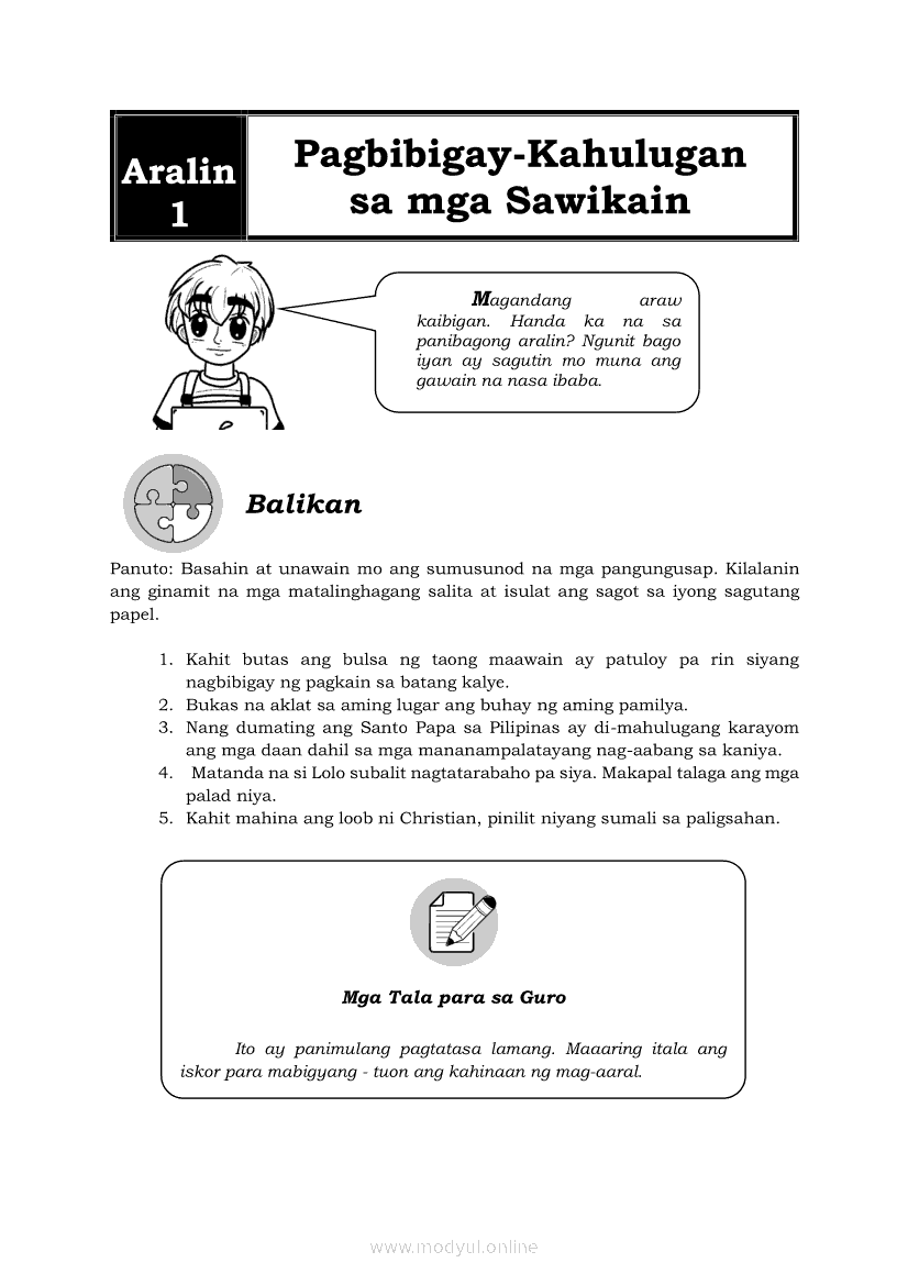 Filipino 6 Modyul 5: Pagbibigay-Kahulugan sa mga SawikainApr 22, 2021 Grade 6Kiumo M901 Tablet for Kids — comprehensive protection in learning, safety, and entertainment for as low as **₱2,399!. Filipino 6RelatedFilipino 6 Ikaapat na Markahan – Modyul 1: Paggamit ng Pangngalan sa PatalastasFilipino 6 Ikaapat na Markahan – Modyul 4: Uri ng PelikulaFilipino 6 Ikaapat na Markahan – Modyul 3: Ang Pagkakaiba ng Kathang Isip at Di-Kathang Isip na Teksto (Fiction and Non-Fiction)Filipino 6 Ika-apat na Markahan – Modyul 2: Salitang MagkakaugnayFilipino 6 Modyul 1: Pagsagot sa mga Tanong Tungkol sa Napakinggan/Nabasang Pabula, Kuwento, Tekstong Pang-Impormasyon at Usapan