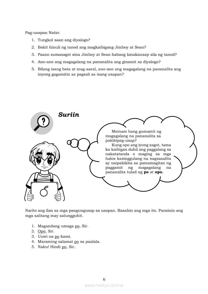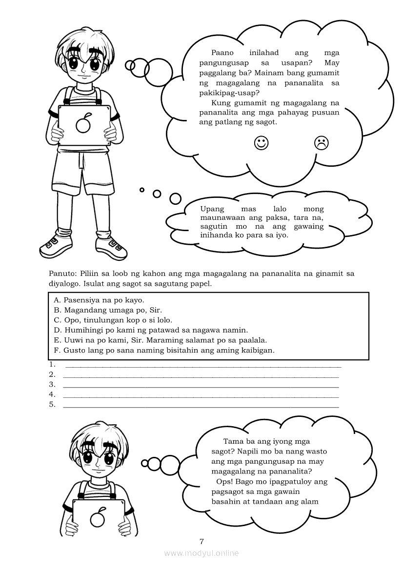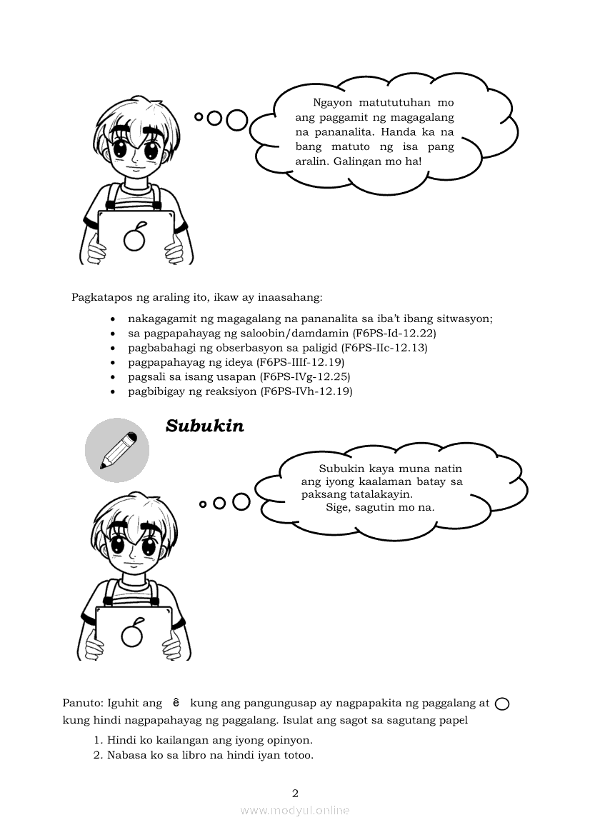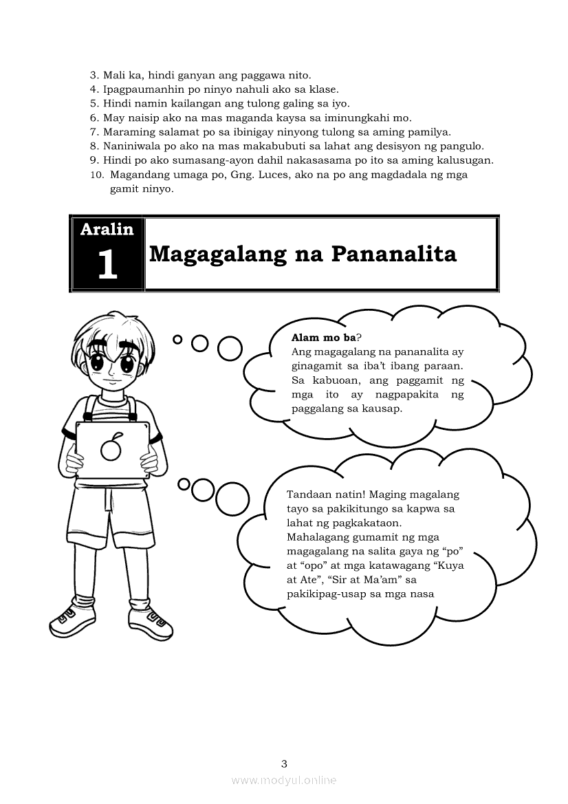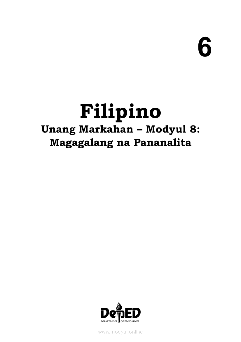 Filipino 6 Modyul 8: Magagalang na PananalitaApr 22, 2021 Grade 6Kiumo M901 Tablet for Kids — comprehensive protection in learning, safety, and entertainment for as low as **₱2,399!. Filipino 6RelatedFilipino 6 Ikaapat na Markahan – Modyul 3: Ang Pagkakaiba ng Kathang Isip at Di-Kathang Isip na Teksto (Fiction and Non-Fiction)Filipino 6 Ikaapat na Markahan – Modyul 4: Uri ng PelikulaFilipino 6 Ikaapat na Markahan – Modyul 1: Paggamit ng Pangngalan sa PatalastasFilipino 6 Ika-apat na Markahan – Modyul 2: Salitang MagkakaugnayFilipino 6 Modyul 1: Pagsagot sa mga Tanong Tungkol sa Napakinggan/Nabasang Pabula, Kuwento, Tekstong Pang-Impormasyon at Usapan