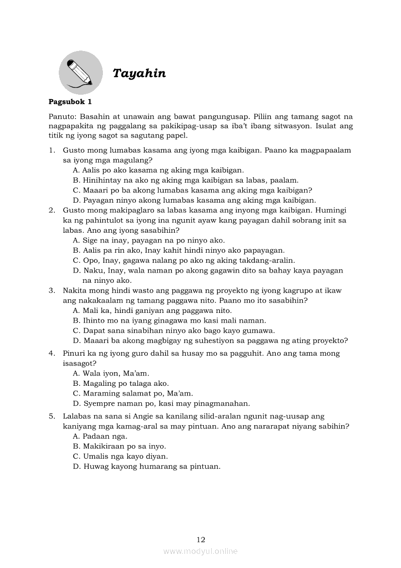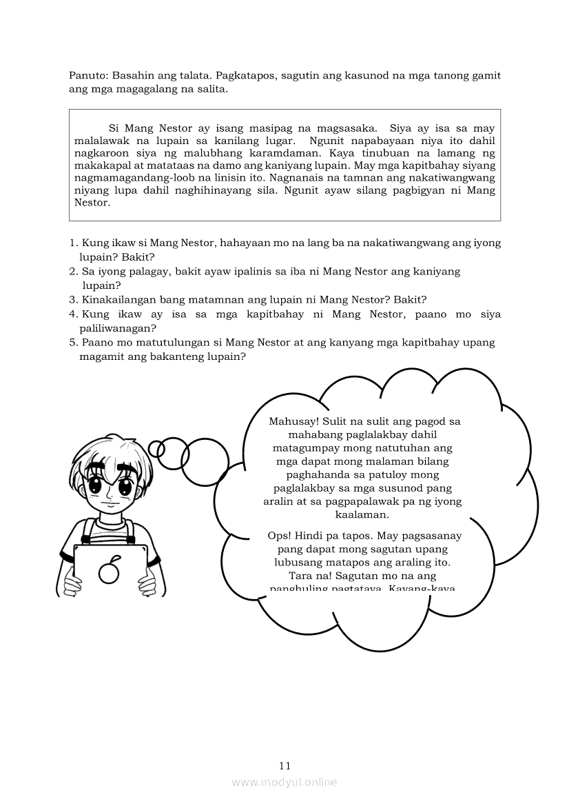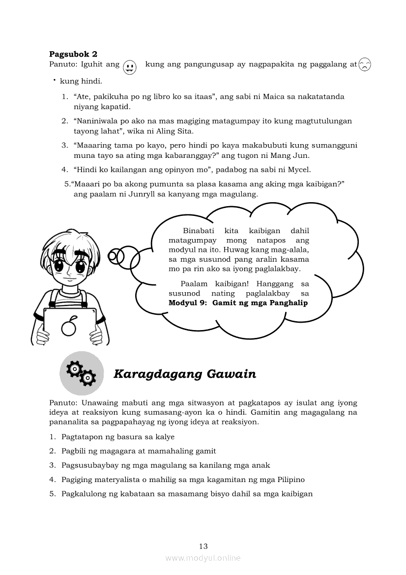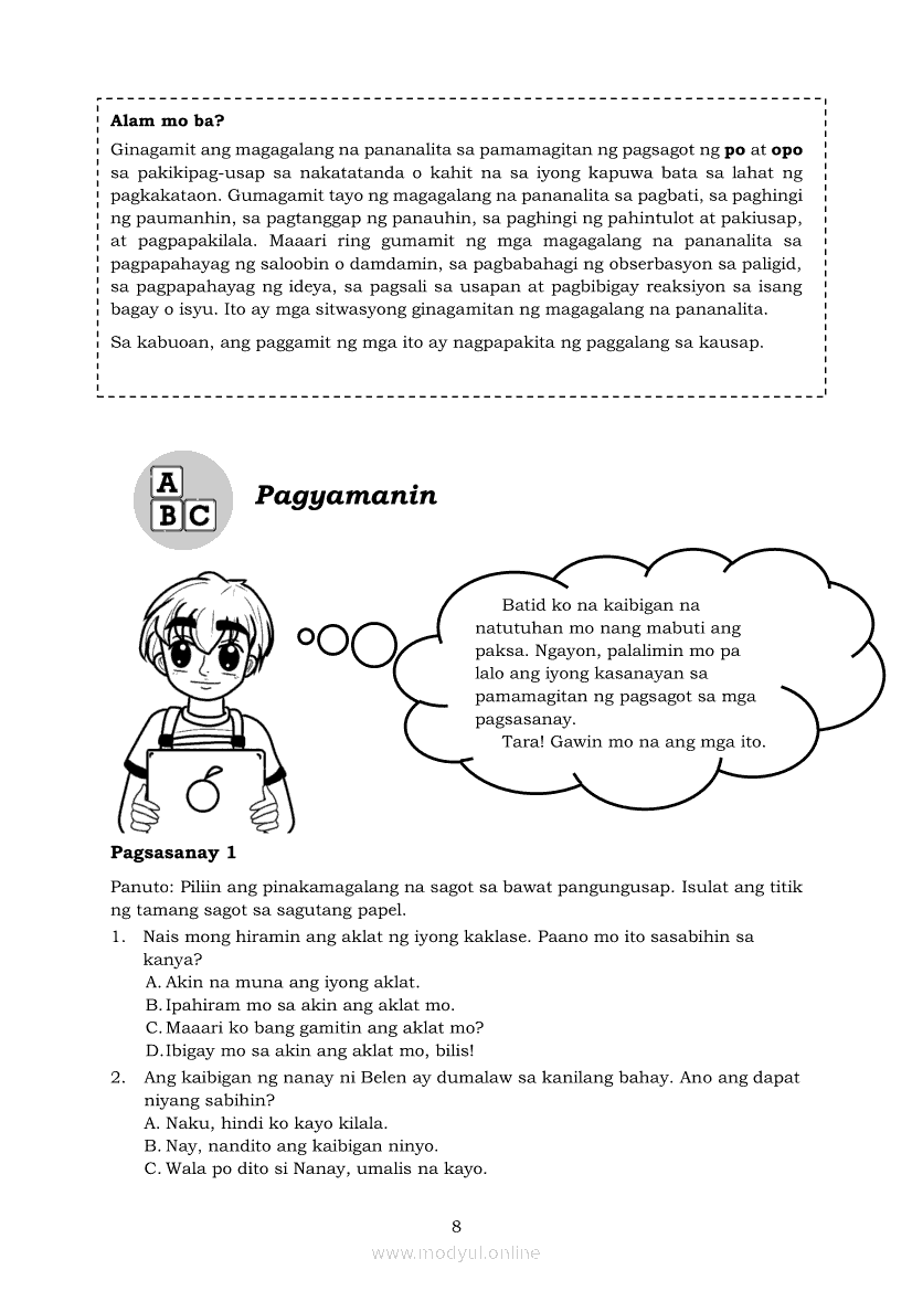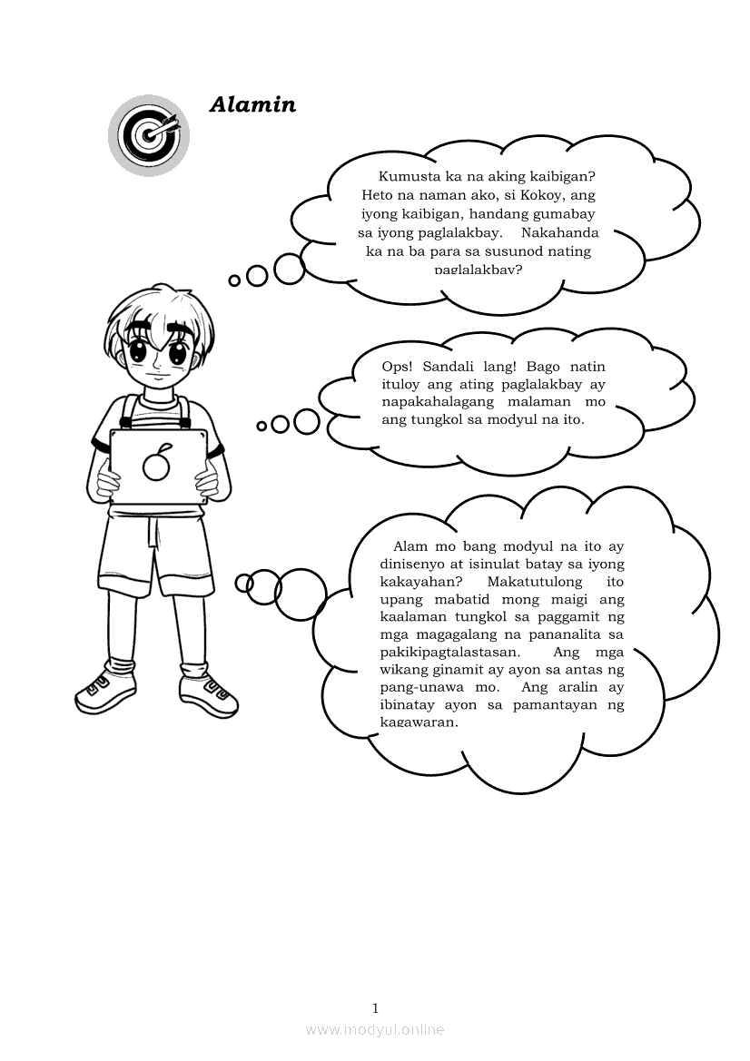 Filipino 6 Modyul 8: Magagalang na PananalitaApr 22, 2021 Grade 6Kiumo M901 Tablet for Kids — comprehensive protection in learning, safety, and entertainment for as low as **₱2,399!. Filipino 6RelatedFilipino 6 Ikaapat na Markahan – Modyul 3: Ang Pagkakaiba ng Kathang Isip at Di-Kathang Isip na Teksto (Fiction and Non-Fiction)Filipino 6 Ikaapat na Markahan – Modyul 4: Uri ng PelikulaFilipino 6 Ikaapat na Markahan – Modyul 1: Paggamit ng Pangngalan sa PatalastasFilipino 6 Ika-apat na Markahan – Modyul 2: Salitang MagkakaugnayFilipino 6 Modyul 1: Pagsagot sa mga Tanong Tungkol sa Napakinggan/Nabasang Pabula, Kuwento, Tekstong Pang-Impormasyon at Usapan