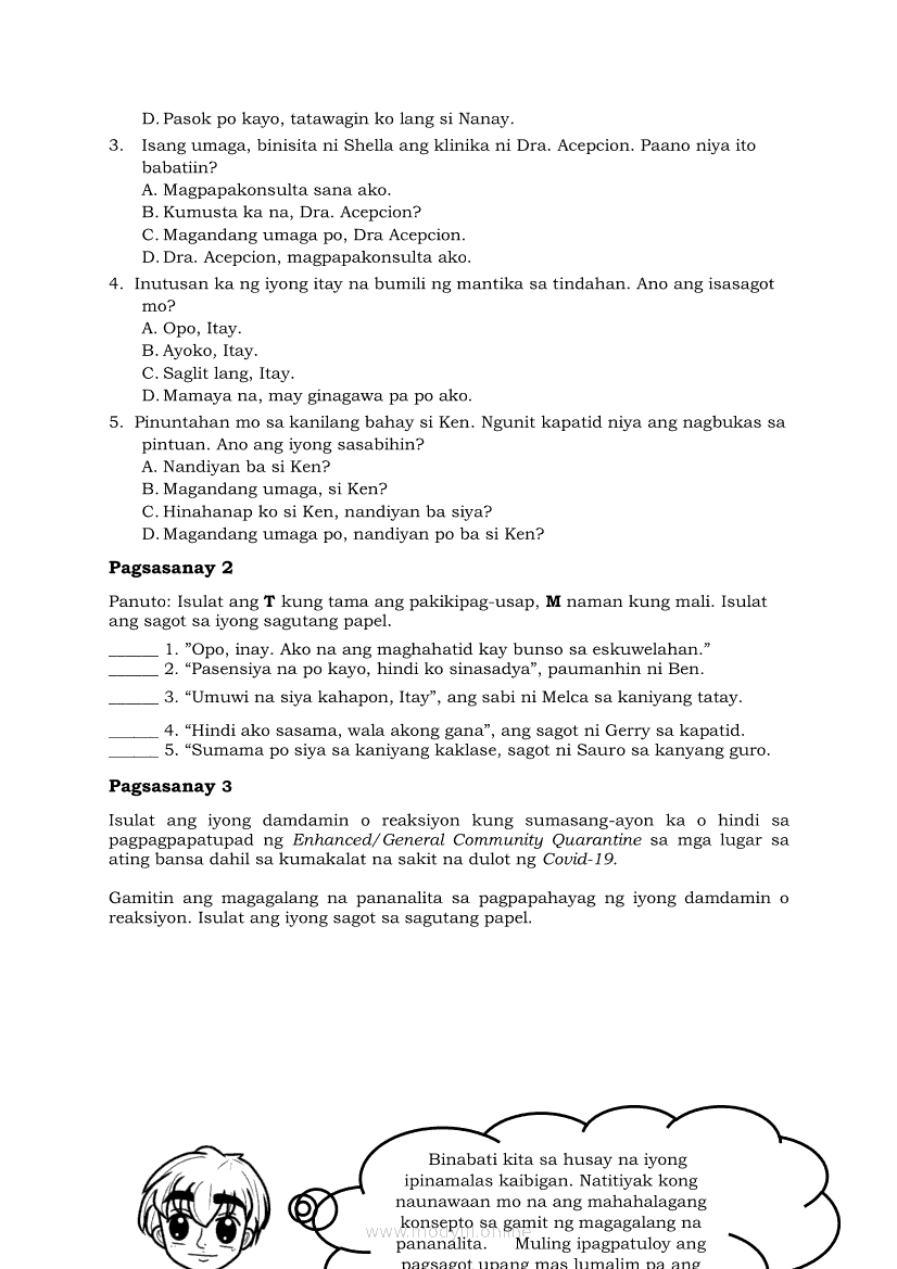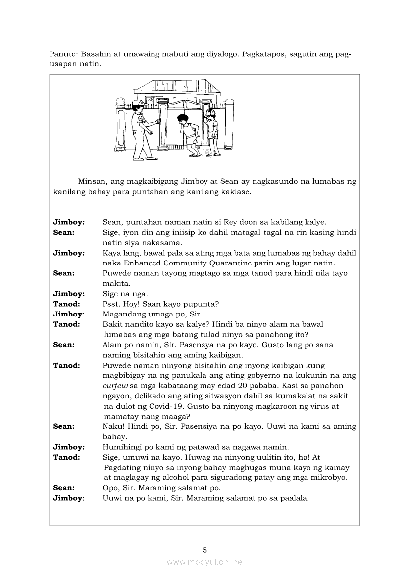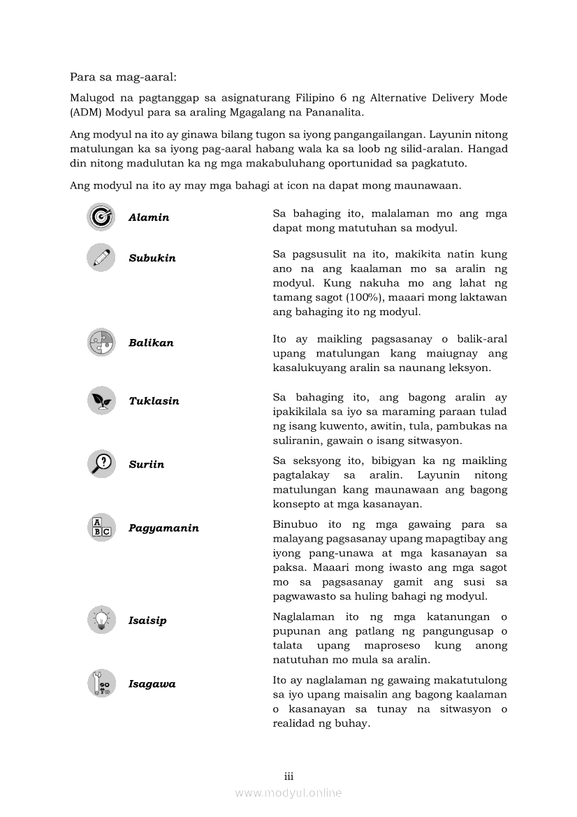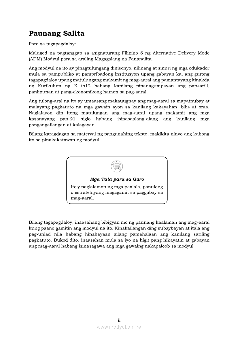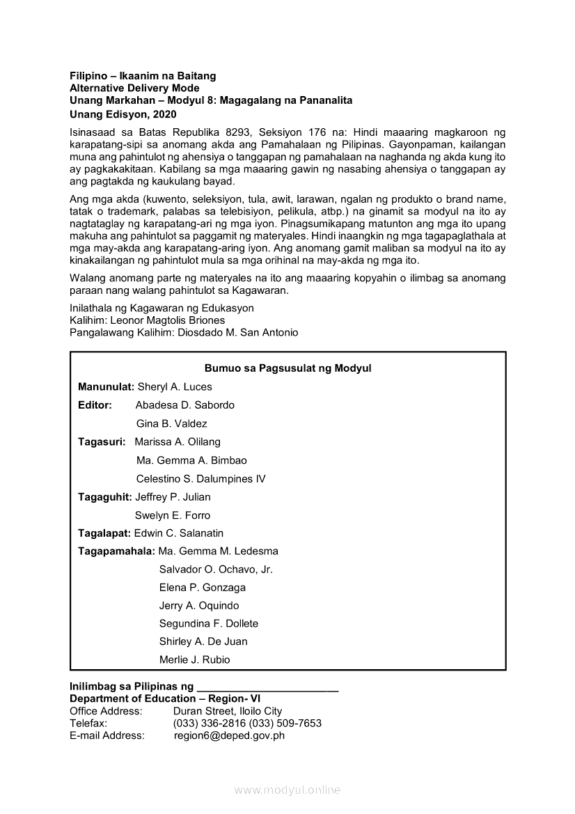 Filipino 6 Modyul 8: Magagalang na PananalitaApr 22, 2021 Grade 6Kiumo M901 Tablet for Kids — comprehensive protection in learning, safety, and entertainment for as low as **₱2,399!. Filipino 6RelatedFilipino 6 Ikaapat na Markahan – Modyul 3: Ang Pagkakaiba ng Kathang Isip at Di-Kathang Isip na Teksto (Fiction and Non-Fiction)Filipino 6 Ikaapat na Markahan – Modyul 4: Uri ng PelikulaFilipino 6 Ikaapat na Markahan – Modyul 1: Paggamit ng Pangngalan sa PatalastasFilipino 6 Ika-apat na Markahan – Modyul 2: Salitang MagkakaugnayFilipino 6 Modyul 1: Pagsagot sa mga Tanong Tungkol sa Napakinggan/Nabasang Pabula, Kuwento, Tekstong Pang-Impormasyon at Usapan