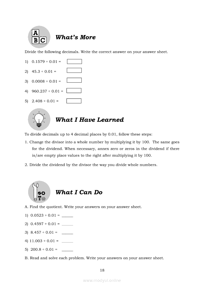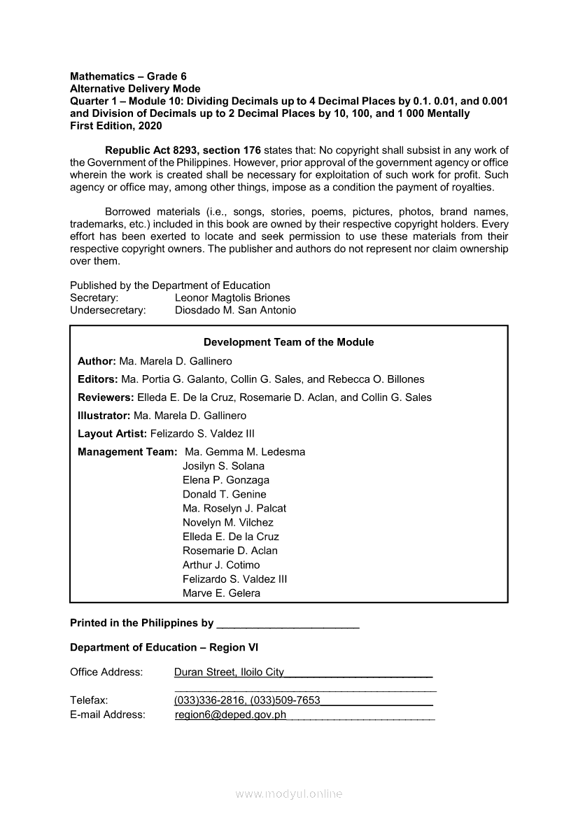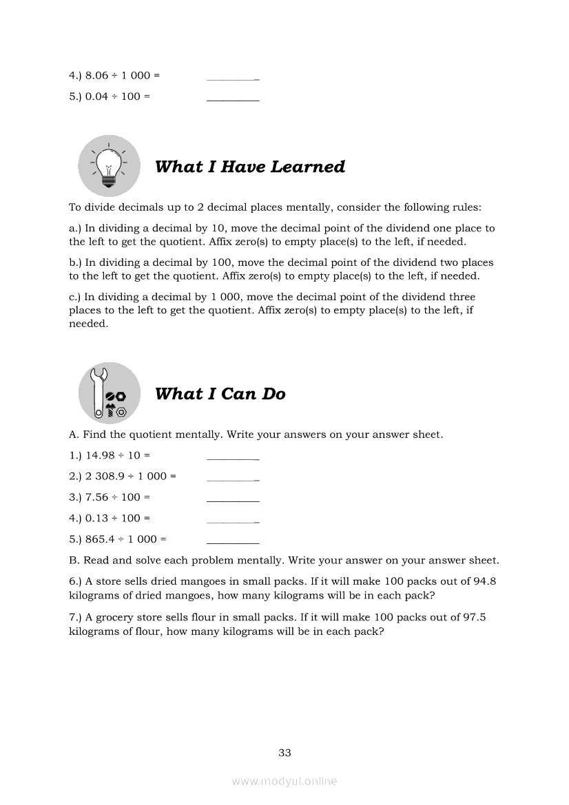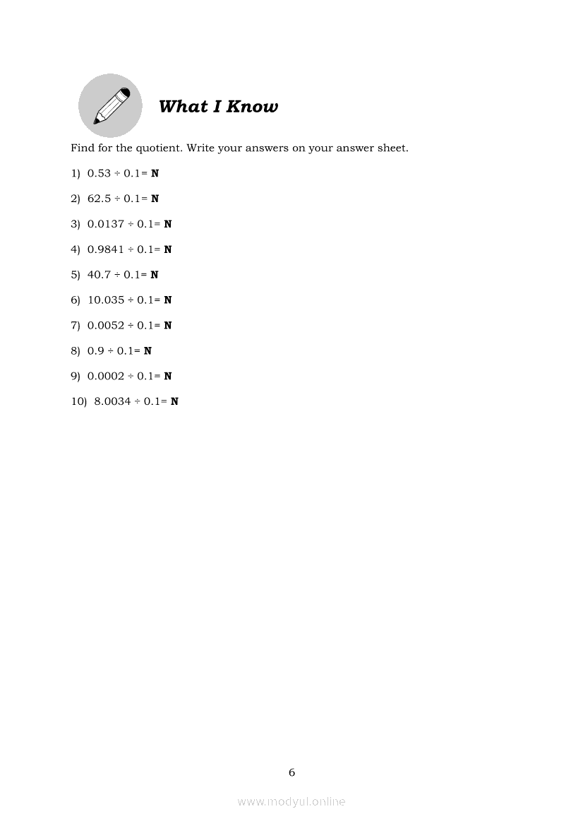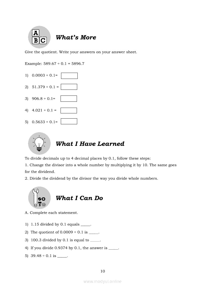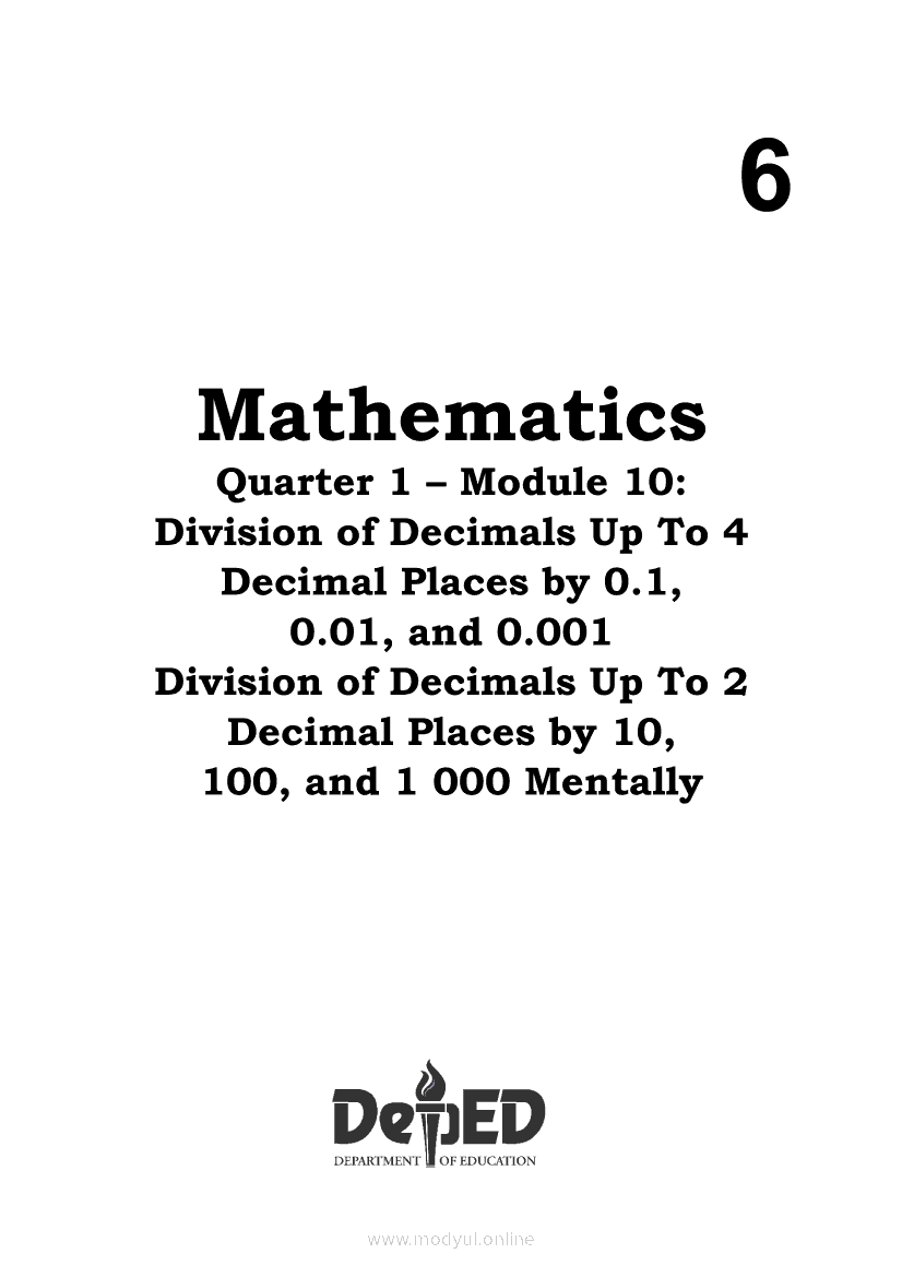 Math 6 Module 10: Division of Decimals Up To 4 Decimal Places By 0.1, 0.01, And 0.001 Division of Decimals Up To 2 Decimal Places By 10, 100, And 1 000 MentallyApr 22, 2021 Grade 6Kiumo M901 Tablet for Kids — comprehensive protection in learning, safety, and entertainment for as low as **₱2,399!. Math 6RelatedMATHEMATICS Quarter 4 – Module 6 Describe the Meaning of Probability Such as 50% Chance of Rain and One in a Million Chance of WinningMATHEMATICS Quarter 4 – Module 7 Making and Telling The Number of Favorable Outcomes and Chances Using Listing and DiagramsMathematics Quarter 4 – Module 3 Solving Routine and Non-Routine Problems Involving Electric and Water ConsumptionMATHEMATICS Quarter 4 – Module 4 Constructing and Interpreting a Pie GraphMATHEMATICS Quarter 4 – Module 5 Solving Word Problems using Data Presented in a Pie Graph