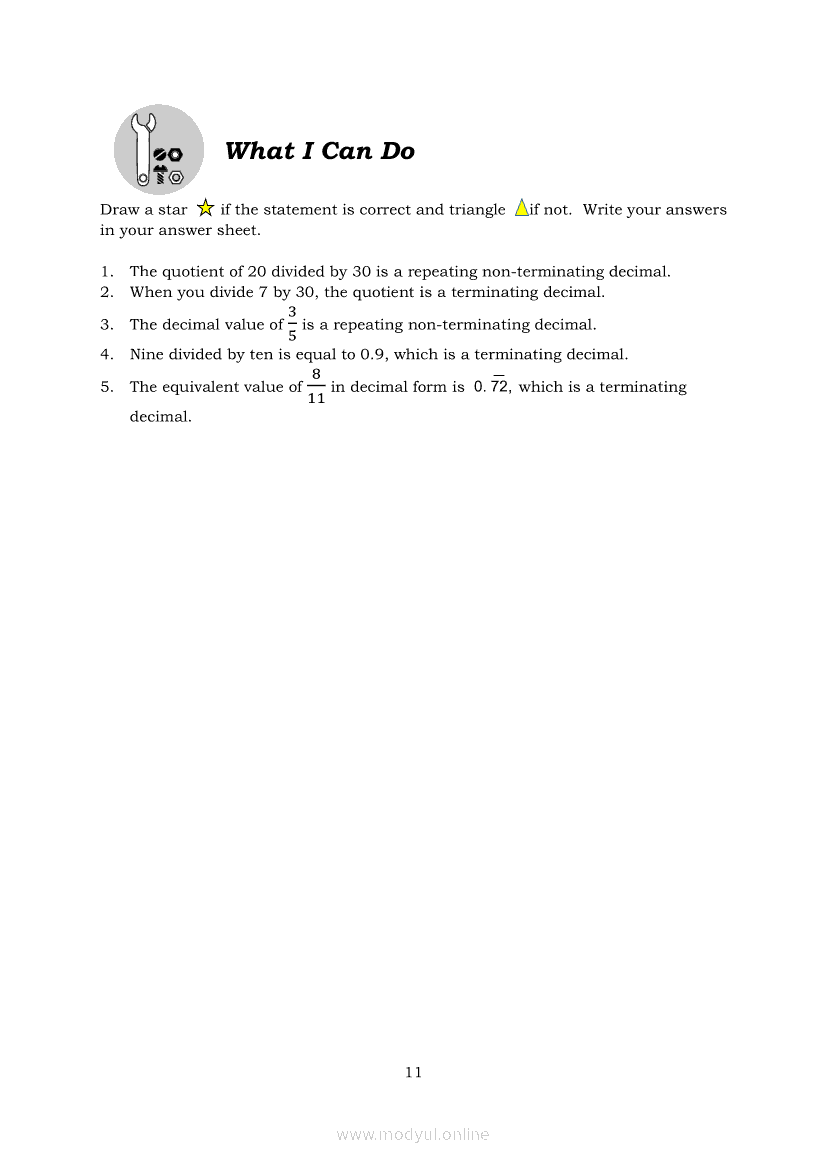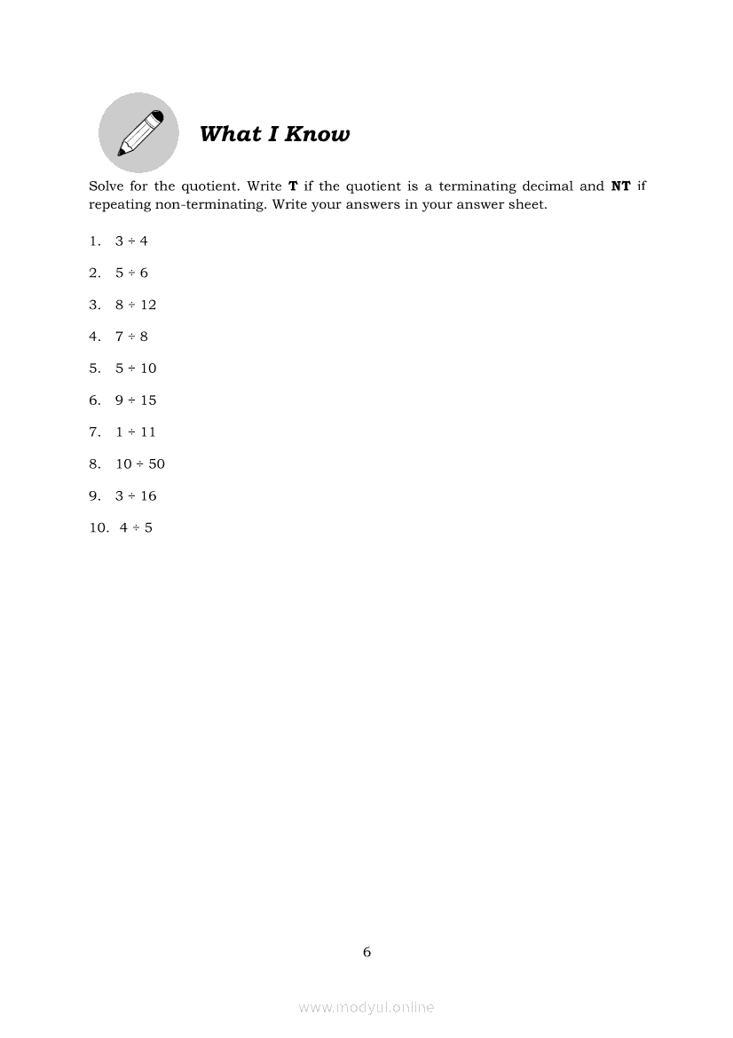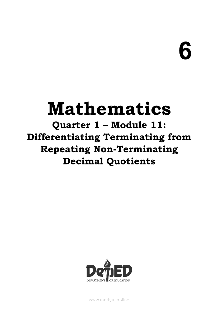 Math 6 Module 11: Differentiating Terminating from Repeating Non-Terminating Decimal QuotientsApr 22, 2021 Grade 6Kiumo M901 Tablet for Kids — comprehensive protection in learning, safety, and entertainment for as low as **₱2,399!. Math 6RelatedMATHEMATICS Quarter 4 – Module 4 Constructing and Interpreting a Pie GraphMATHEMATICS Quarter 4 – Module 5 Solving Word Problems using Data Presented in a Pie GraphMathematics Quarter 4 – Module 3 Solving Routine and Non-Routine Problems Involving Electric and Water ConsumptionMATHEMATICS Quarter 4 – Module 8 Making Simple Predictions of Events and Solving Problems Involving Experimental and Theoretical ProbabilityMATHEMATICS Quarter 4 – Module 7 Making and Telling The Number of Favorable Outcomes and Chances Using Listing and Diagrams