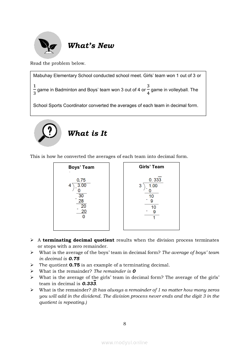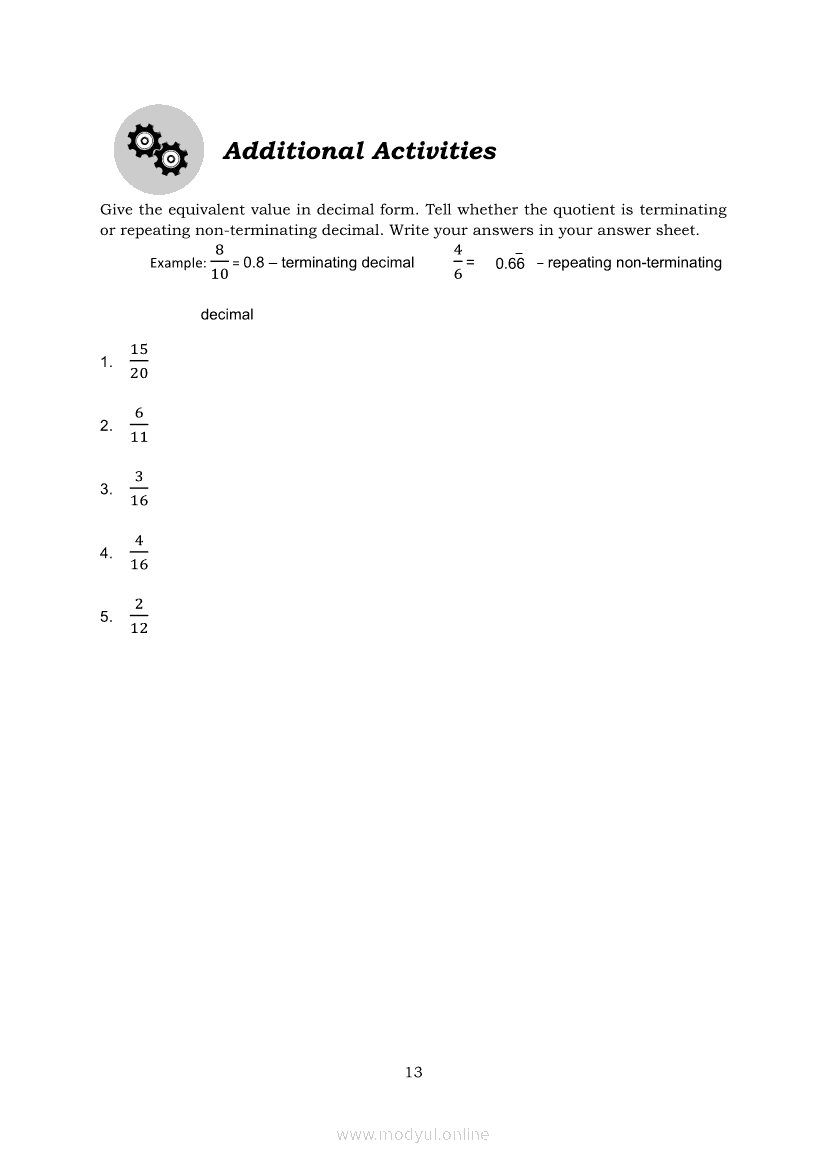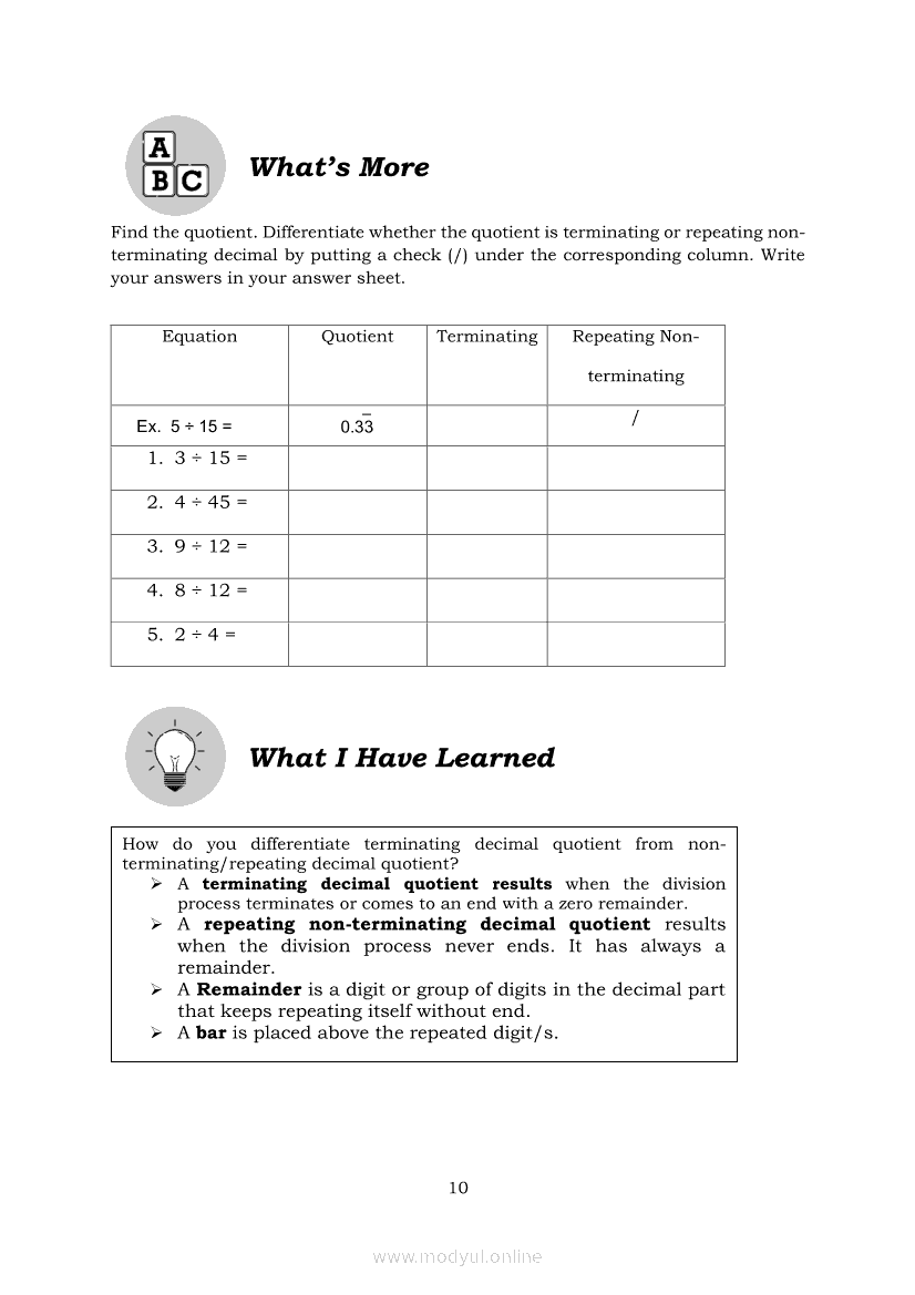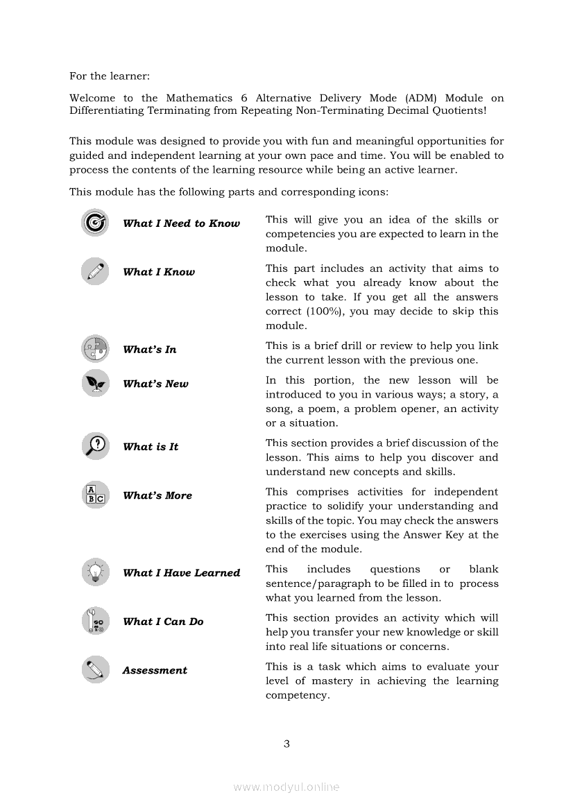 Math 6 Module 11: Differentiating Terminating from Repeating Non-Terminating Decimal QuotientsApr 22, 2021 Grade 6Kiumo M901 Tablet for Kids — comprehensive protection in learning, safety, and entertainment for as low as **₱2,399!. Math 6RelatedMATHEMATICS Quarter 4 – Module 4 Constructing and Interpreting a Pie GraphMATHEMATICS Quarter 4 – Module 5 Solving Word Problems using Data Presented in a Pie GraphMathematics Quarter 4 – Module 3 Solving Routine and Non-Routine Problems Involving Electric and Water ConsumptionMATHEMATICS Quarter 4 – Module 8 Making Simple Predictions of Events and Solving Problems Involving Experimental and Theoretical ProbabilityMATHEMATICS Quarter 4 – Module 7 Making and Telling The Number of Favorable Outcomes and Chances Using Listing and Diagrams