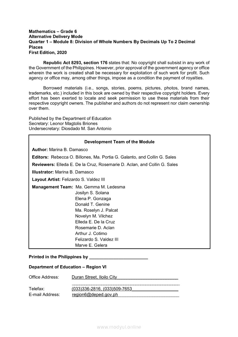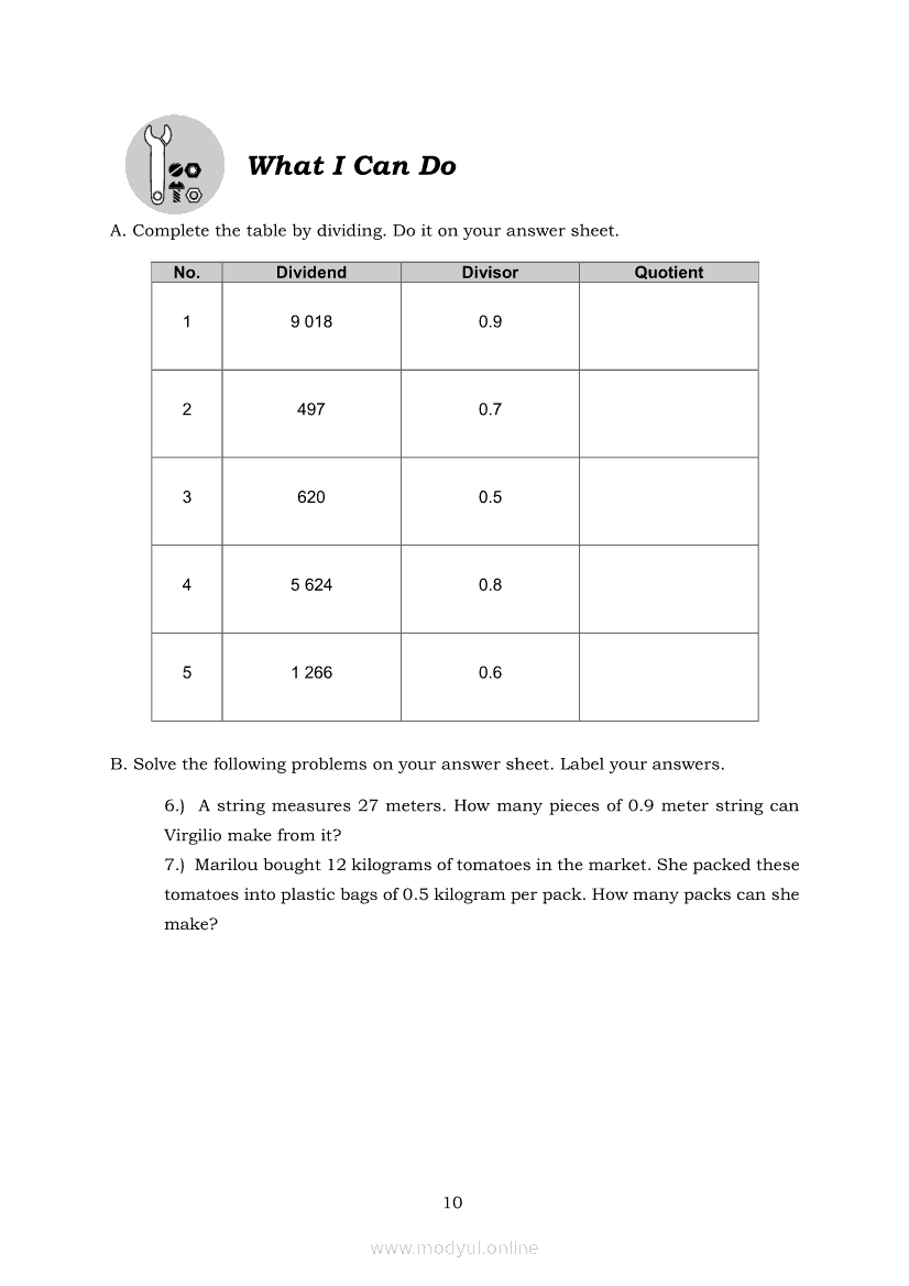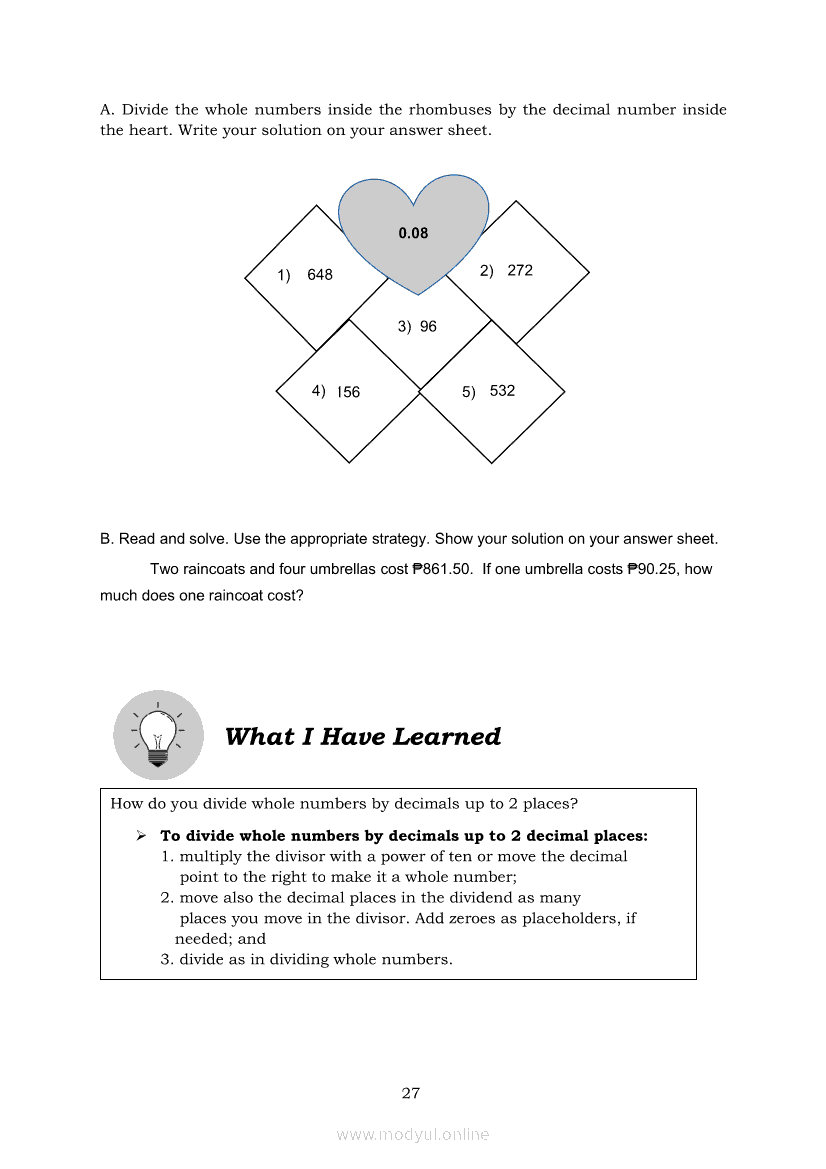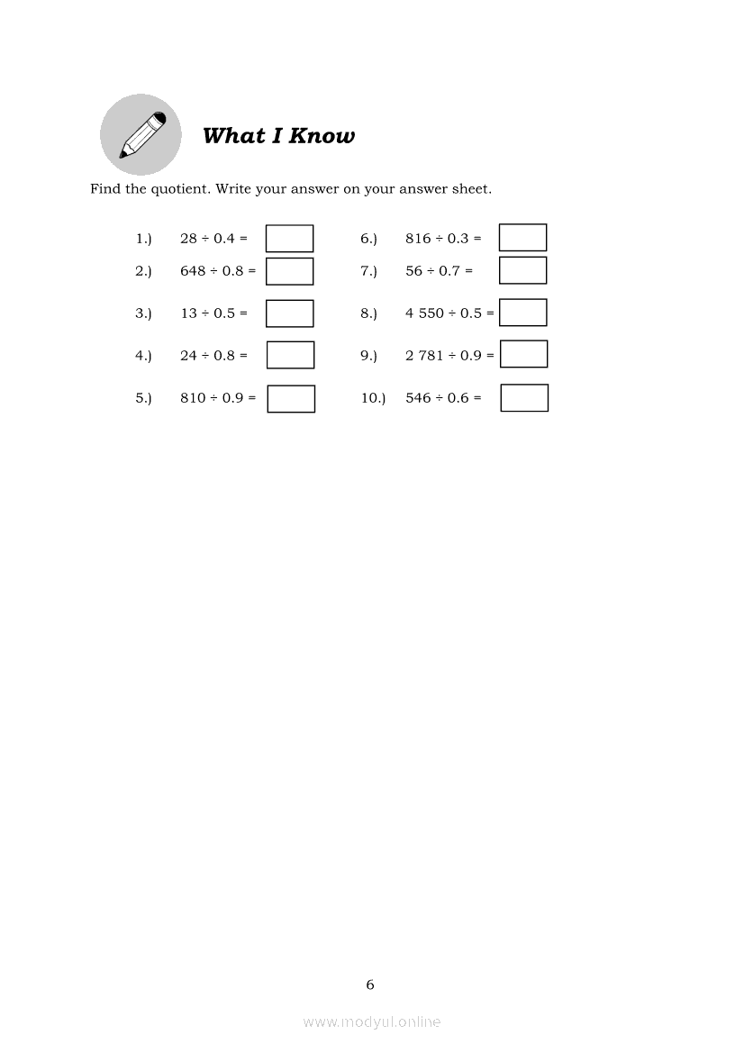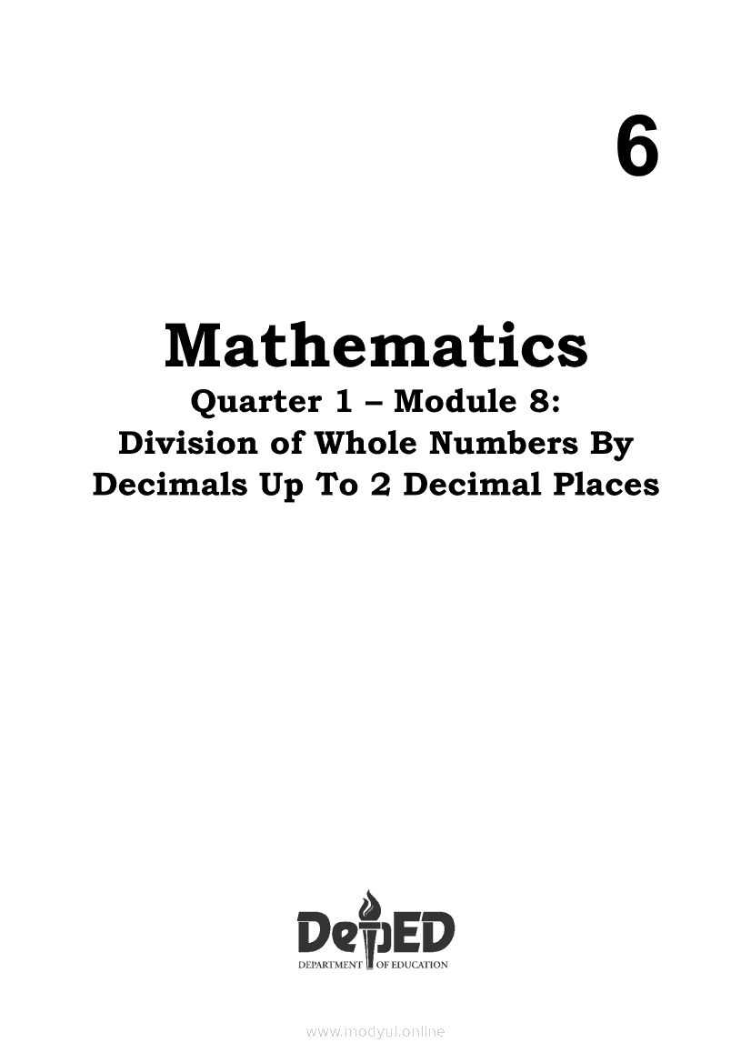 Math 6 Module 8: Division of Whole Numbers By Decimals Up To 2 Decimal PlacesApr 22, 2021 Grade 6Kiumo M901 Tablet for Kids — comprehensive protection in learning, safety, and entertainment for as low as **₱2,399!. Math 6RelatedMATHEMATICS Quarter 4 – Module 4 Constructing and Interpreting a Pie GraphMATHEMATICS Quarter 4 – Module 7 Making and Telling The Number of Favorable Outcomes and Chances Using Listing and DiagramsMATHEMATICS Quarter 4 – Module 8 Making Simple Predictions of Events and Solving Problems Involving Experimental and Theoretical ProbabilityMathematics Quarter 4 – Module 3 Solving Routine and Non-Routine Problems Involving Electric and Water ConsumptionMATHEMATICS Quarter 4 – Module 1 Determining the Relationship of Volume Between a Rectangular Prism and a Pyramid; a Cylinder and a Cone and a Cylinder and a Sphere