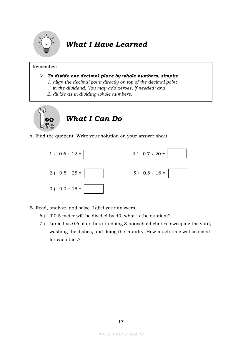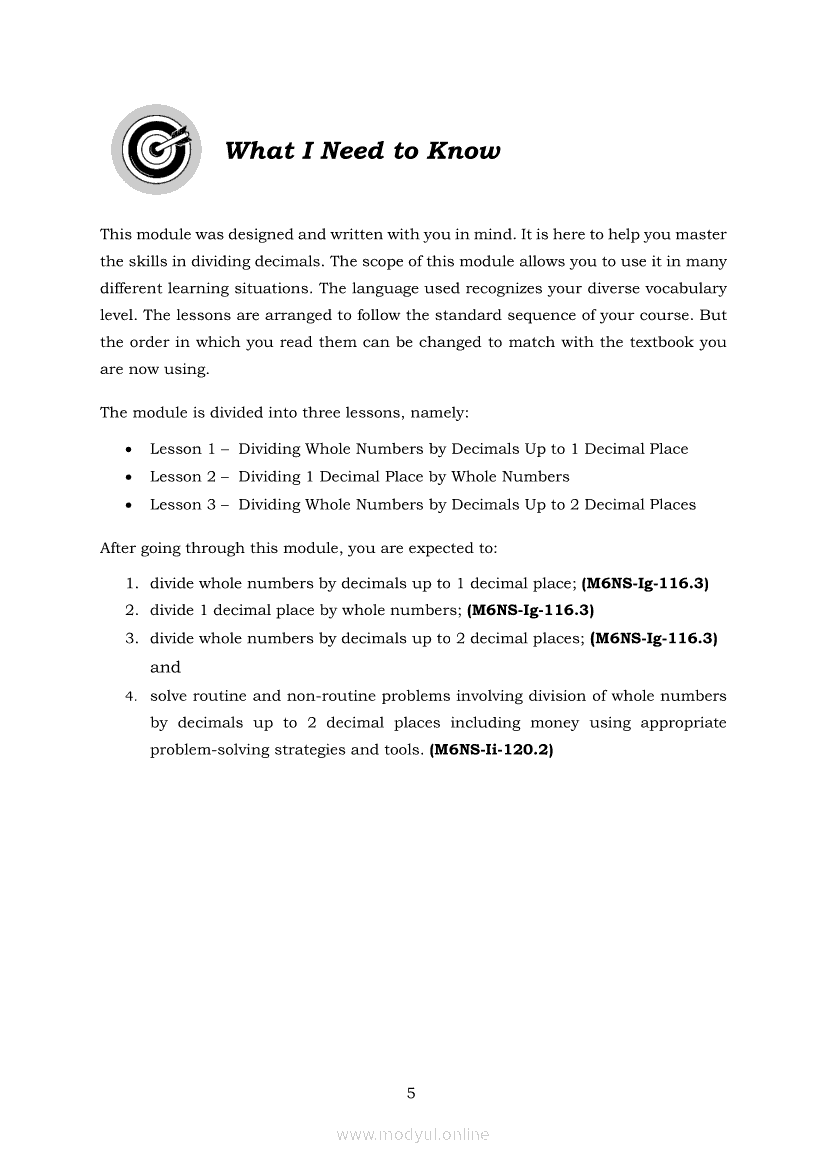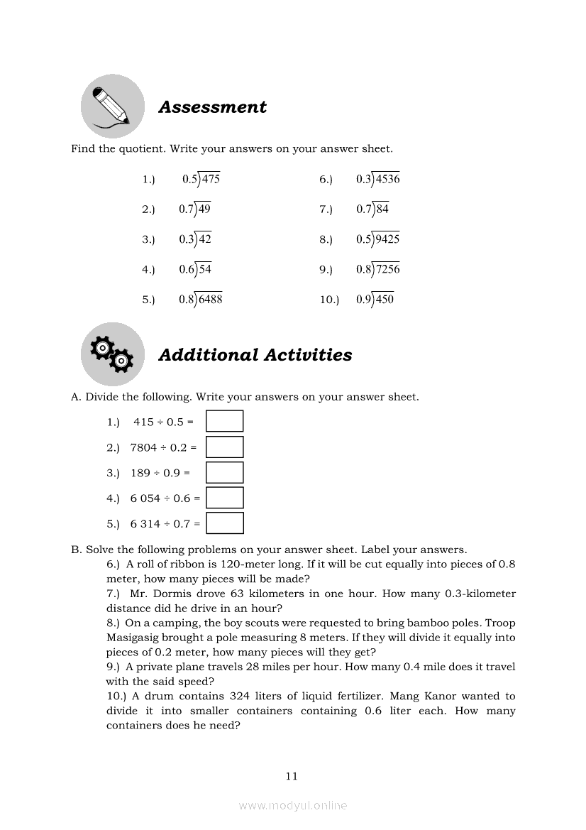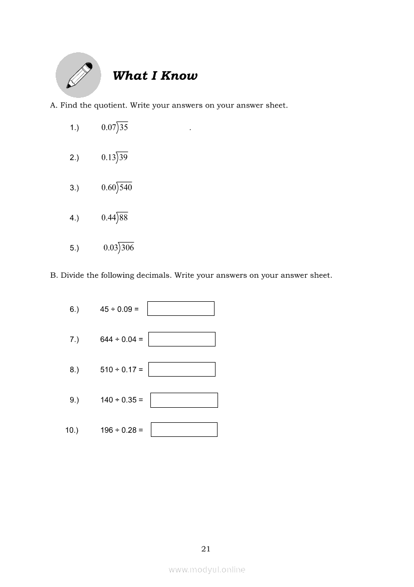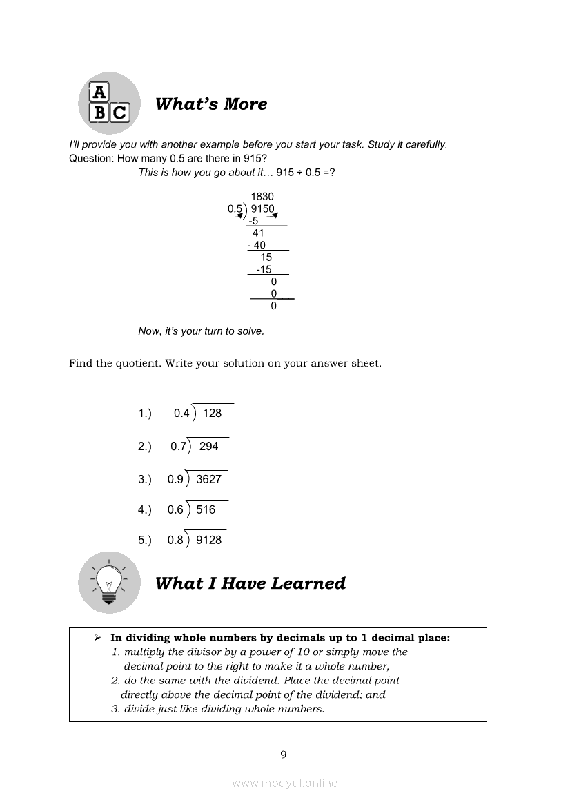 Math 6 Module 8: Division of Whole Numbers By Decimals Up To 2 Decimal PlacesApr 22, 2021 Grade 6Kiumo M901 Tablet for Kids — comprehensive protection in learning, safety, and entertainment for as low as **₱2,399!. Math 6RelatedMATHEMATICS Quarter 4 – Module 4 Constructing and Interpreting a Pie GraphMATHEMATICS Quarter 4 – Module 7 Making and Telling The Number of Favorable Outcomes and Chances Using Listing and DiagramsMATHEMATICS Quarter 4 – Module 8 Making Simple Predictions of Events and Solving Problems Involving Experimental and Theoretical ProbabilityMathematics Quarter 4 – Module 3 Solving Routine and Non-Routine Problems Involving Electric and Water ConsumptionMATHEMATICS Quarter 4 – Module 1 Determining the Relationship of Volume Between a Rectangular Prism and a Pyramid; a Cylinder and a Cone and a Cylinder and a Sphere