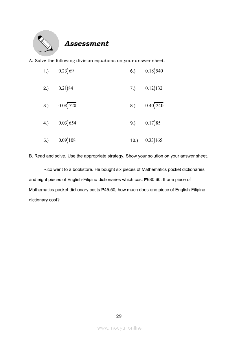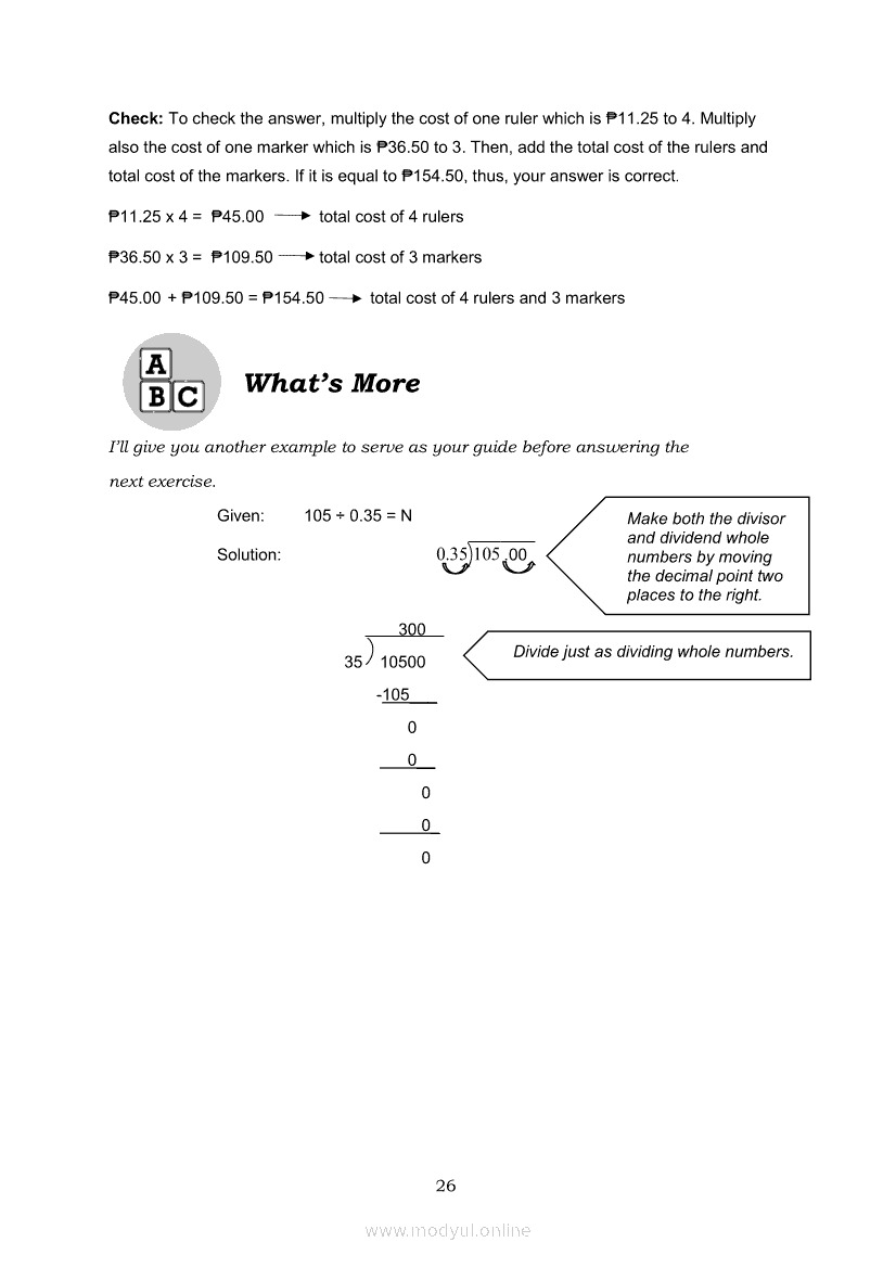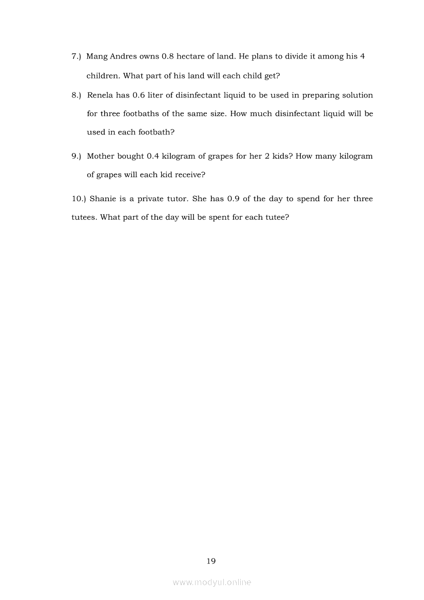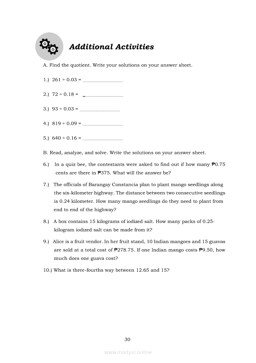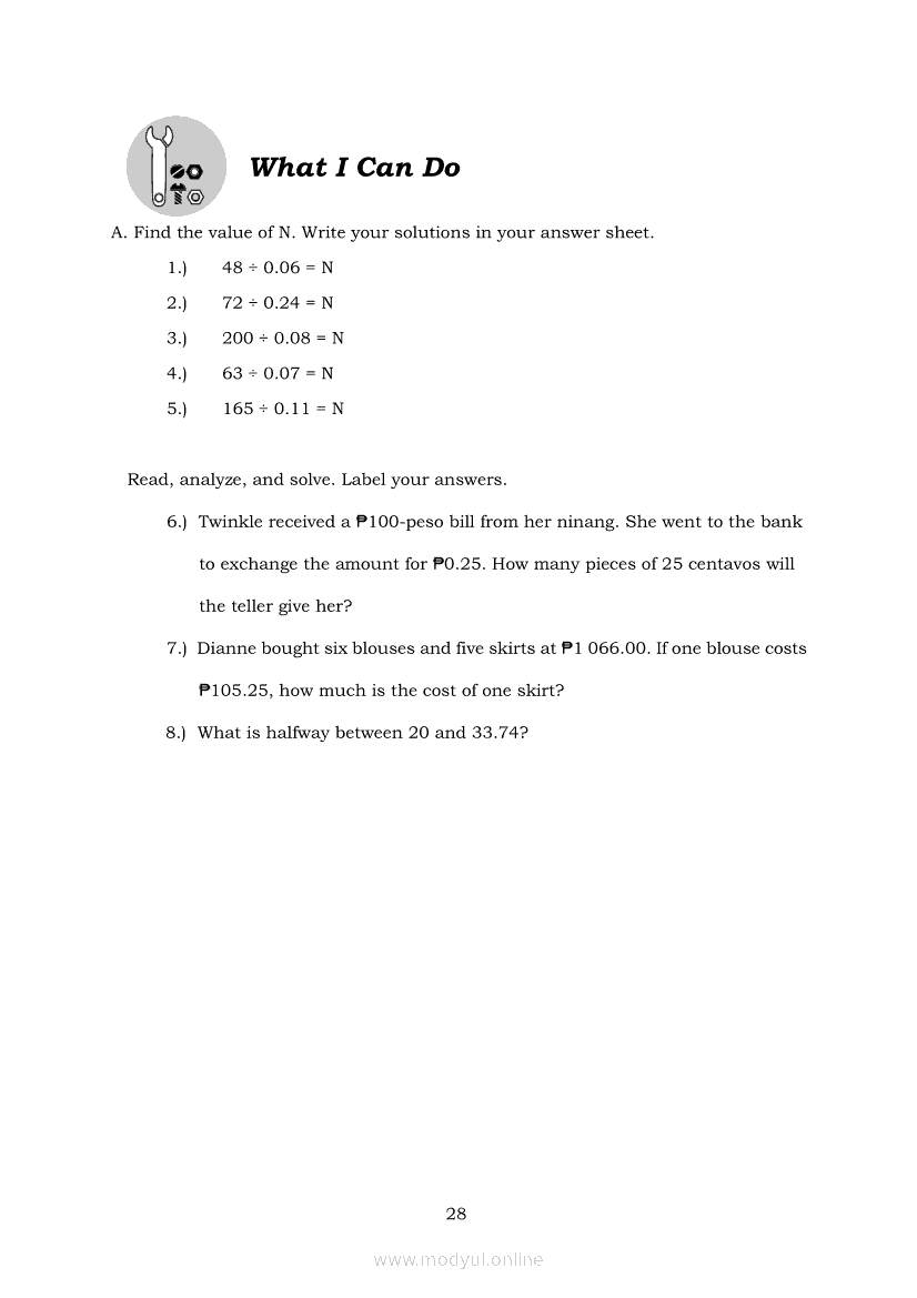 Math 6 Module 8: Division of Whole Numbers By Decimals Up To 2 Decimal PlacesApr 22, 2021 Grade 6Kiumo M901 Tablet for Kids — comprehensive protection in learning, safety, and entertainment for as low as **₱2,399!. Math 6RelatedMATHEMATICS Quarter 4 – Module 4 Constructing and Interpreting a Pie GraphMATHEMATICS Quarter 4 – Module 7 Making and Telling The Number of Favorable Outcomes and Chances Using Listing and DiagramsMATHEMATICS Quarter 4 – Module 8 Making Simple Predictions of Events and Solving Problems Involving Experimental and Theoretical ProbabilityMathematics Quarter 4 – Module 3 Solving Routine and Non-Routine Problems Involving Electric and Water ConsumptionMATHEMATICS Quarter 4 – Module 1 Determining the Relationship of Volume Between a Rectangular Prism and a Pyramid; a Cylinder and a Cone and a Cylinder and a Sphere