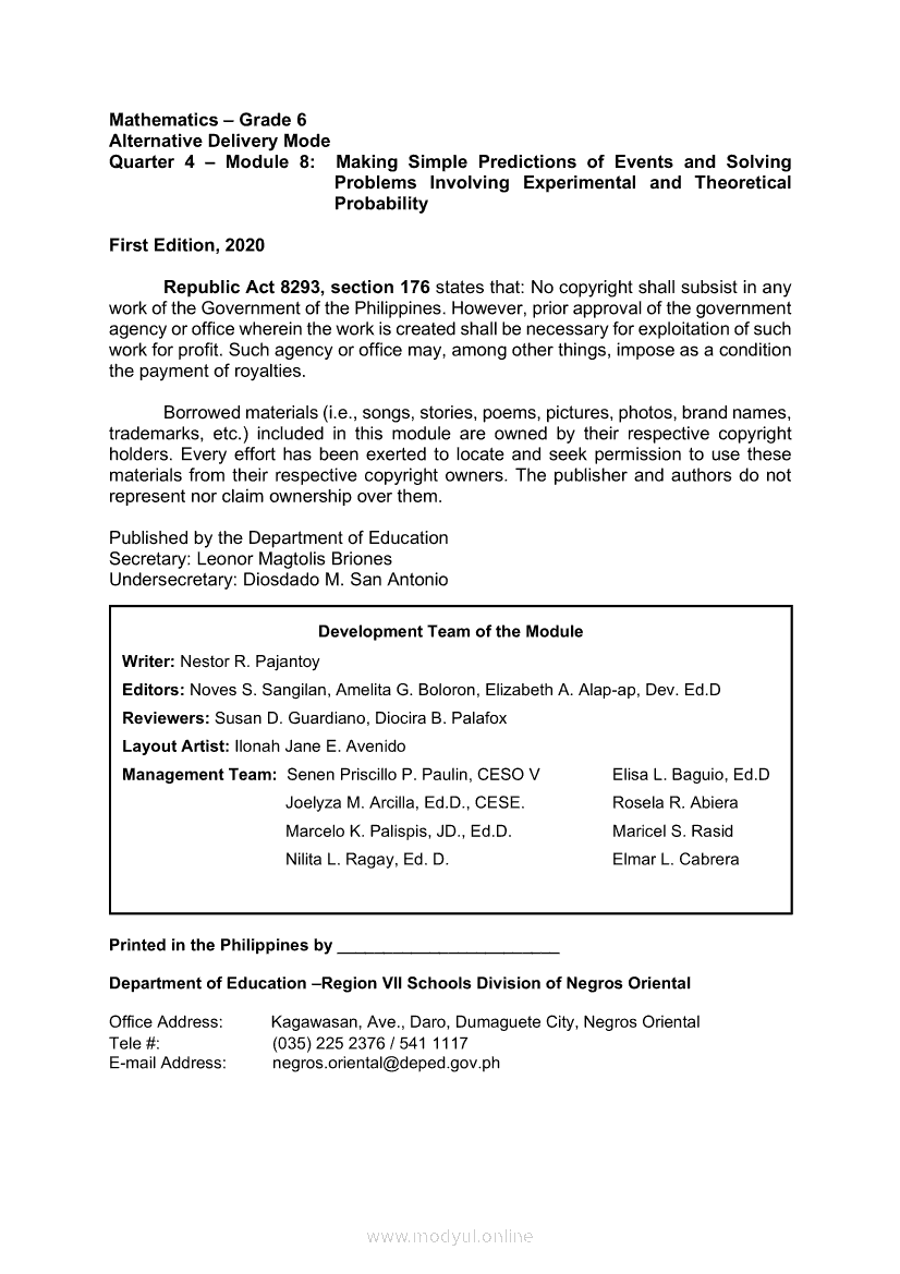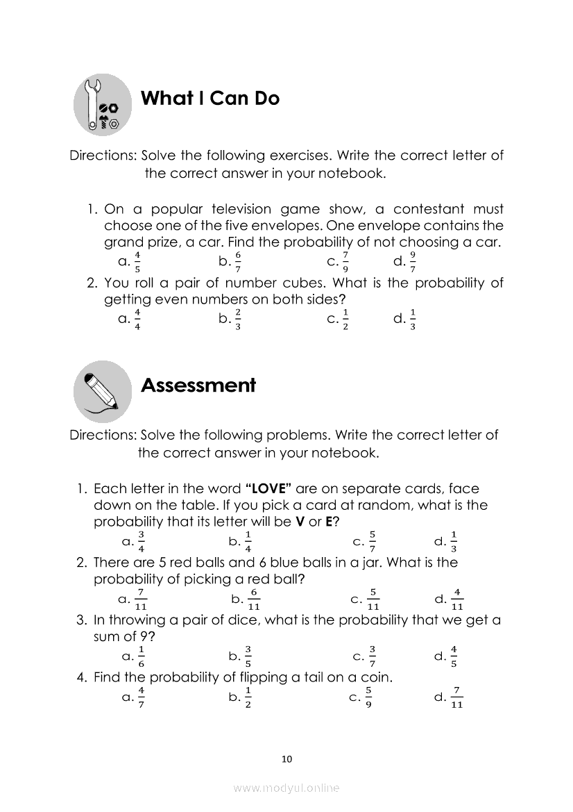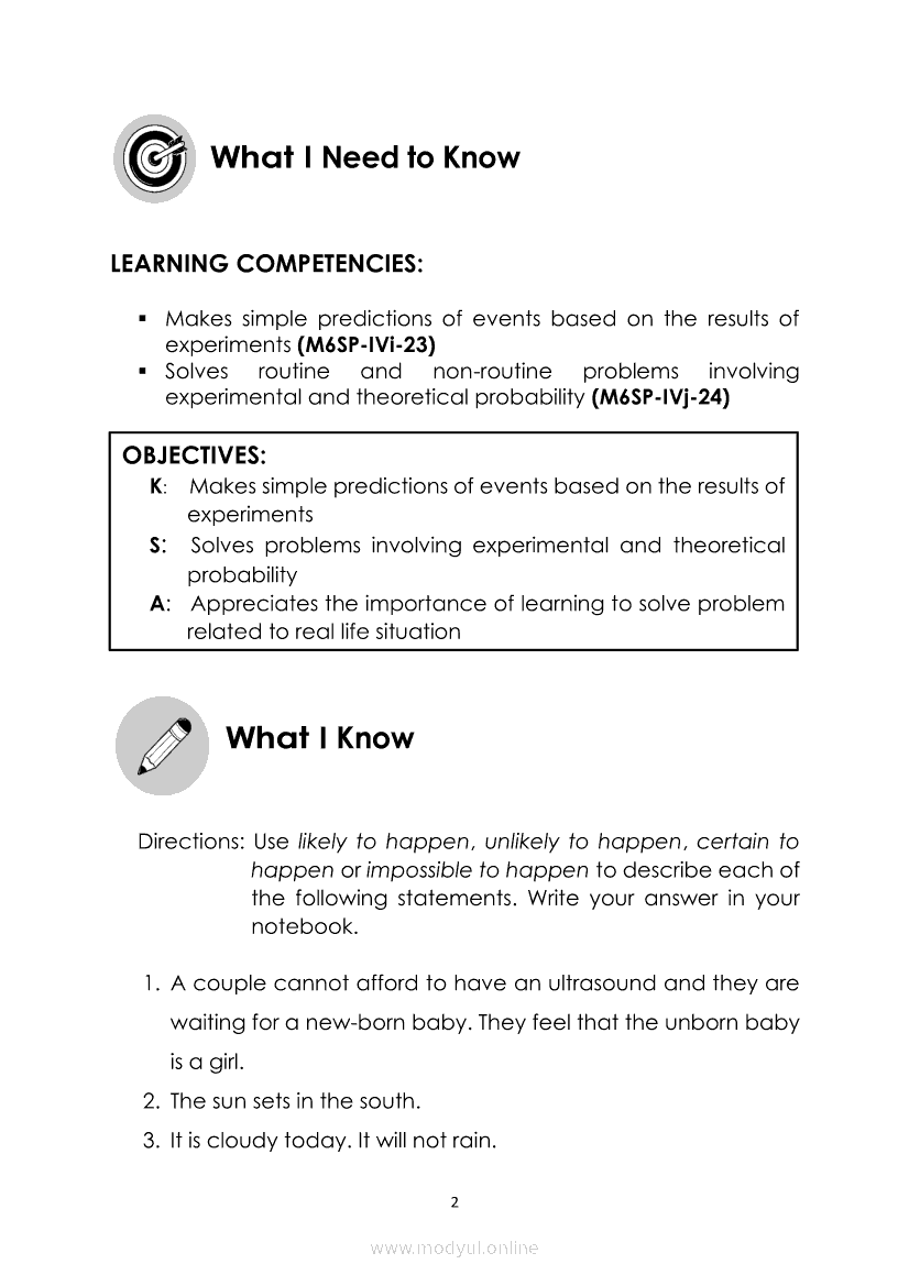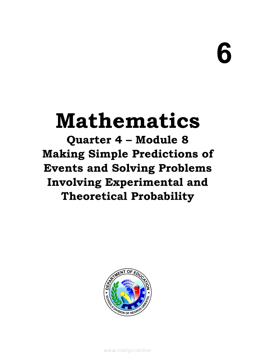 MATHEMATICS Quarter 4 – Module 8 Making Simple Predictions of Events and Solving Problems Involving Experimental and Theoretical ProbabilityMay 27, 2021 Grade 6Kiumo M901 Tablet for Kids — comprehensive protection in learning, safety, and entertainment for as low as **₱2,399!. Math 6 4th QuarterRelatedMATHEMATICS Quarter 4 – Module 6 Describe the Meaning of Probability Such as 50% Chance of Rain and One in a Million Chance of WinningMATHEMATICS Quarter 4 – Module 2 Solving Problems Involving Volume of Pyramids, Cones, Cylinders, and SpheresMATHEMATICS Quarter 4 – Module 1 Determining the Relationship of Volume Between a Rectangular Prism and a Pyramid; a Cylinder and a Cone and a Cylinder and a SphereMATHEMATICS Quarter 4 – Module 5 Solving Word Problems using Data Presented in a Pie GraphMathematics Quarter 4 – Module 3 Solving Routine and Non-Routine Problems Involving Electric and Water Consumption