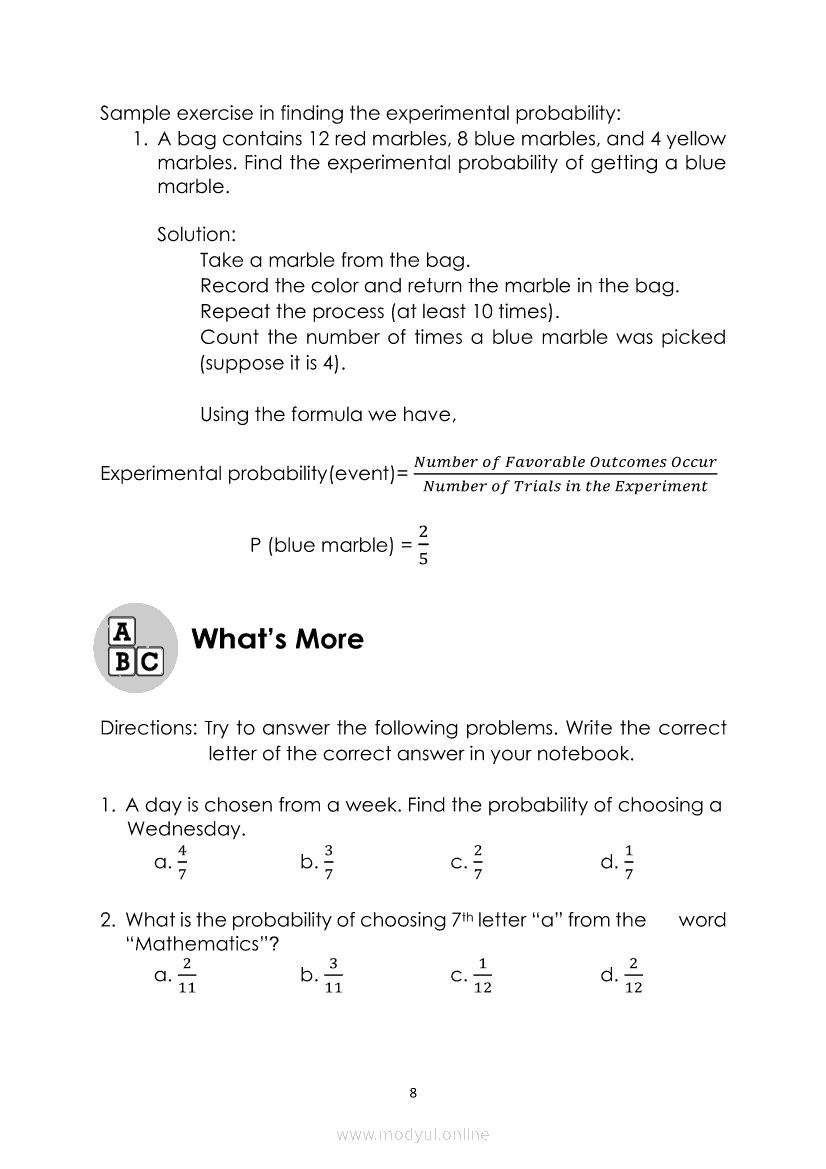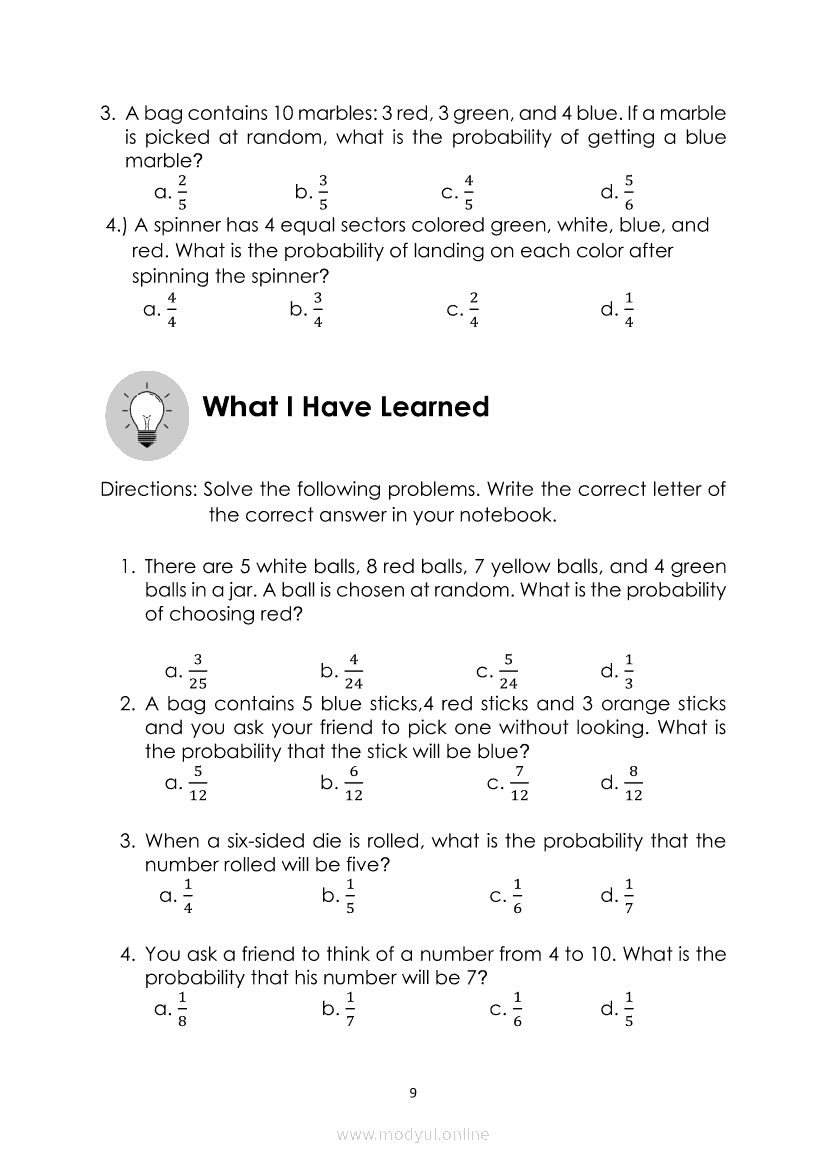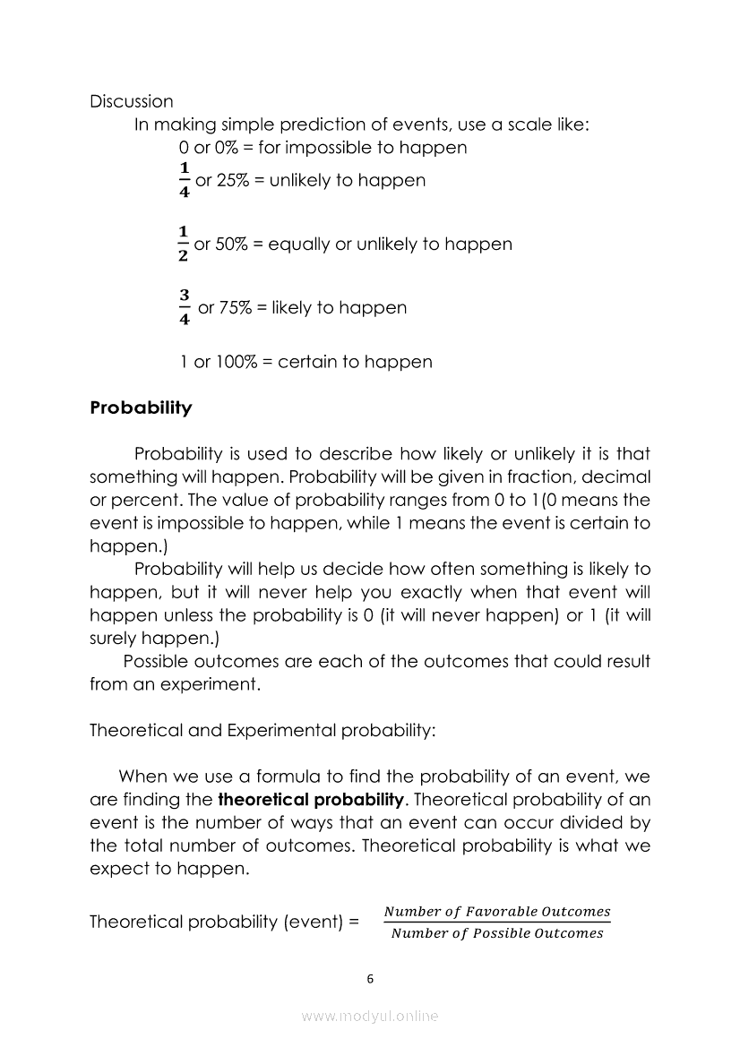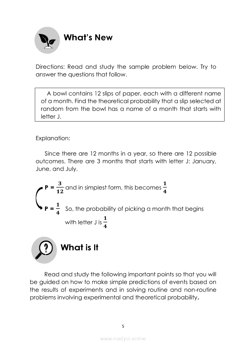 MATHEMATICS Quarter 4 – Module 8 Making Simple Predictions of Events and Solving Problems Involving Experimental and Theoretical ProbabilityMay 27, 2021 Grade 6Kiumo M901 Tablet for Kids — comprehensive protection in learning, safety, and entertainment for as low as **₱2,399!. Math 6 4th QuarterRelatedMATHEMATICS Quarter 4 – Module 6 Describe the Meaning of Probability Such as 50% Chance of Rain and One in a Million Chance of WinningMATHEMATICS Quarter 4 – Module 2 Solving Problems Involving Volume of Pyramids, Cones, Cylinders, and SpheresMATHEMATICS Quarter 4 – Module 1 Determining the Relationship of Volume Between a Rectangular Prism and a Pyramid; a Cylinder and a Cone and a Cylinder and a SphereMATHEMATICS Quarter 4 – Module 5 Solving Word Problems using Data Presented in a Pie GraphMathematics Quarter 4 – Module 3 Solving Routine and Non-Routine Problems Involving Electric and Water Consumption