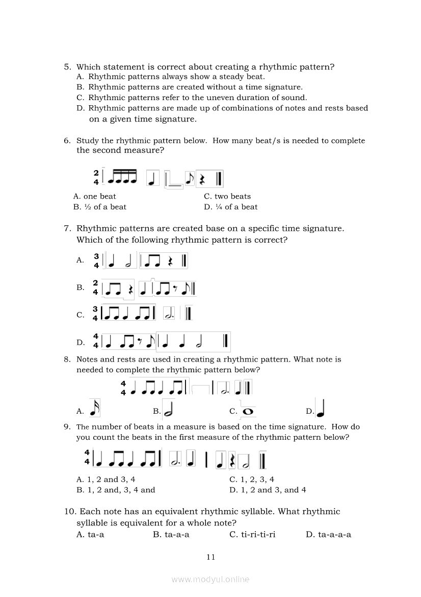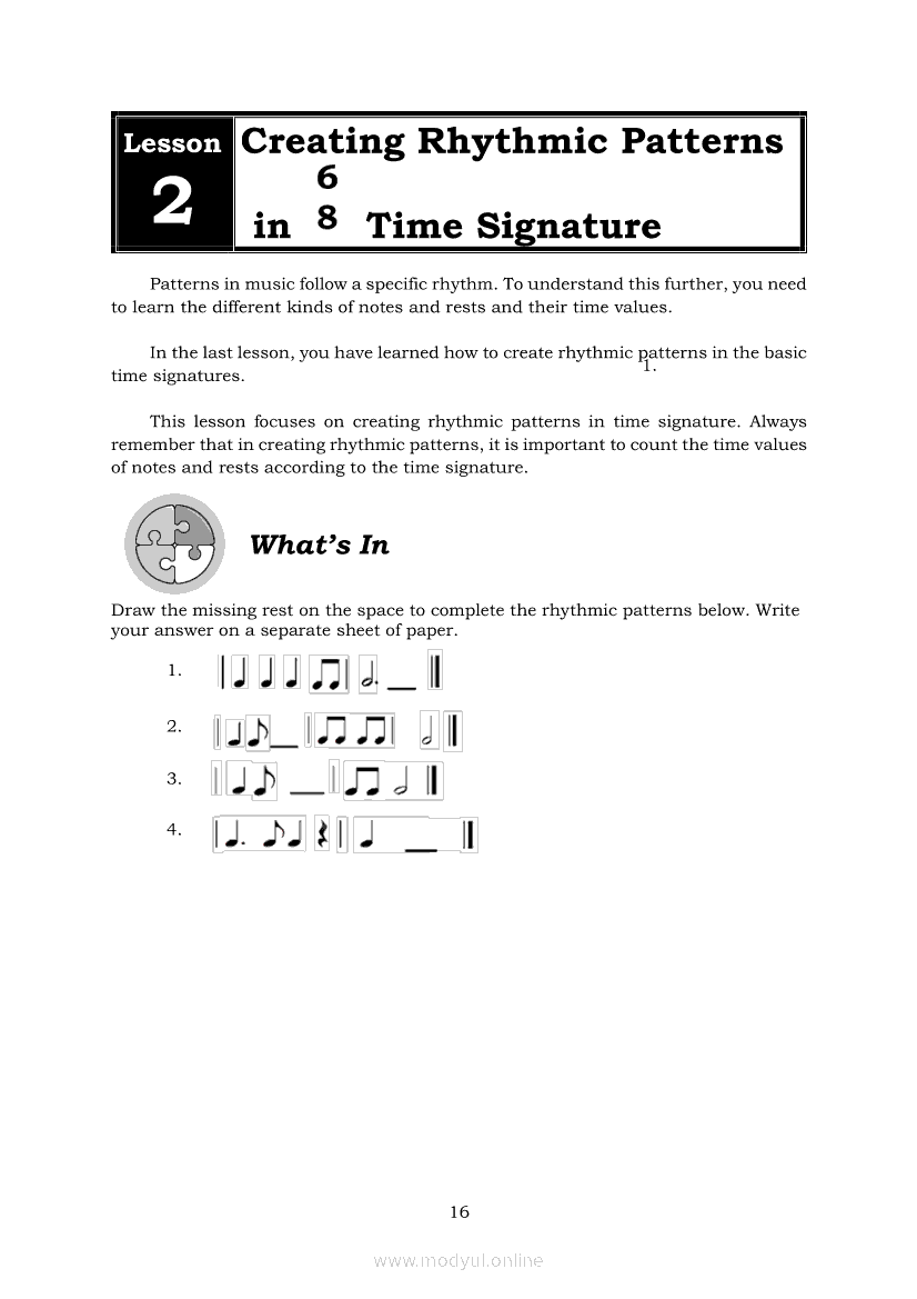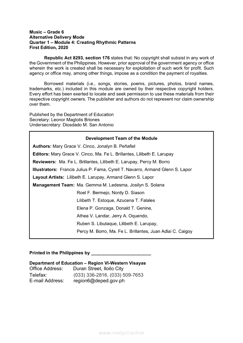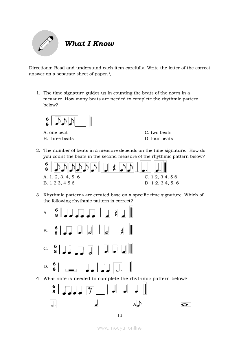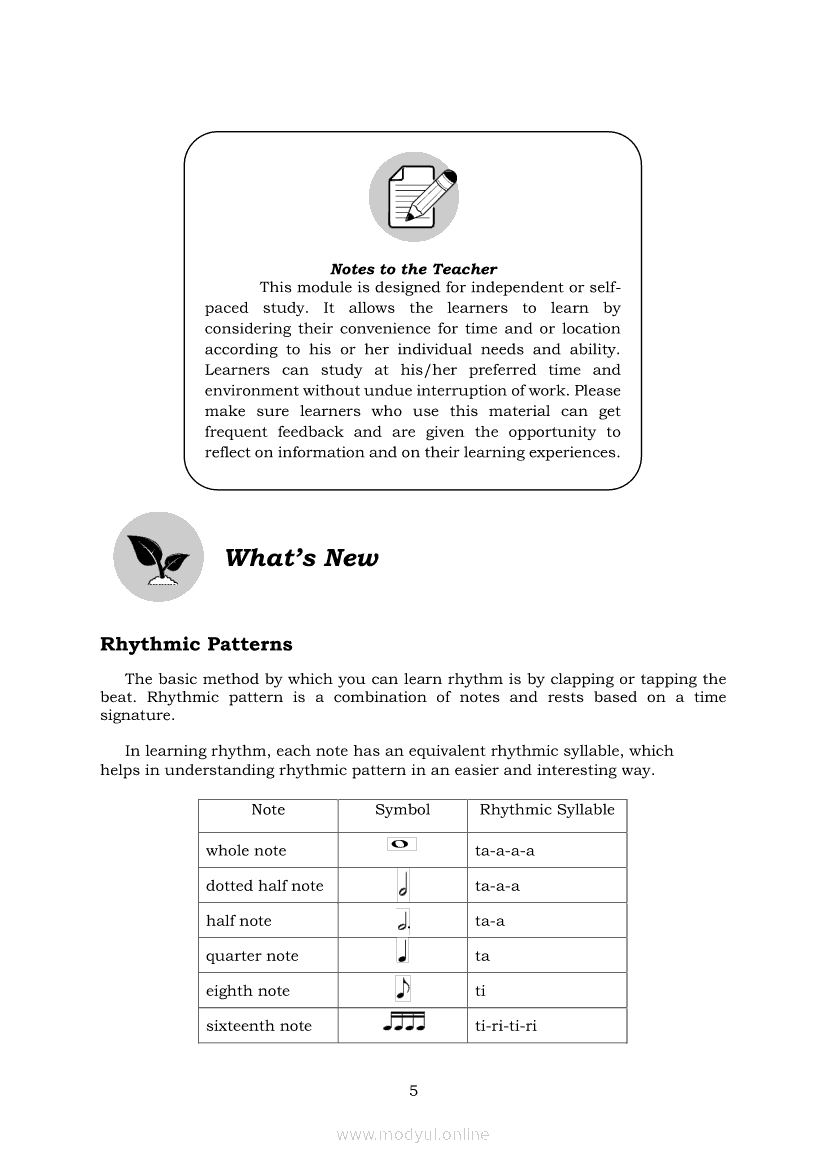 Music 6 Module 4: Creating Rhythmic PatternsApr 22, 2021 Grade 6Kiumo M901 Tablet for Kids — comprehensive protection in learning, safety, and entertainment for as low as **₱2,399!. Music 6RelatedMUSIC Quarter 4 – Module 4a: Tempo and TextureMUSIC Quarter 4 – Module 4b: Appreciating Music Through Texture and HarmonyMusic 6 Module 1: Rhythm: Notes and RestsMusic 6 Module 2: Rhythm: Differentiate Time SignaturesMusic 6 Module 3: Rhythm: Conduct Time Signatures