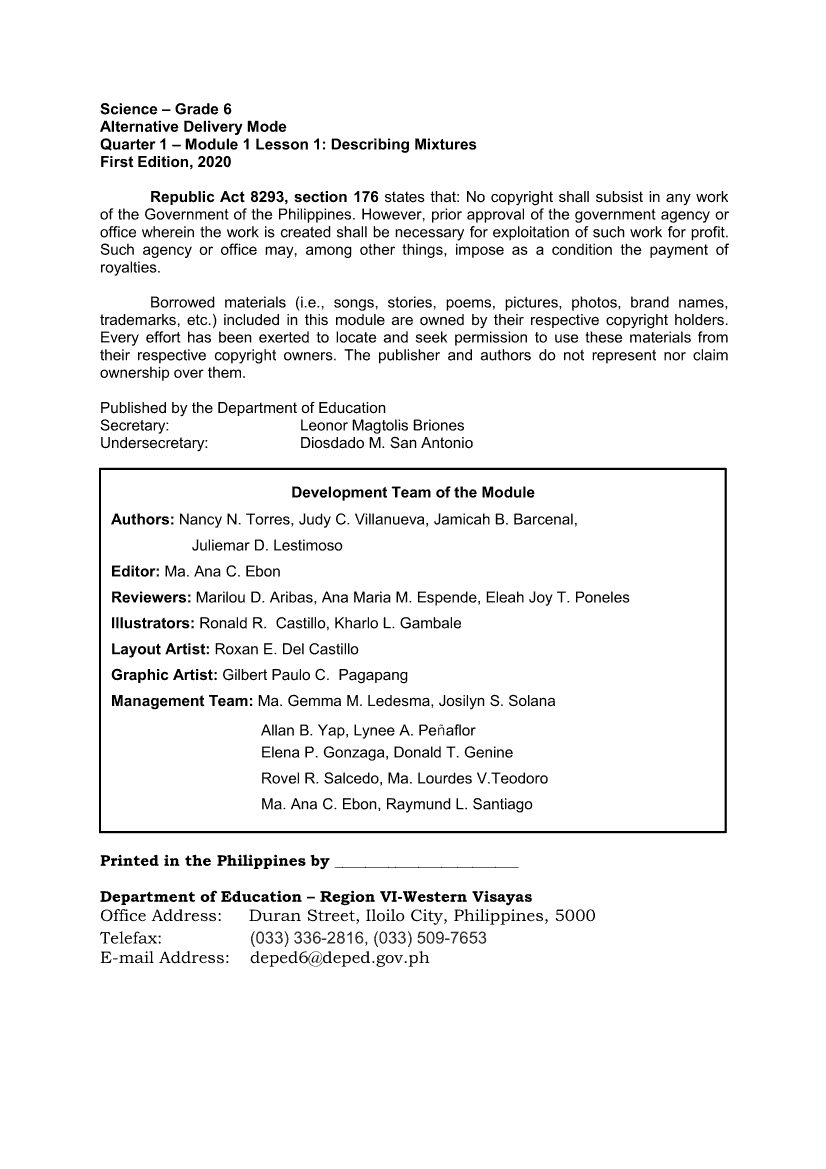Science 6 Module 1 - Lesson 1: Describing MixturesApr 27, 2021 Grade 6Kiumo M901 Tablet for Kids — comprehensive protection in learning, safety, and entertainment for as low as **₱2,399!. Science 6RelatedROTATION AND REVOLUTION OF THE EARTH for Science Grade 6 Quarter 4/Week 4-5THE PLANETS OF THE SOLAR SYSTEM for Science Grade 6 Quarter 4/ Week 6-7WEATHER PATTERNS AND SEASONS IN THE PHILIPPINES for Science 6 Quarter 4/Week 3THE EFFECTS OF EARTHQUAKES AND VOLCANIC ERUPTIONS for Science Grade 6 Quarter 4/ Week 1DISASTER PREPAREDNESS ON EARTHQUAKES AND VOLCANIC ERUPTIONS for Science Grade 6 Quarter 4/ Week 2
